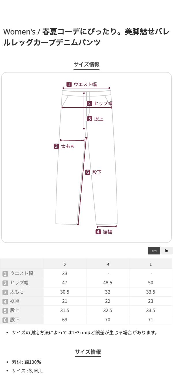L:ウエスト72、ヒップ100、股上33.5、わたり幅33.5、裾幅23、股下71
