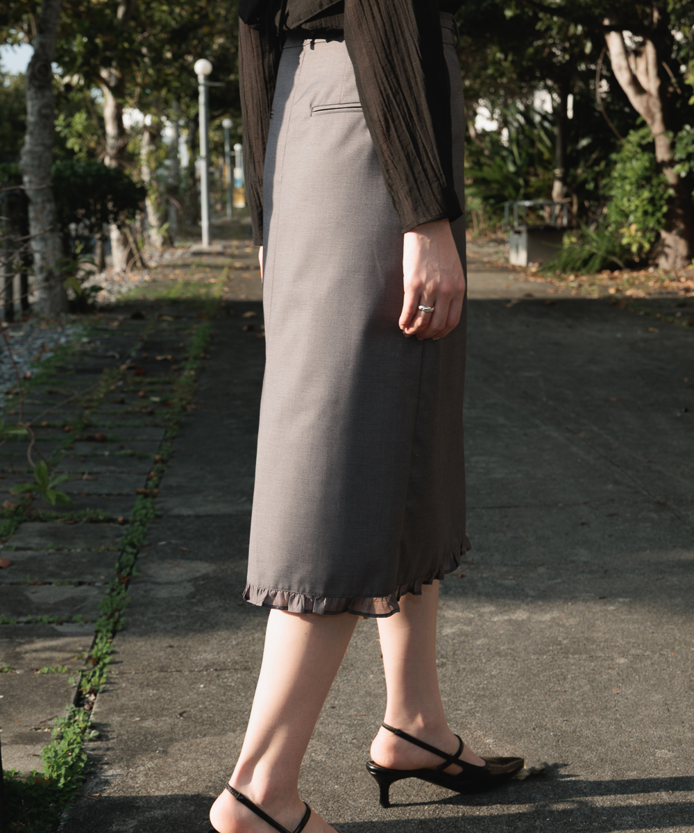 裾にはシフォン素材の繊細なラッフルディテールを加え、動くたびにほのかに揺れるフェミニンなムードを演出します。