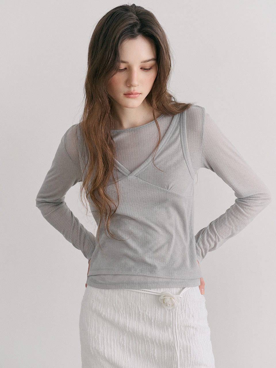 Ribbed Layered T-Shirt SET, Light Grey