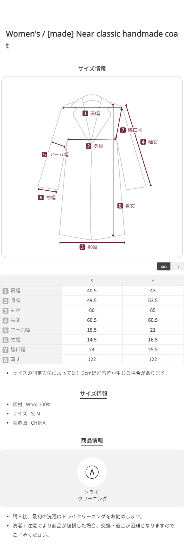 *ブラウス・ジャケットなどボタン付きの商品は、工程上チョーク跡が付く場合がございますが、ウェットティッシュで拭き取っていただけます。