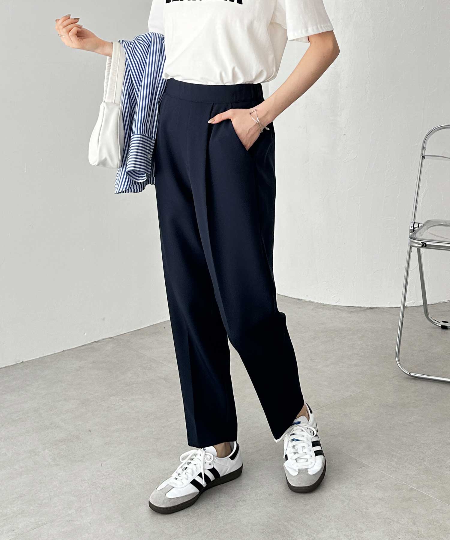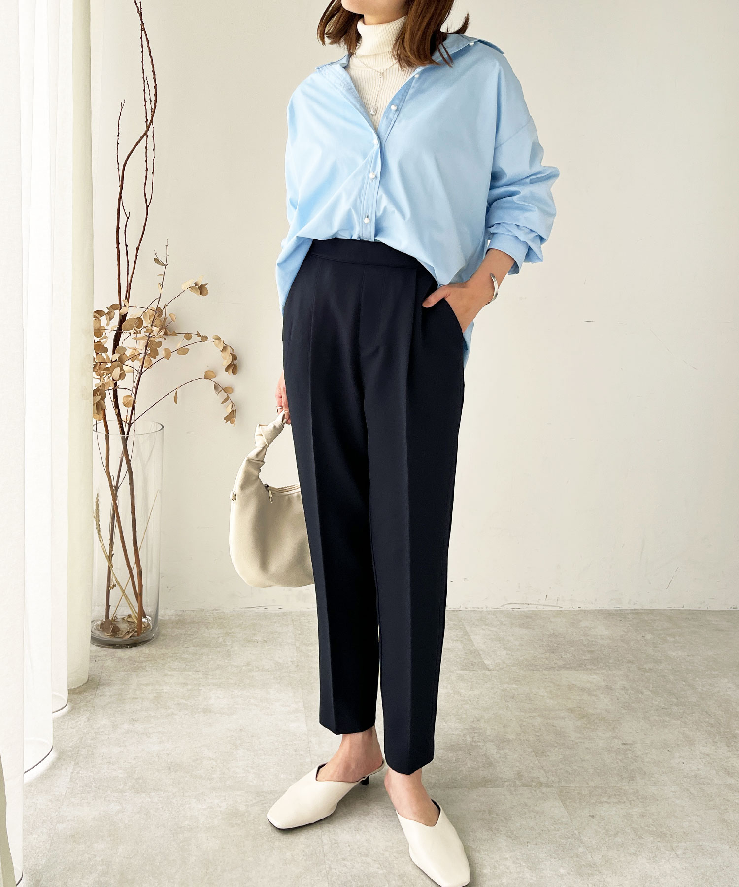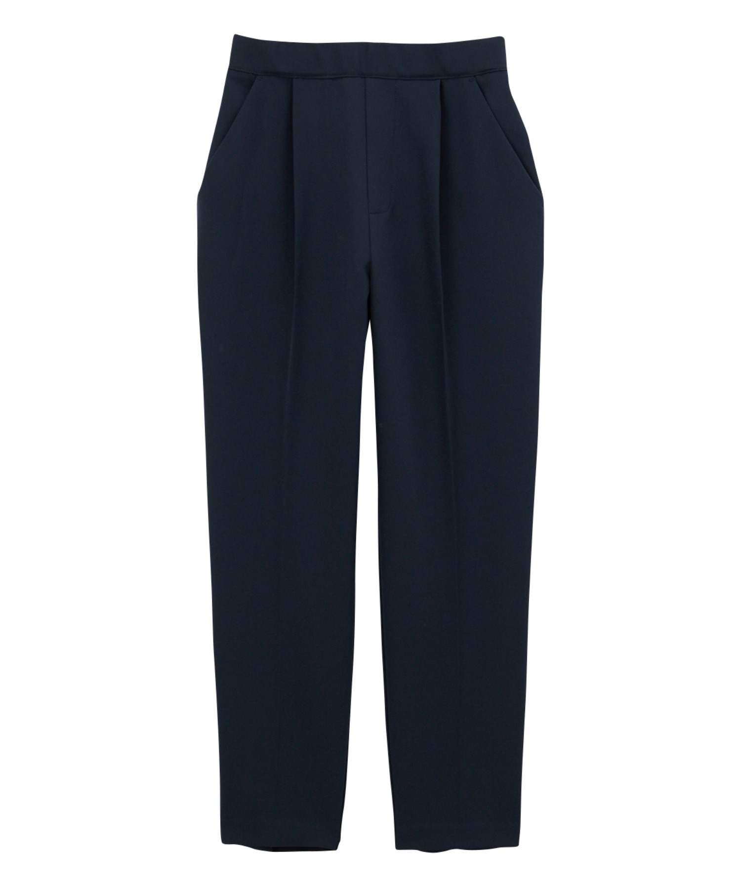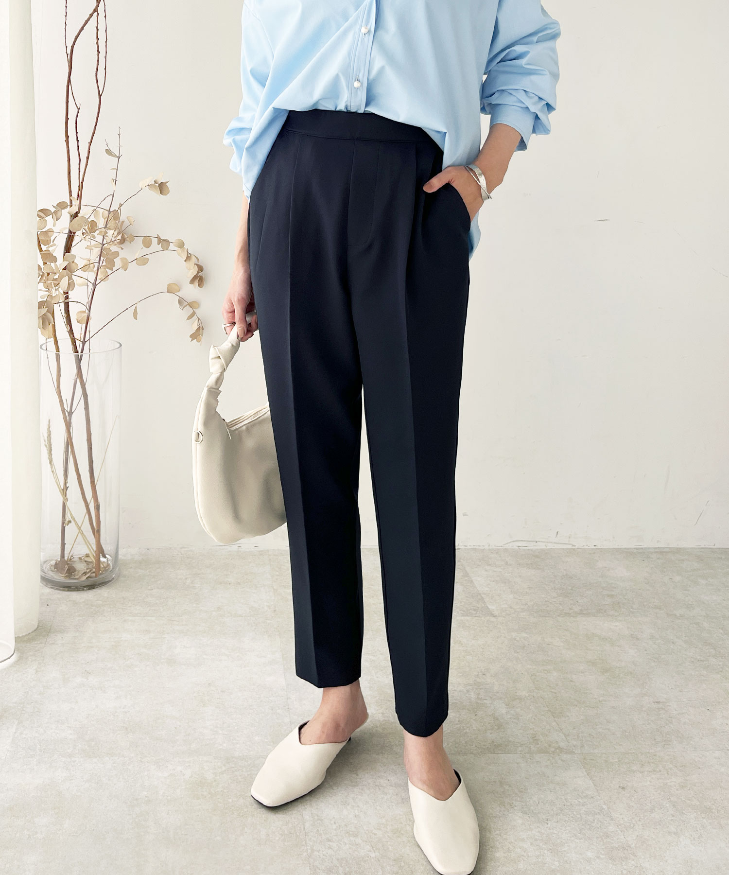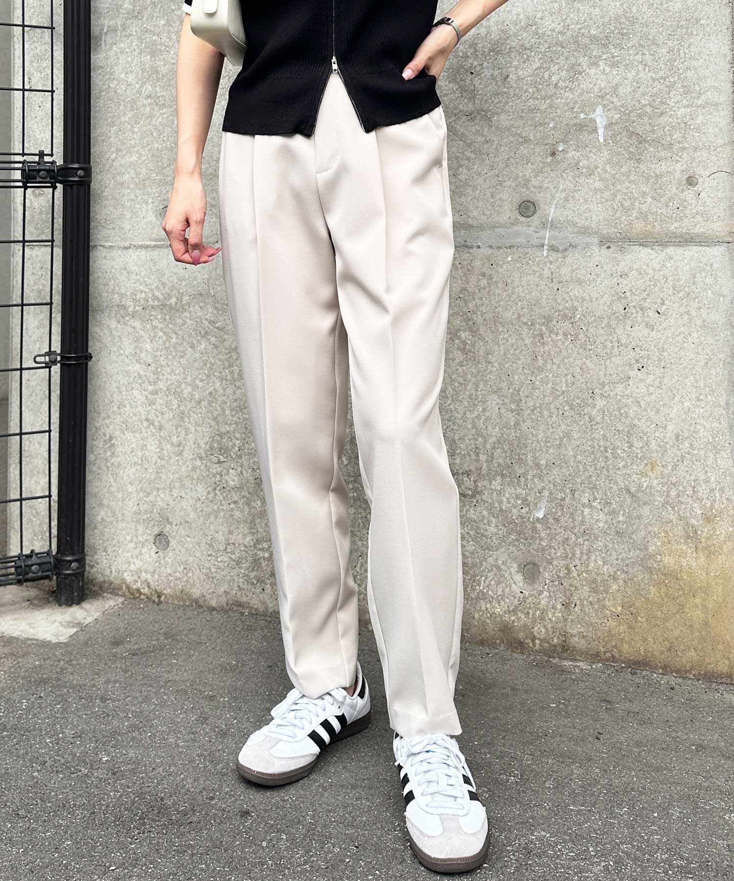 ベーシックながらも美脚見せにこだわったテーパードシルエットのパンツ。