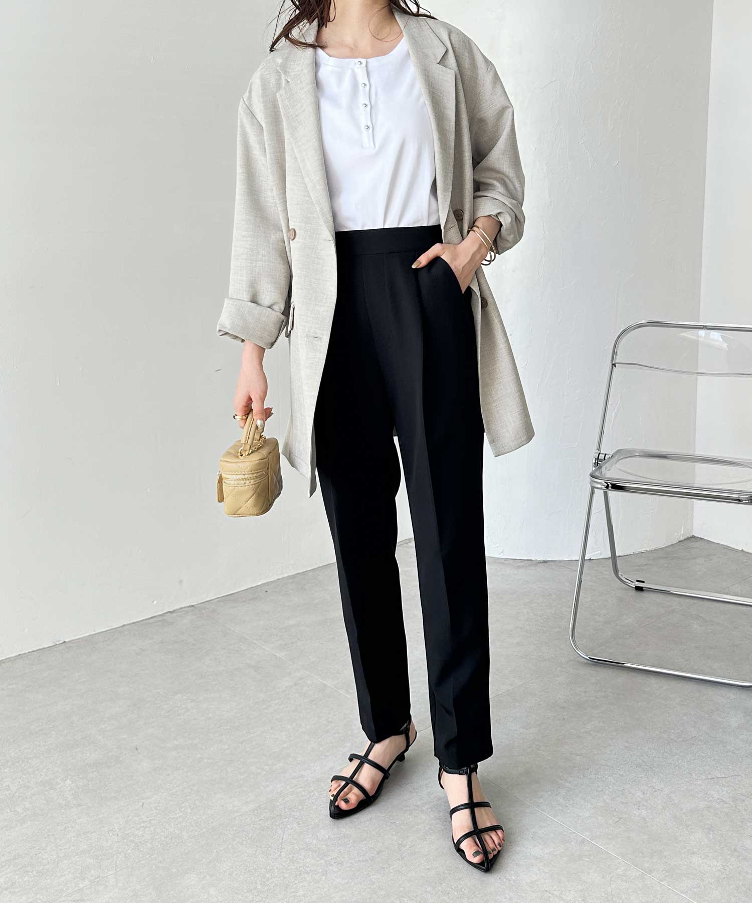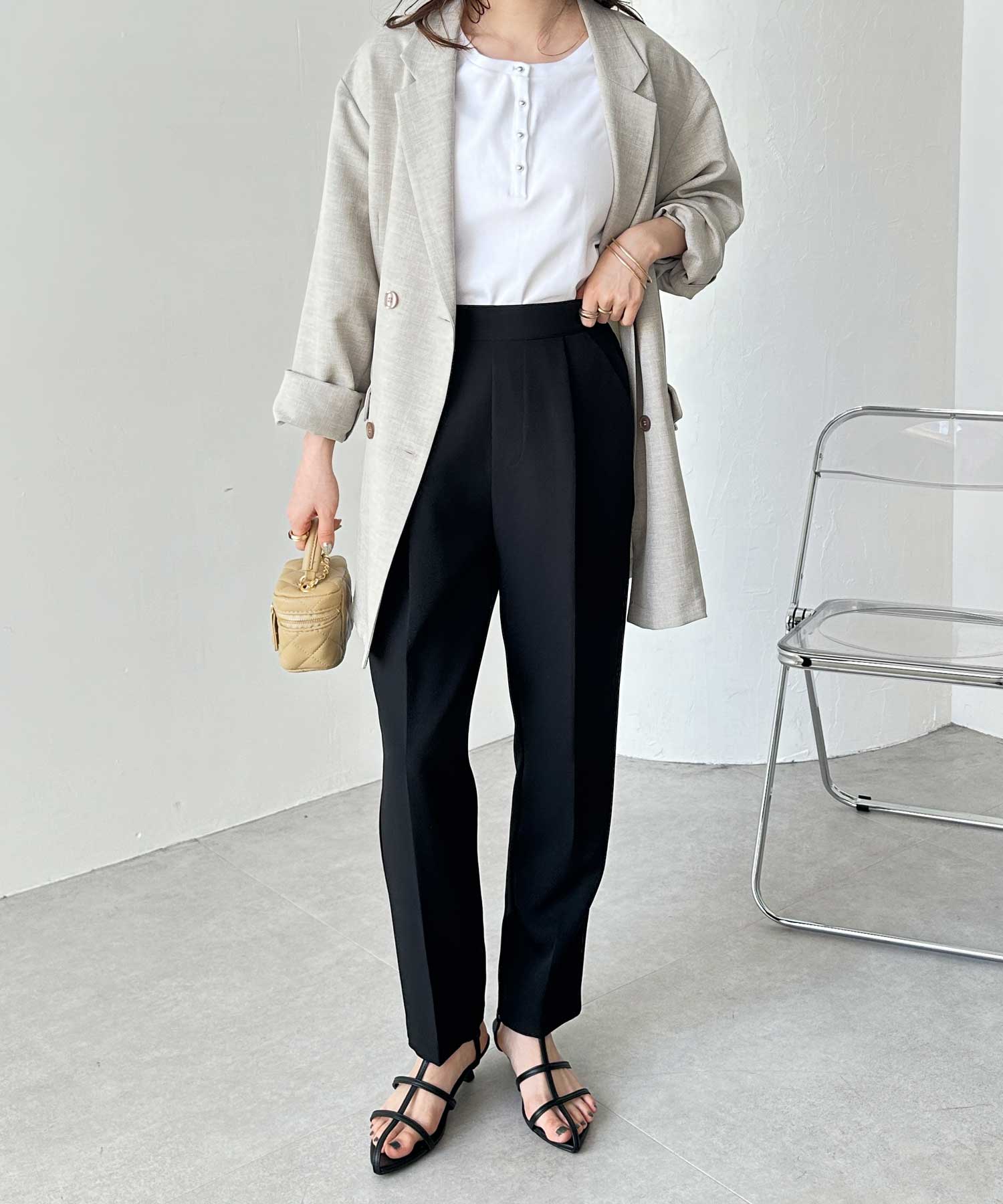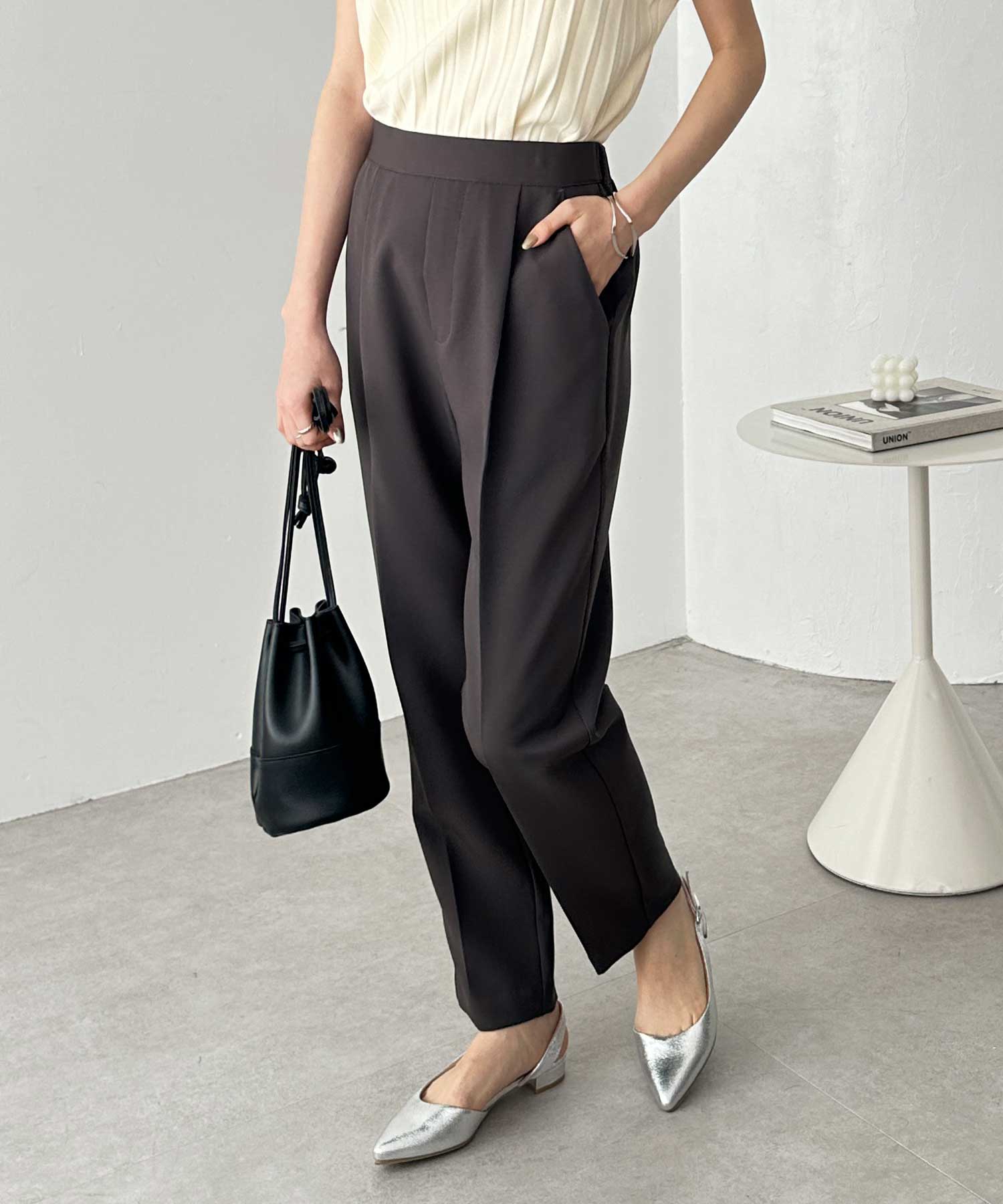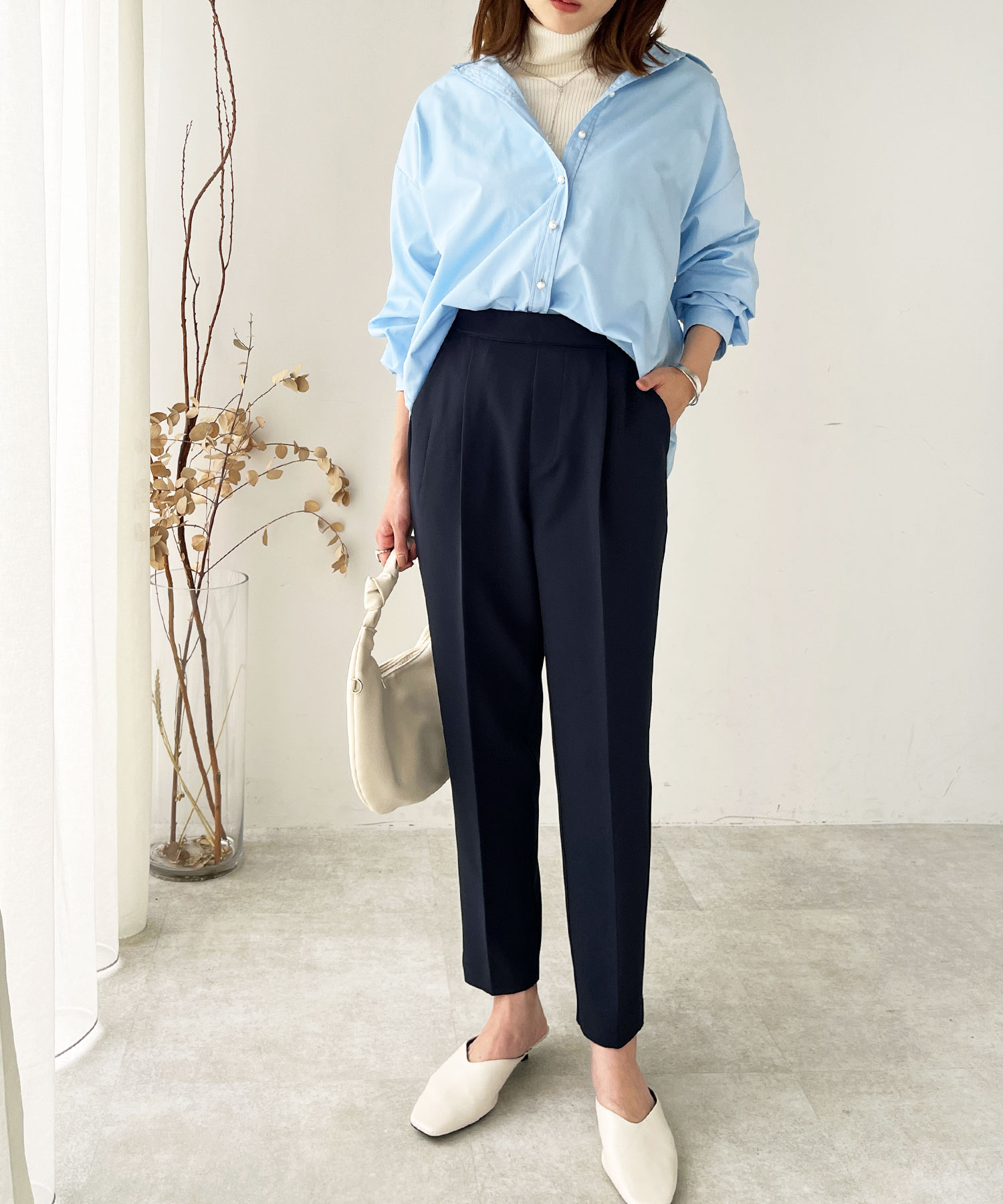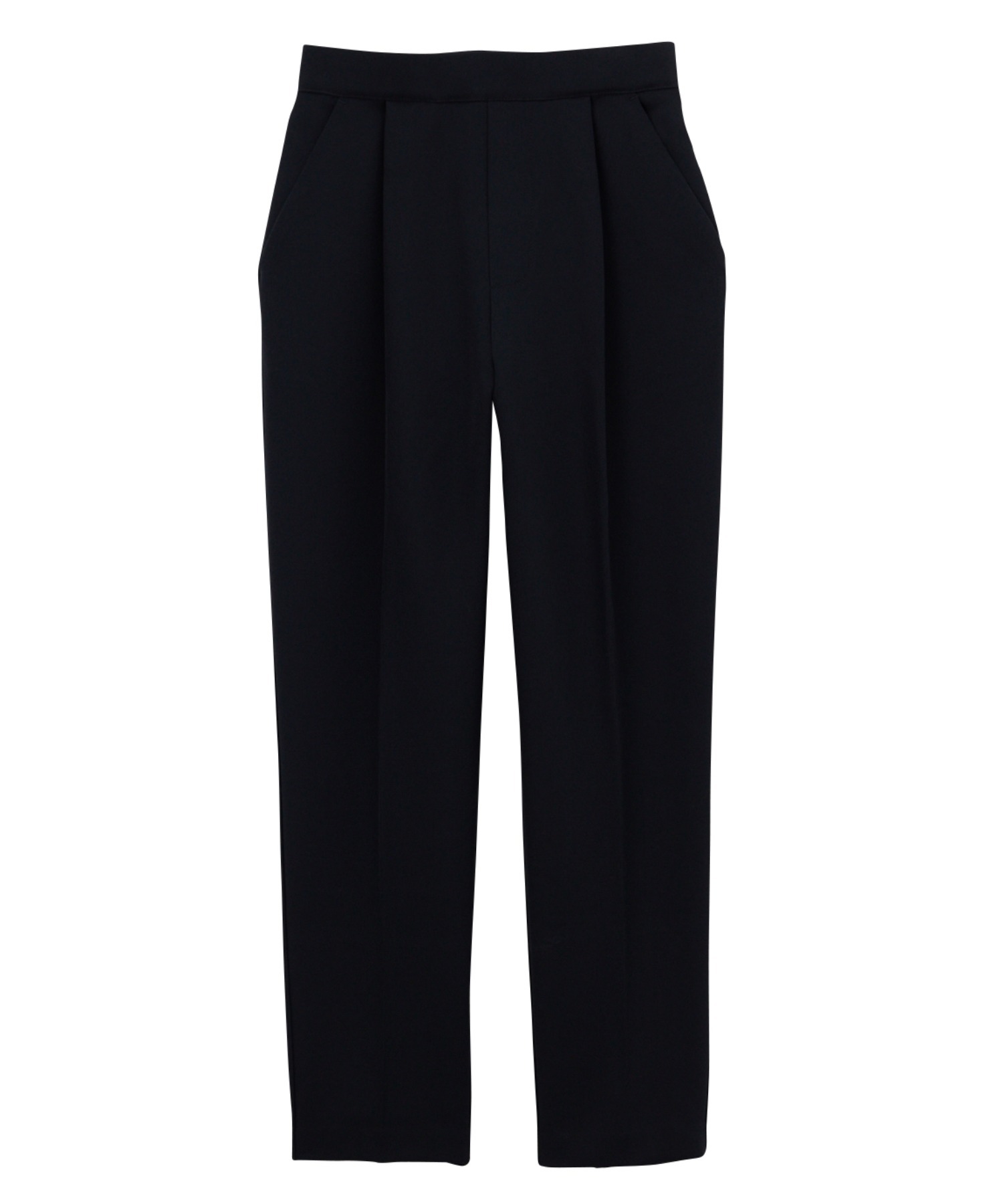 ベーシックながらも美脚見せにこだわったテーパードシルエットのパンツ。