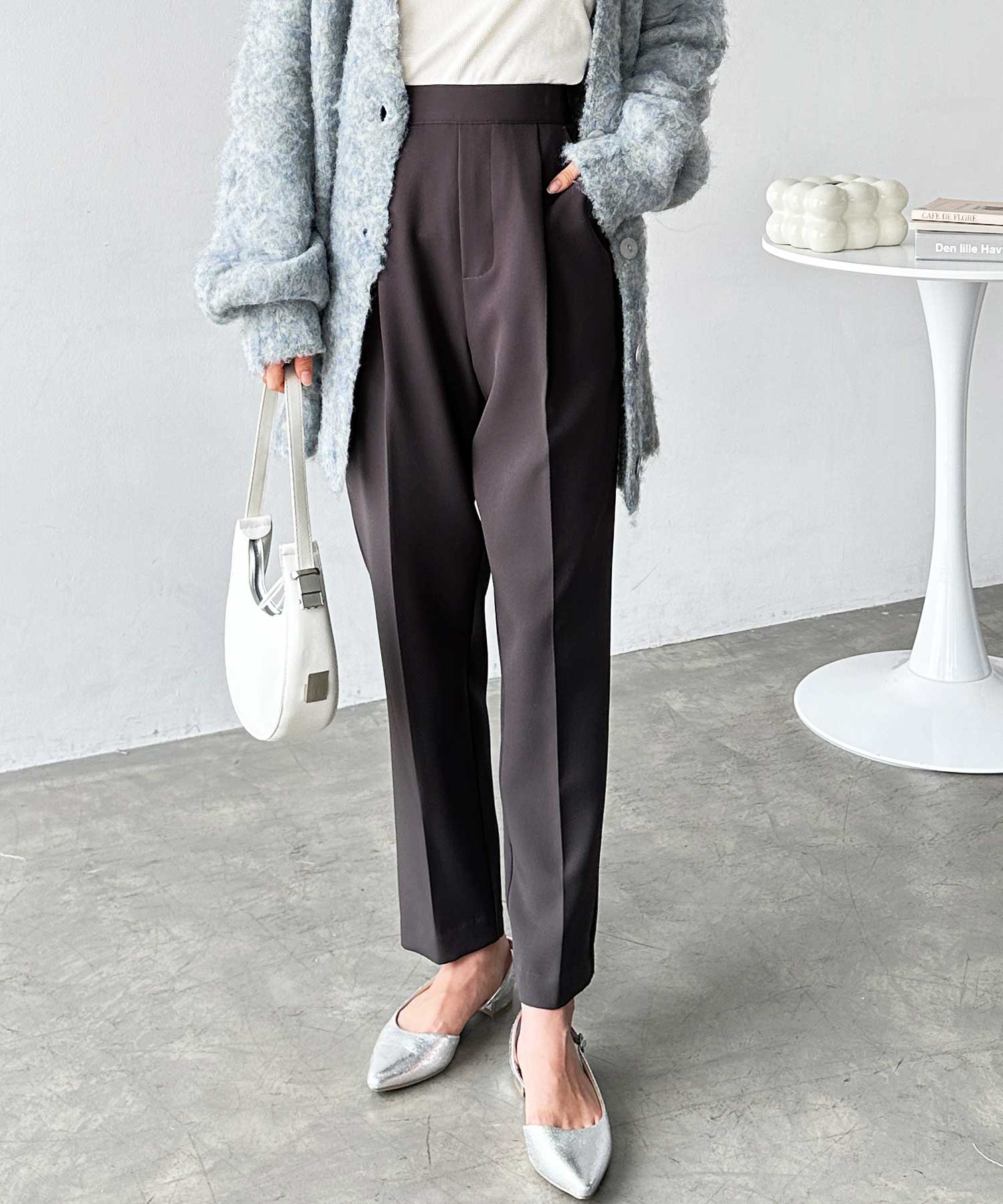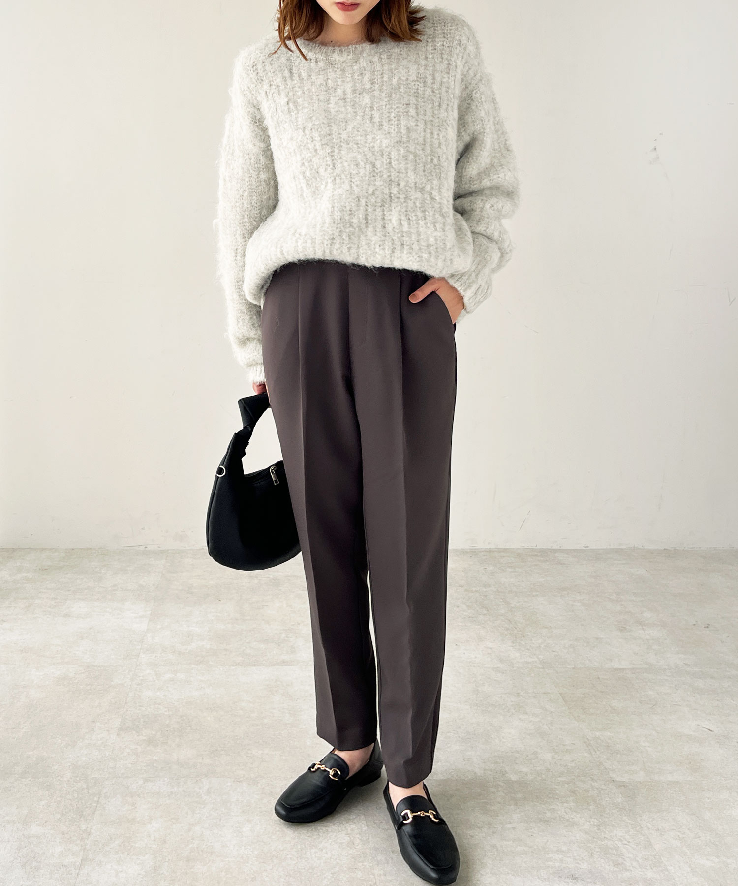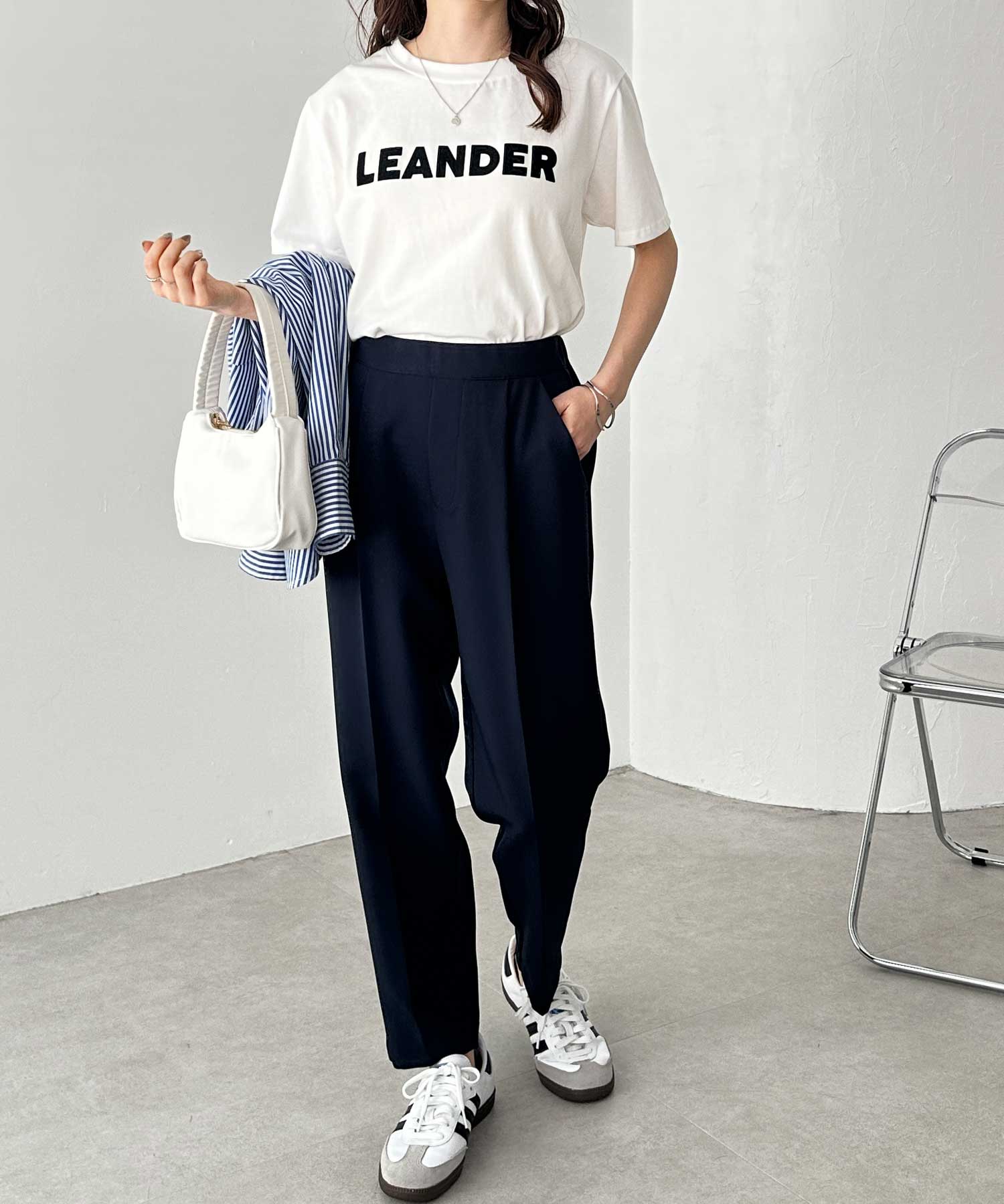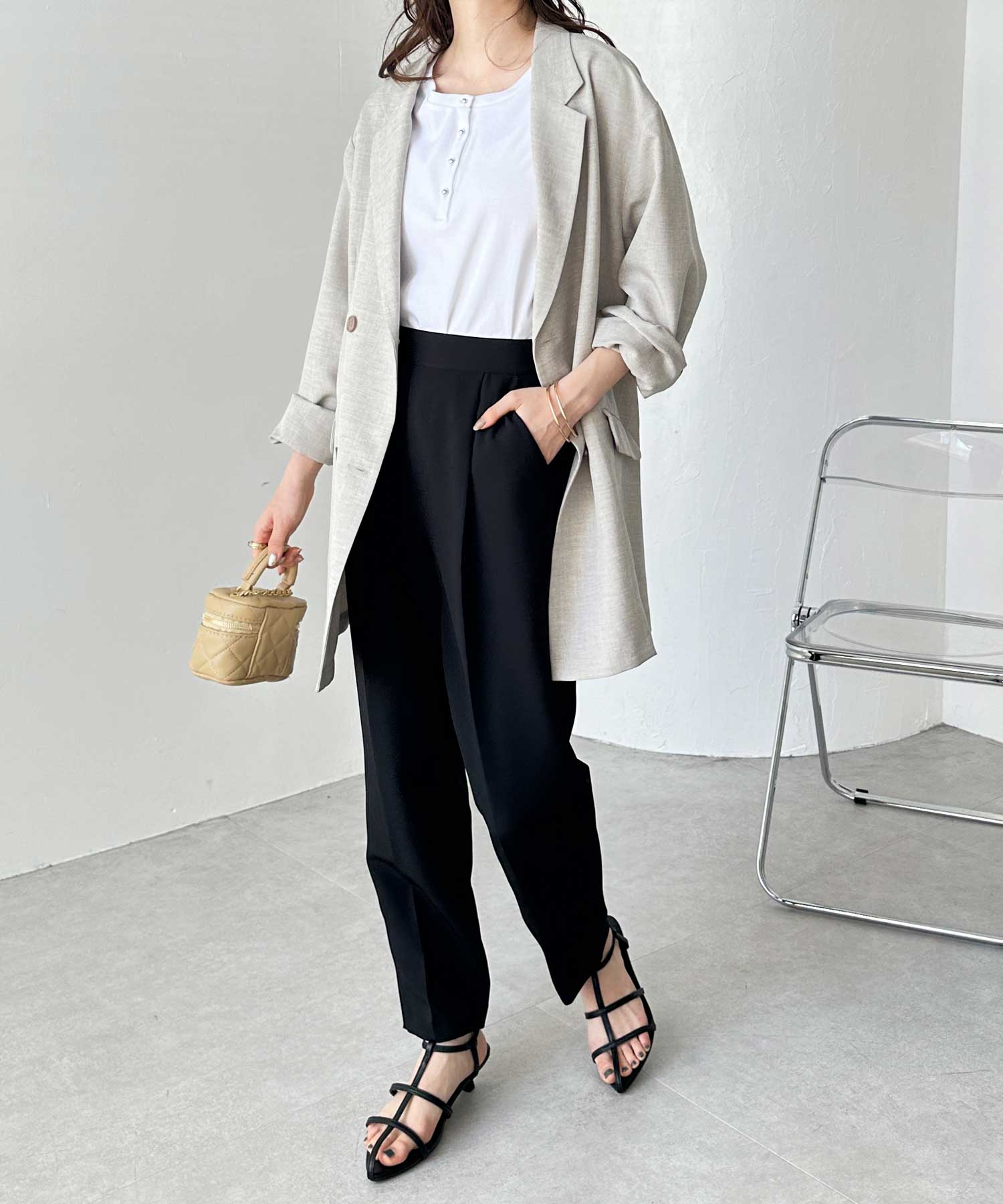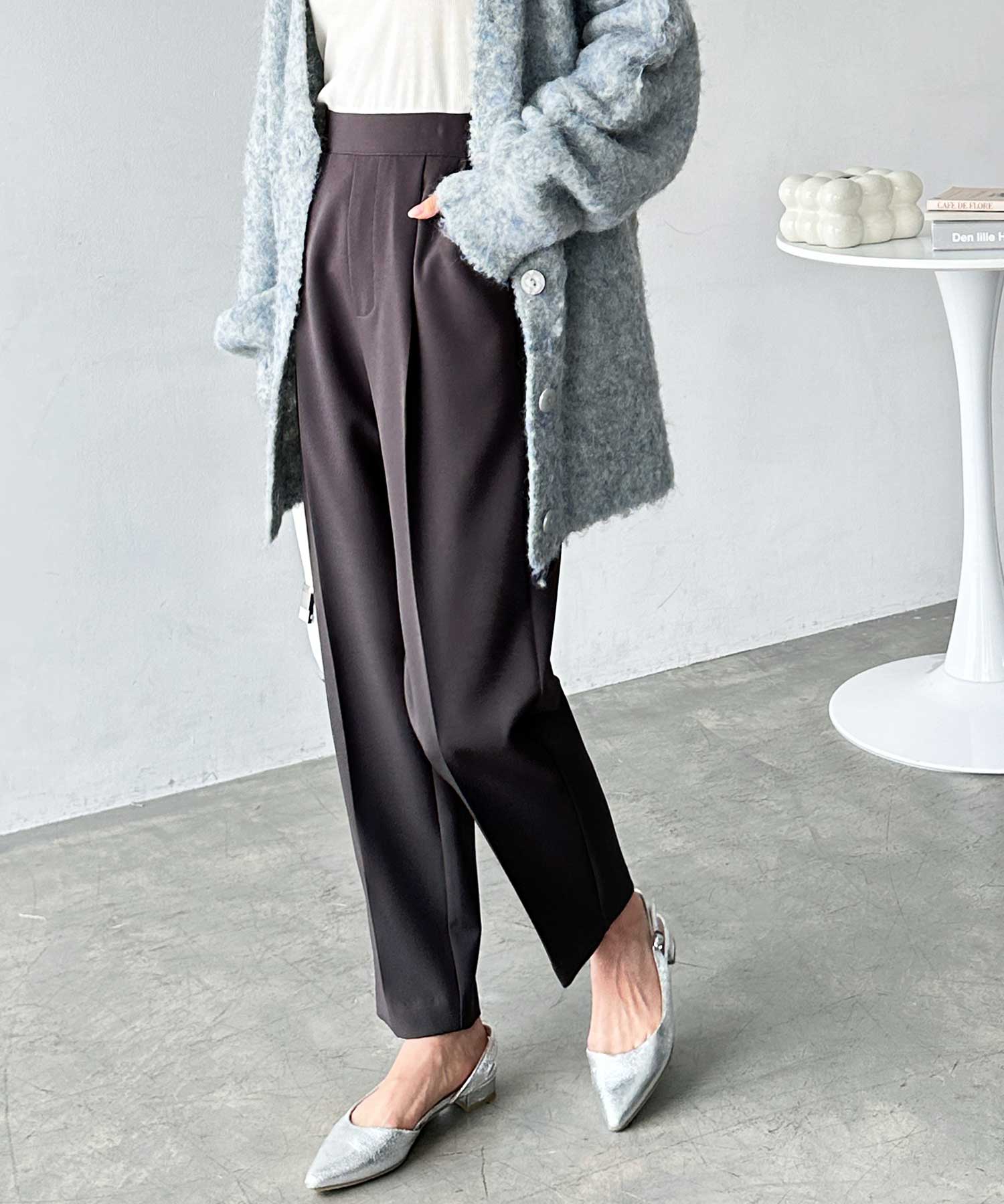 ベーシックながらも美脚見せにこだわったテーパードシルエットのパンツ。