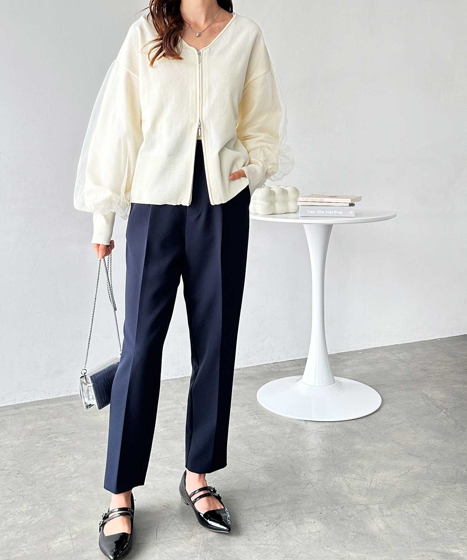 センタープレスが縦ラインを強調して裾に向かって細くなるシルエットが美しい。