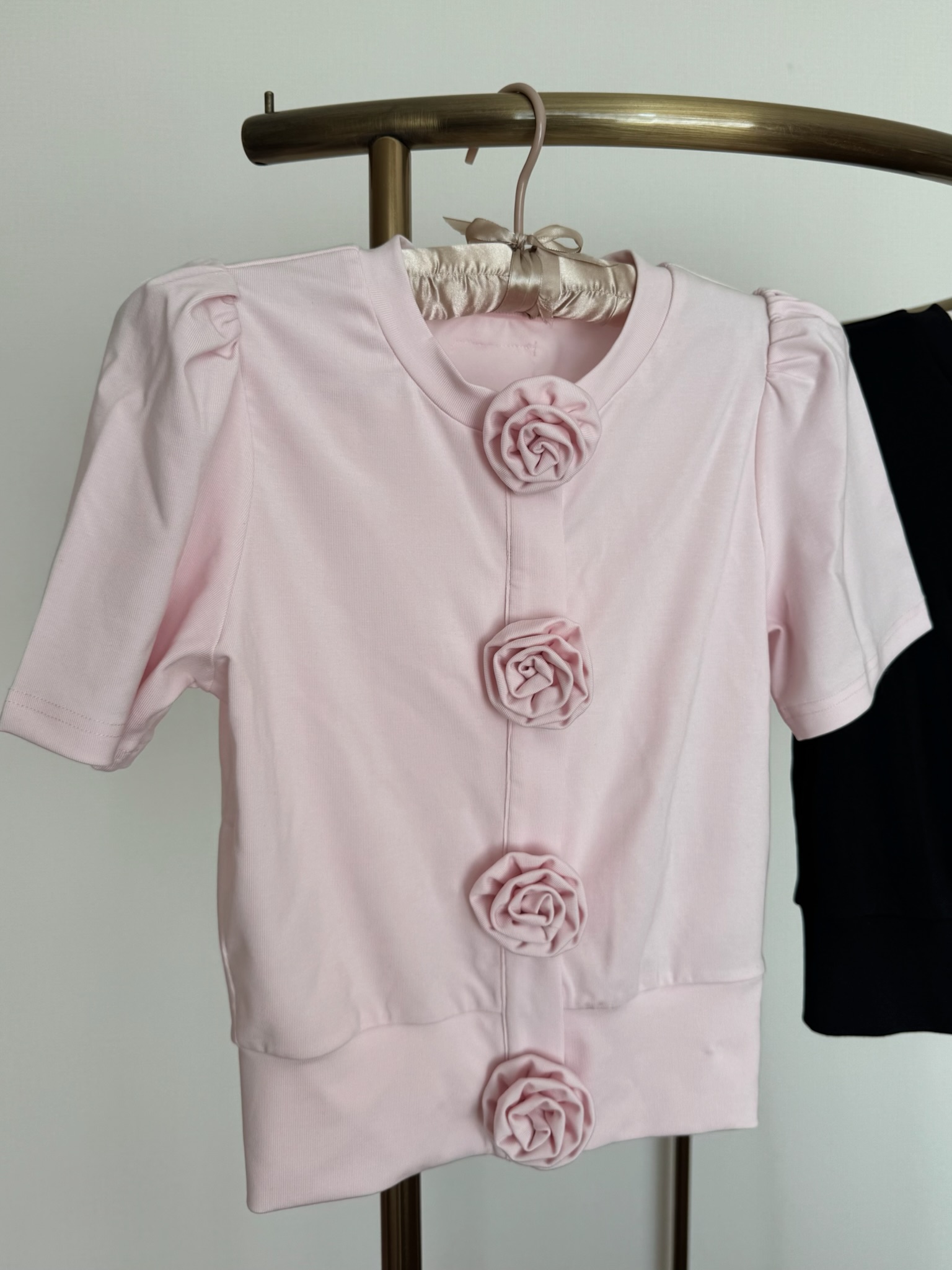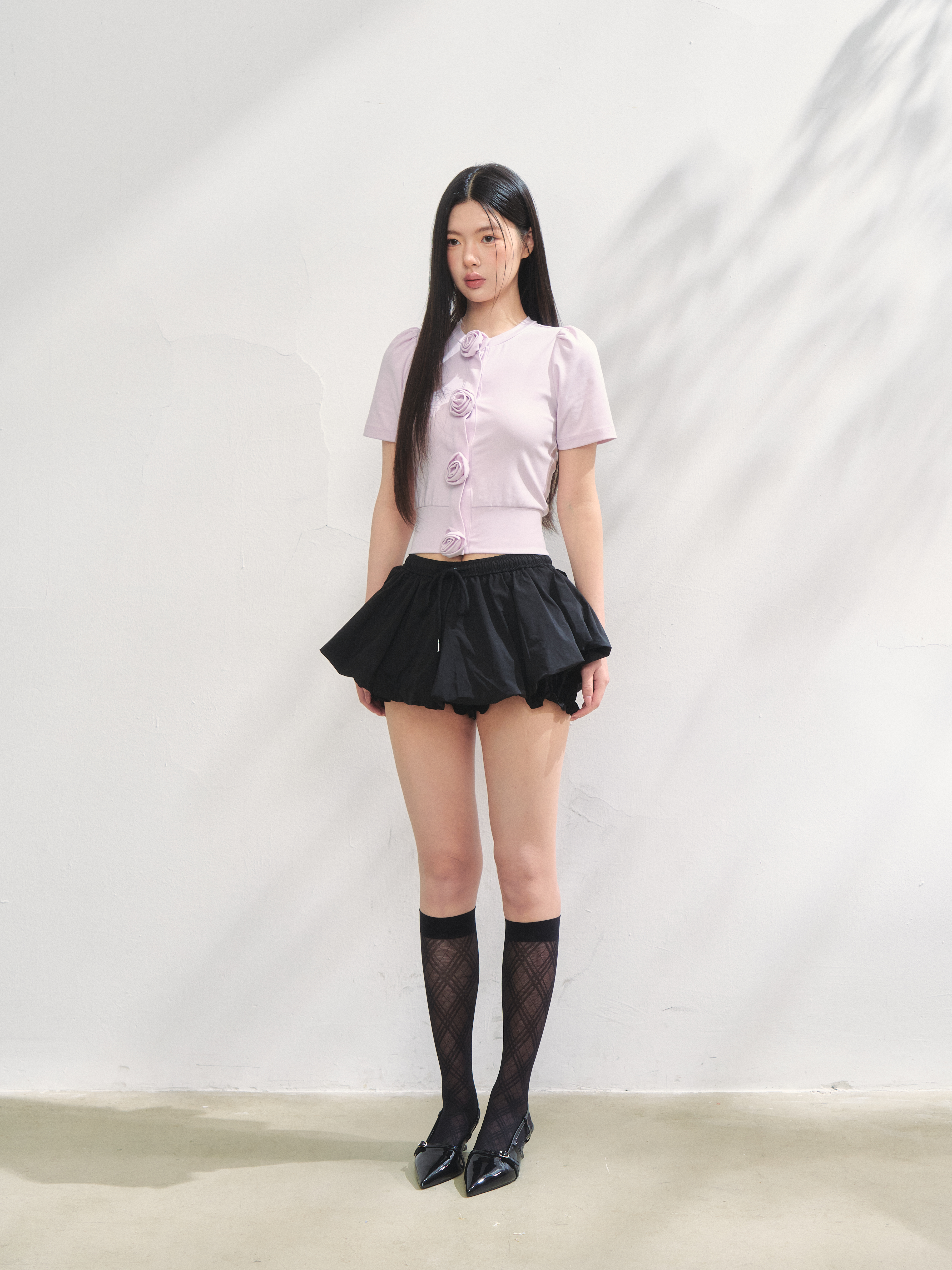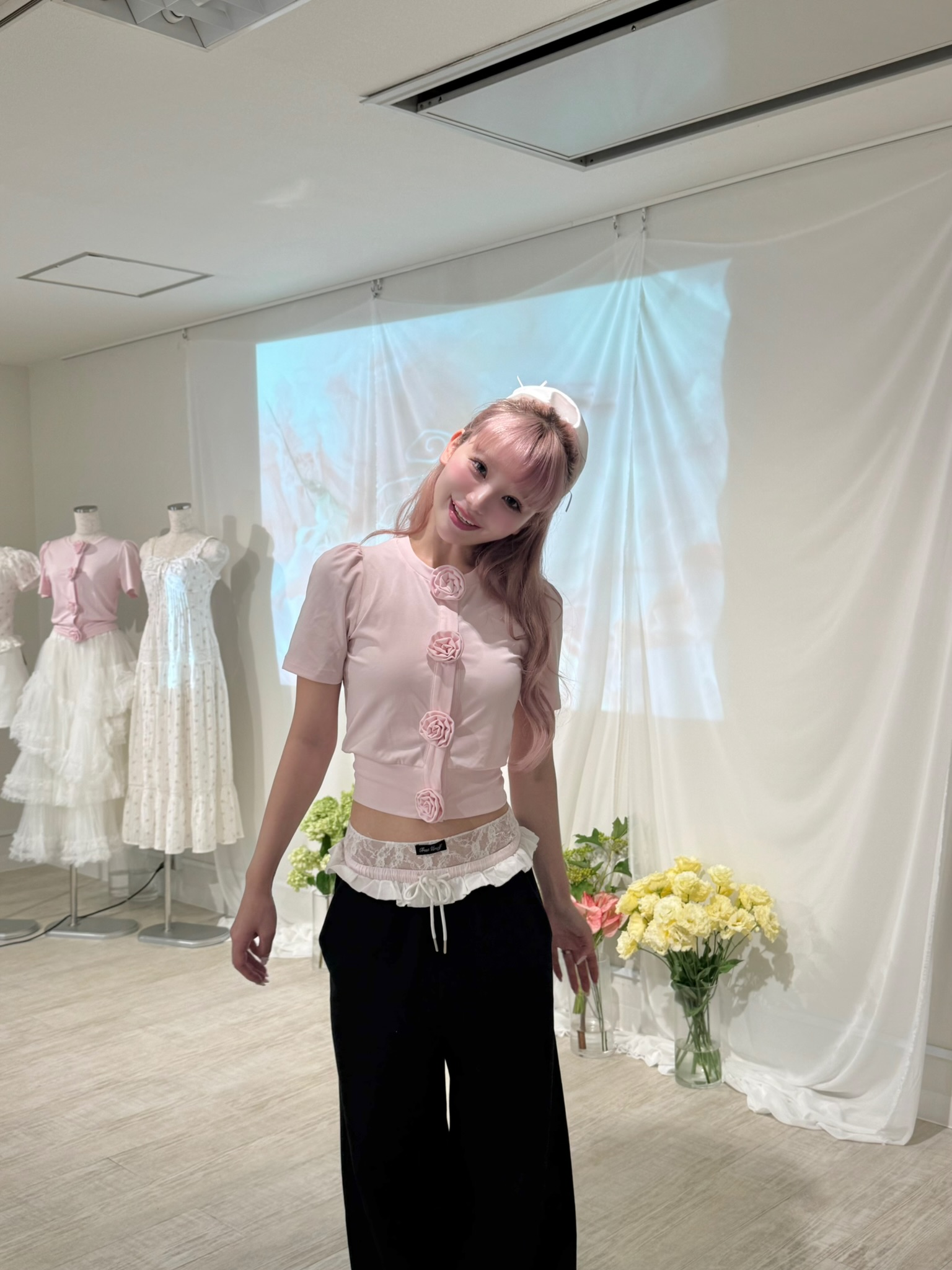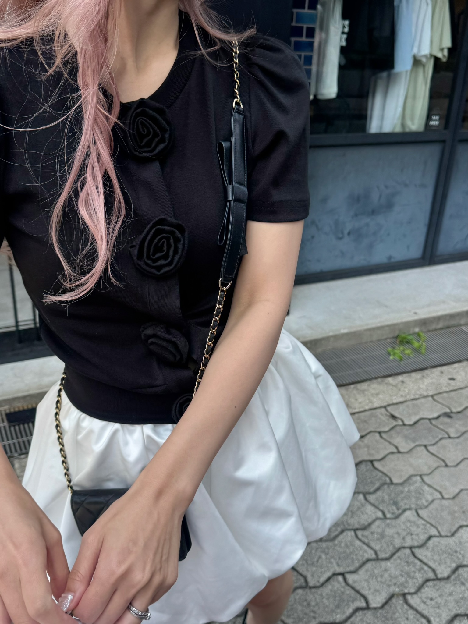 胸元に並んだ立体的なローズディテールが、甘さと上品さをプラスしてくれるアイコニックな一枚。