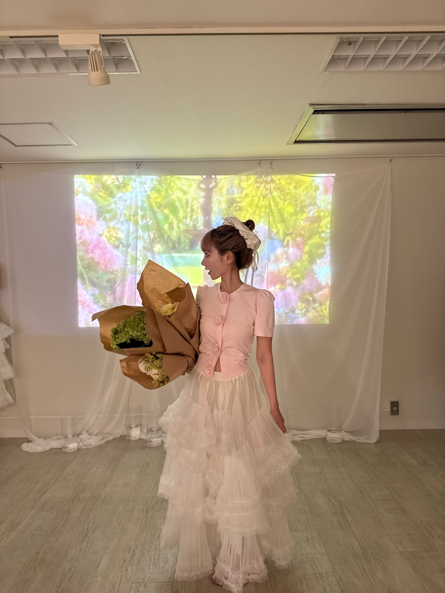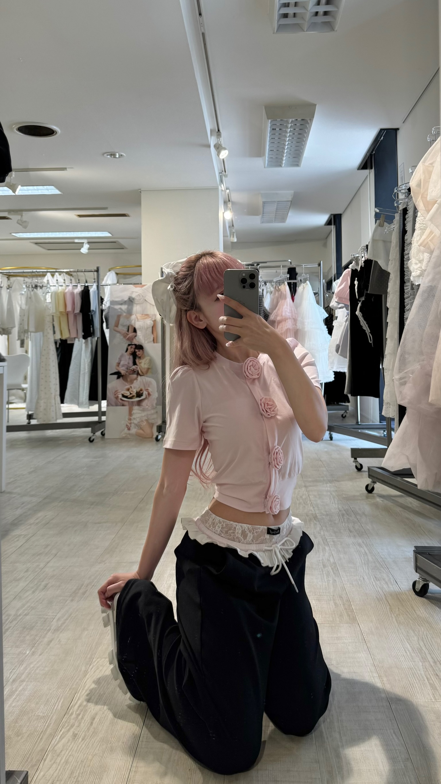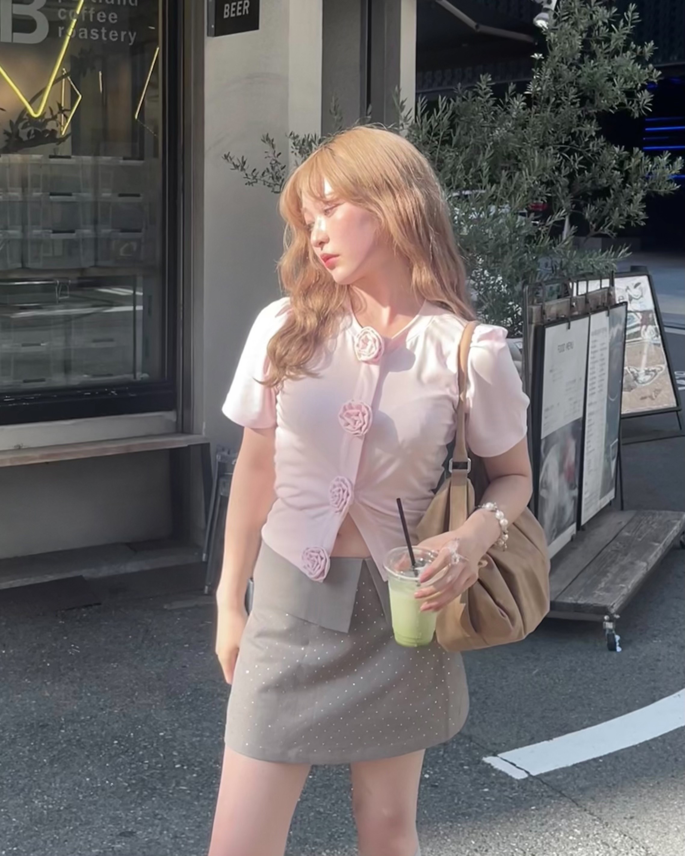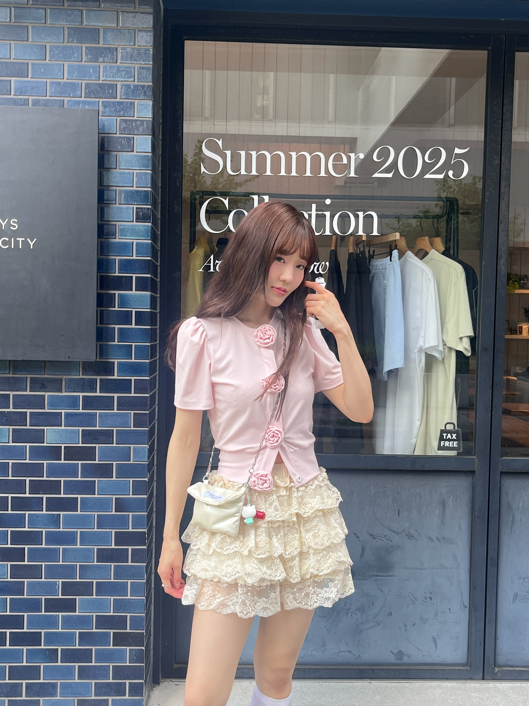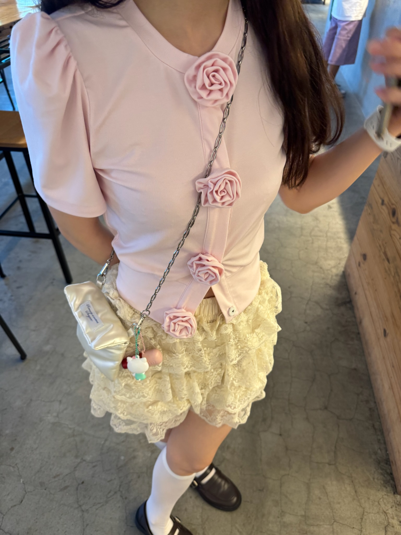 胸元に並んだ立体的なローズディテールが、甘さと上品さをプラスしてくれるアイコニックな一枚。