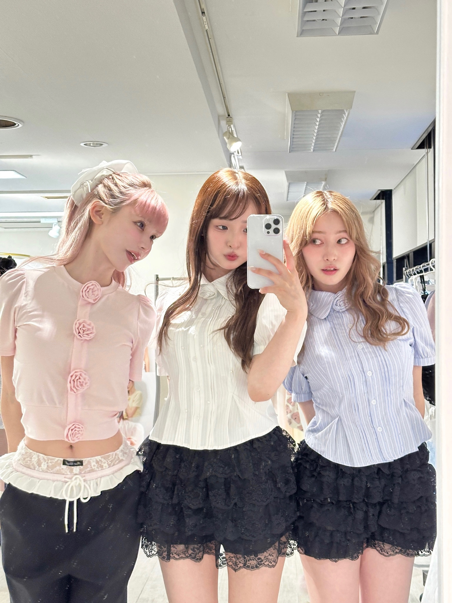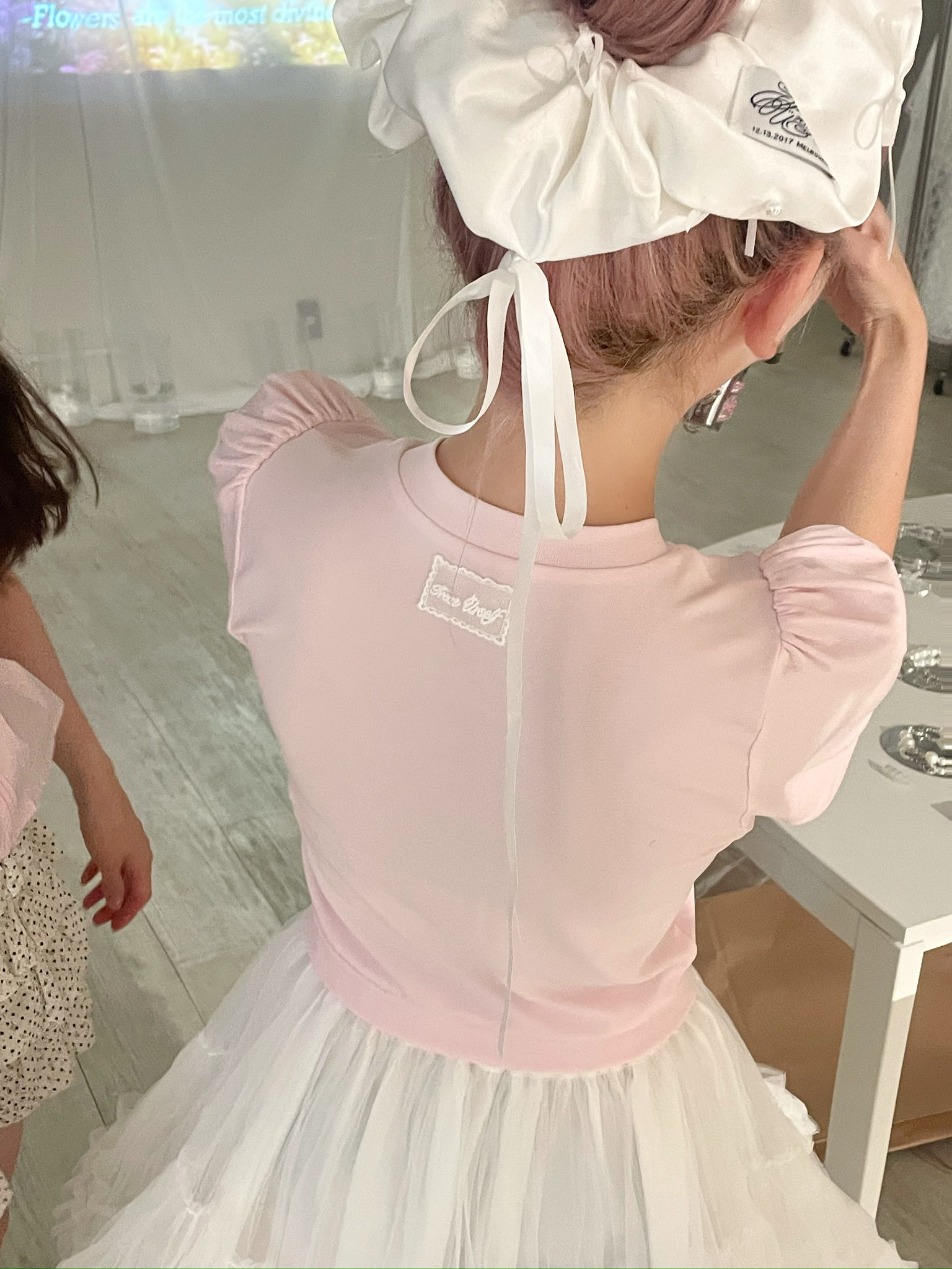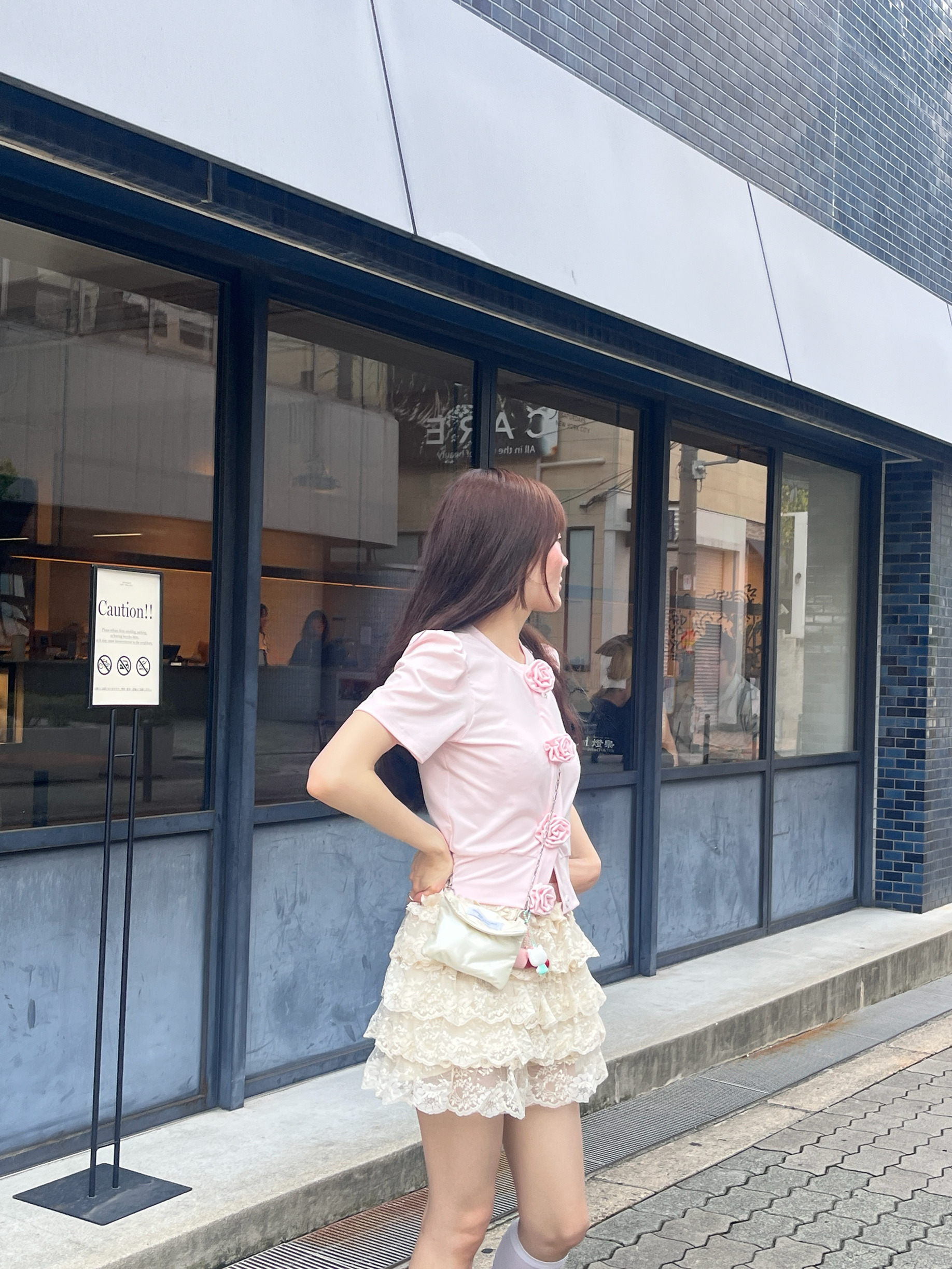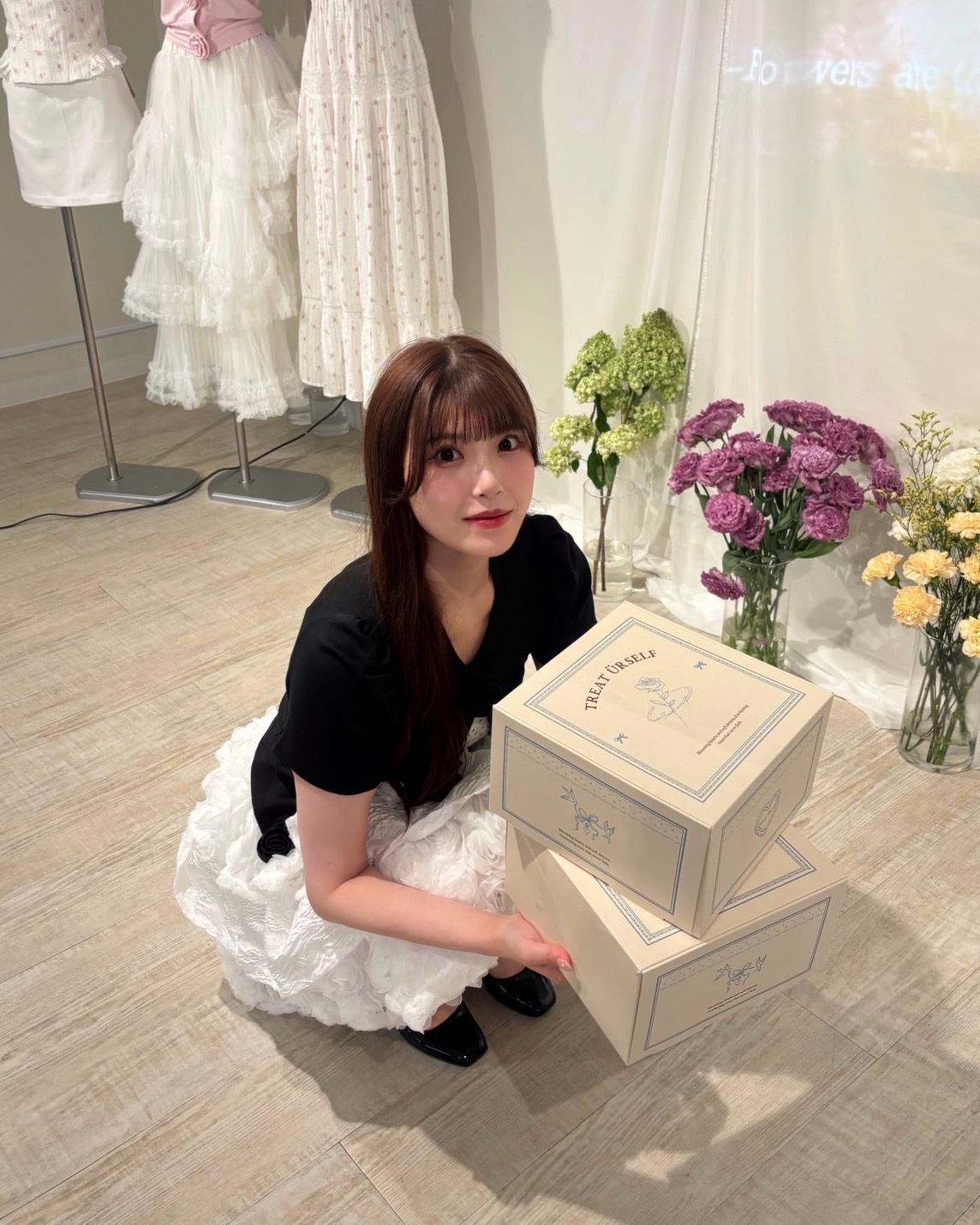 胸元に並んだ立体的なローズディテールが、甘さと上品さをプラスしてくれるアイコニックな一枚。