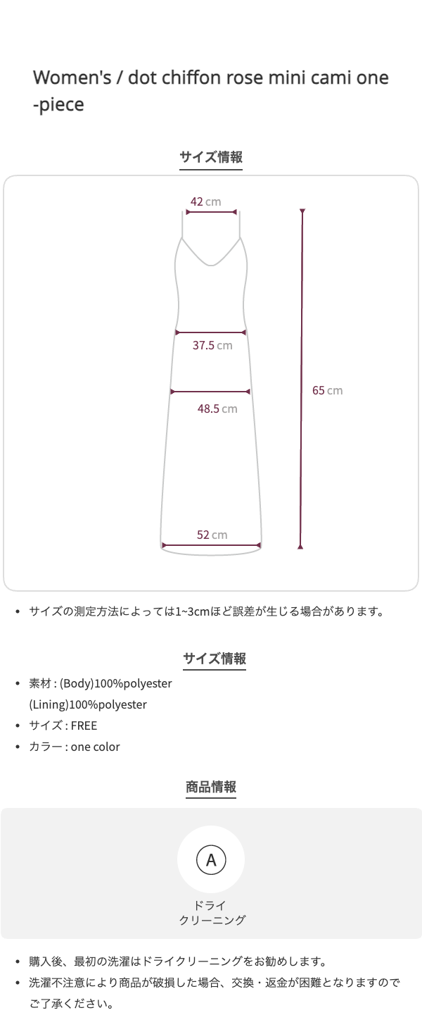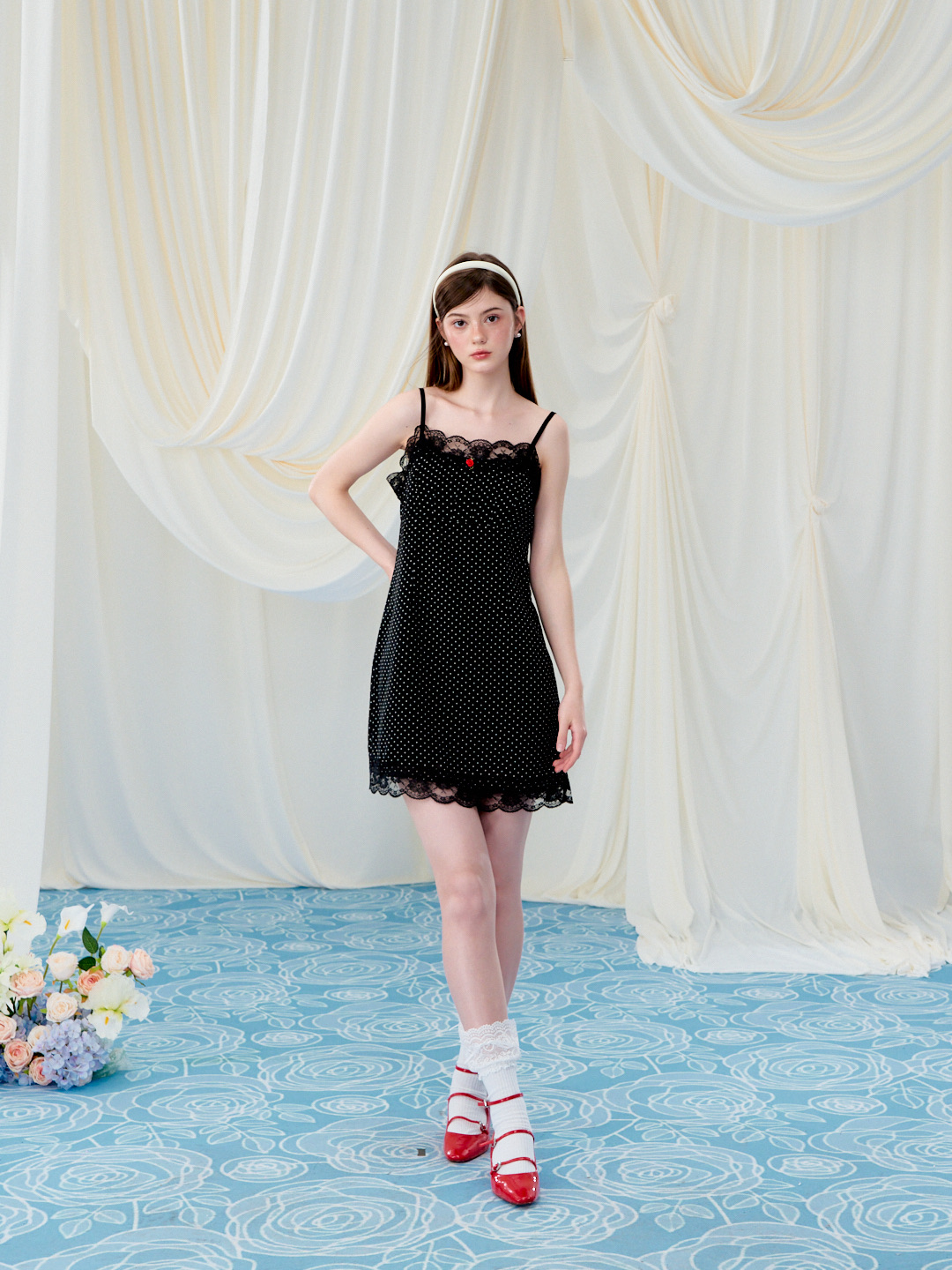 シンプルながらも胸元にワンポイント添えたバラモチーフがアクセントとなったドットキャミワンピース。