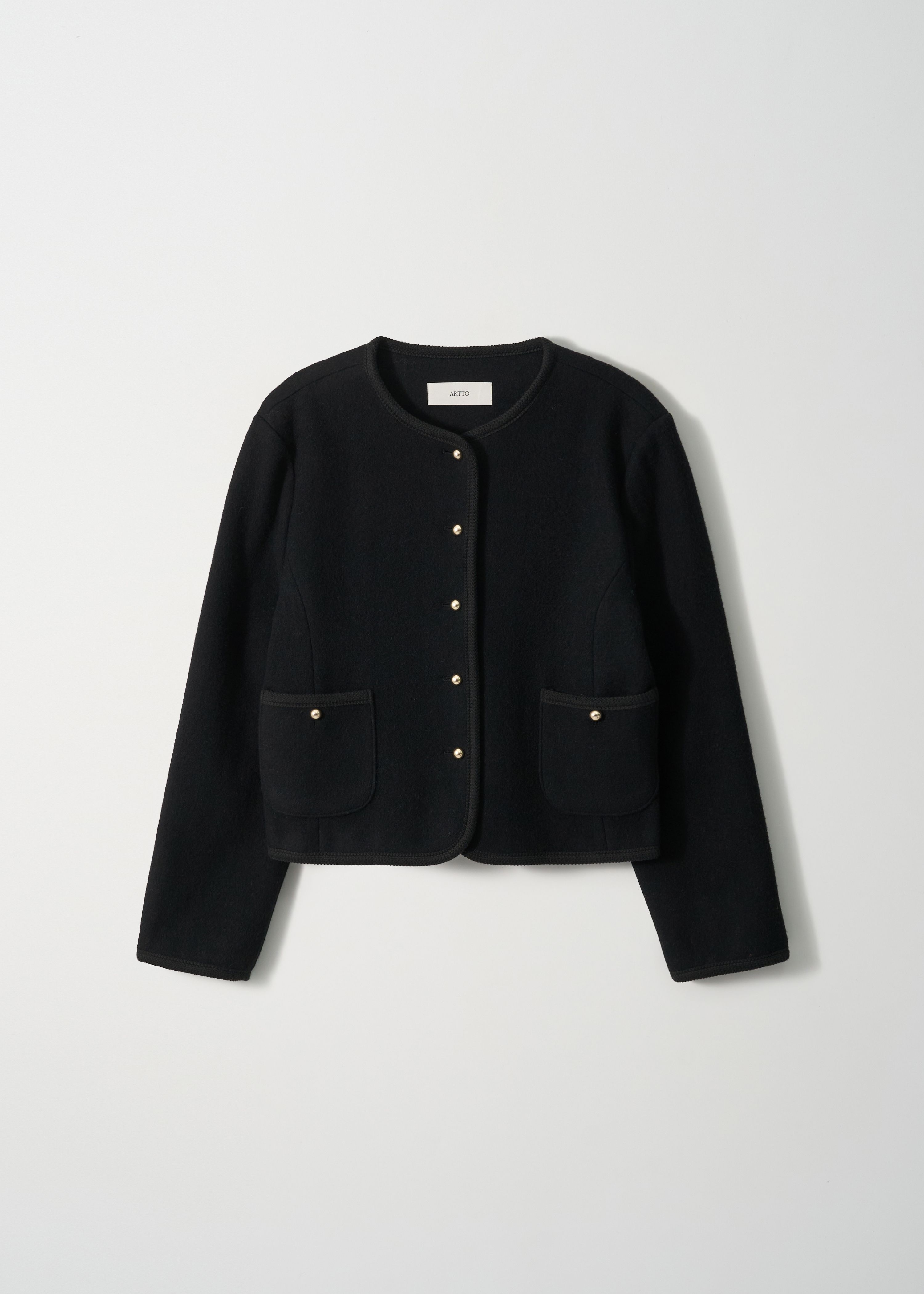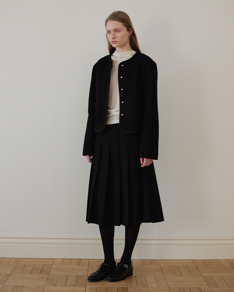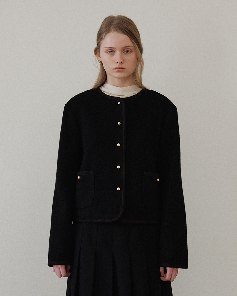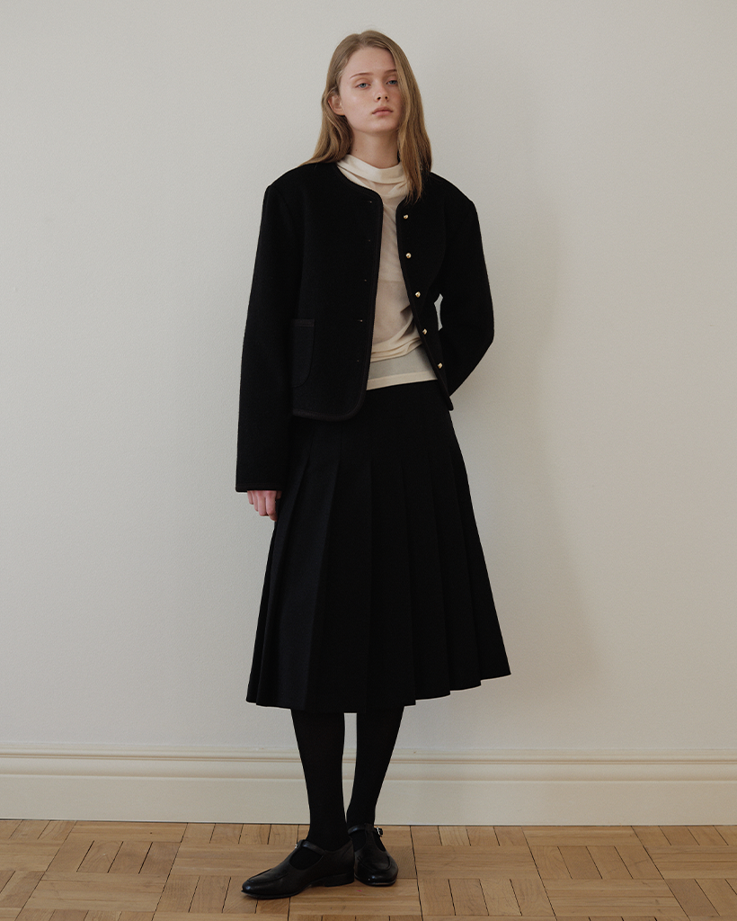 ショルダーラインは構築的に設計され、着膨れ感を抑えつつ、全体に程よいゆとりを持たせたセミスリムシルエットで、洗練されたムードを演出。