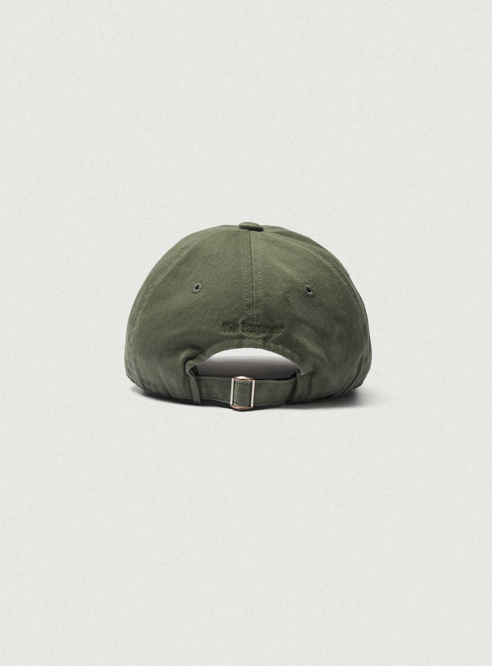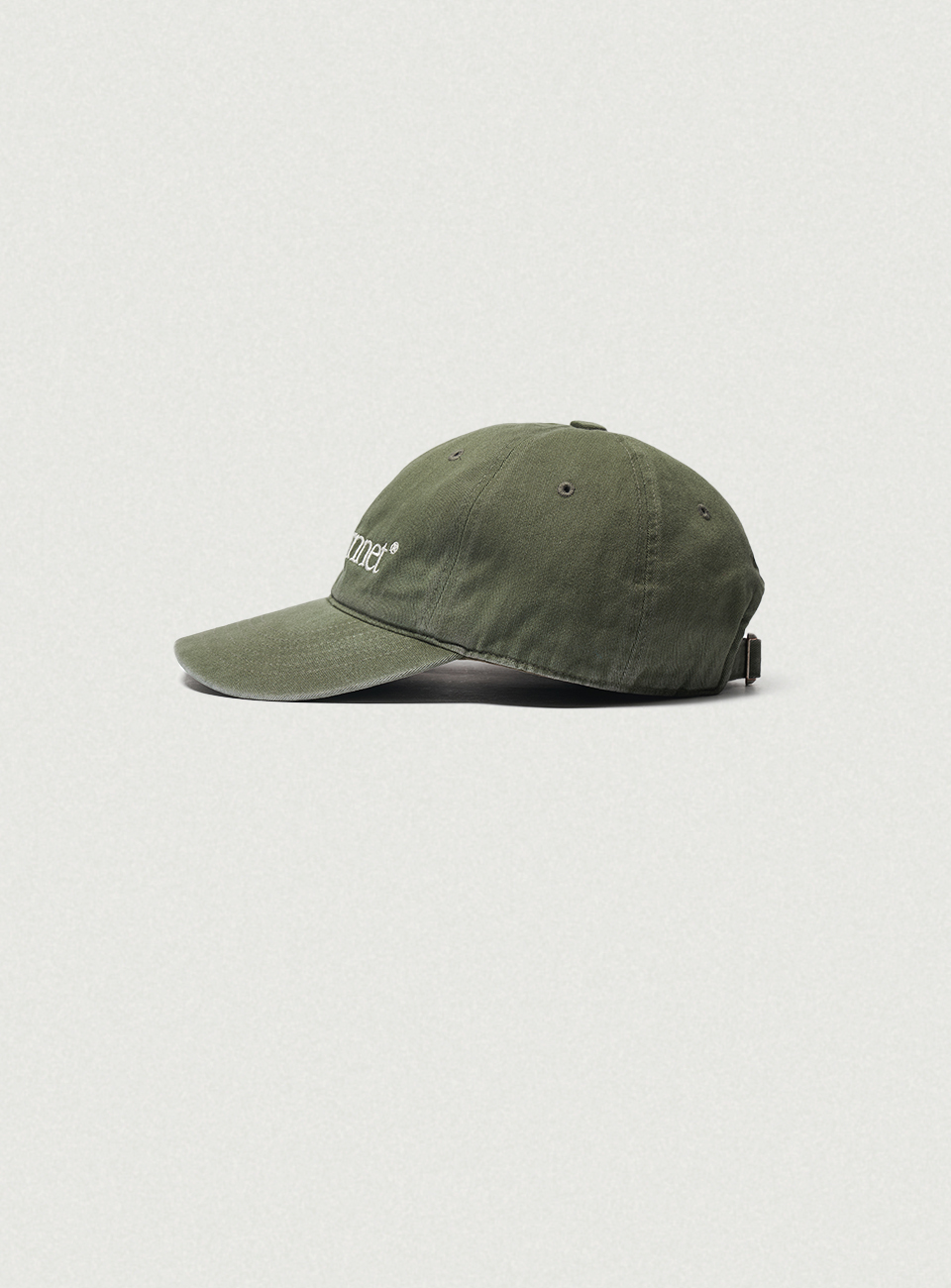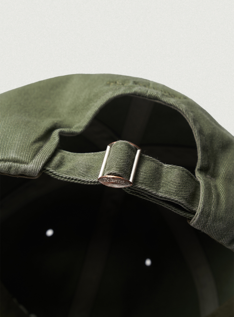 ダークカーキカラーの柔らかな質感が際立つコットン生地 調節可能なストラップとアンストラクチャー仕様のボールキャップタイプ ファブリックカラーに備えたホワイトカラーを活用したロゴ刺繍ディテール コットン100% ダークカキコットン Baseball cap Unstructured Adjustable strap Logo embroidery