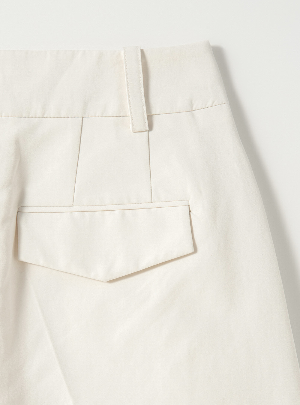 2つのタックディテールと背面のフェイクポケットを加え、立体感のあるシルエットを表現。幅広のウエストバンドと、サイドシームに沿ってすっきり配した実用的なサイドポケットで完成度を高めました。