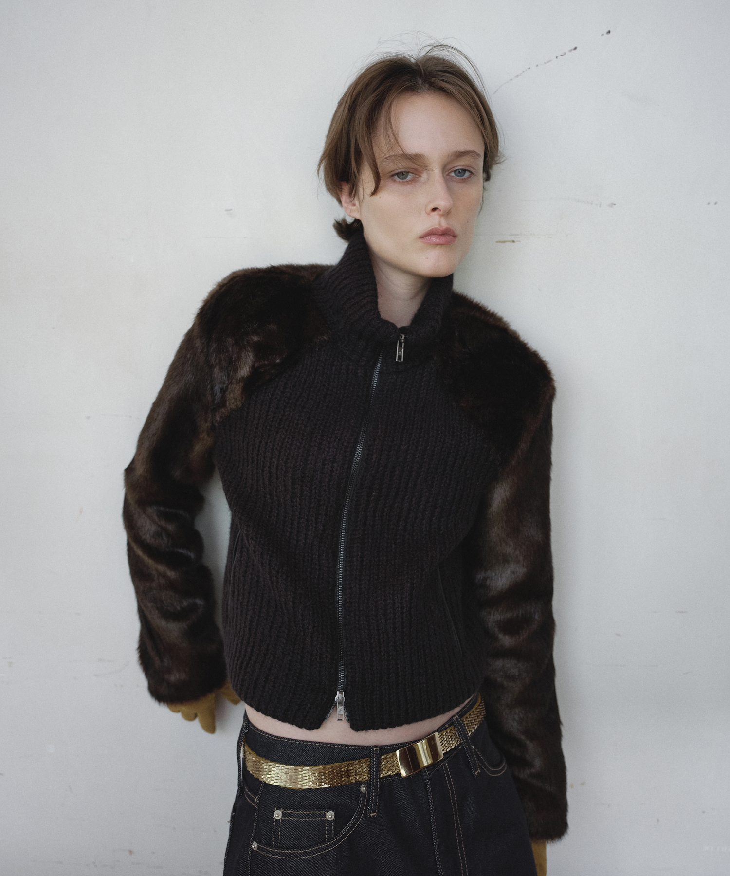 ブラックのソリッドニットボディにナチュラルなダークブラウンファーをショルダーからスリーブラインまで組み合わせ、立体感と質感のコントラストを独特なデザインポイントとして表現したファーコンビニットジップアップジャケットです。