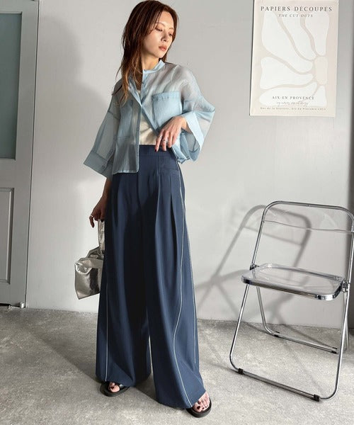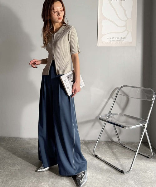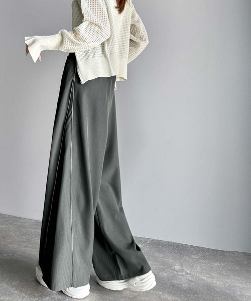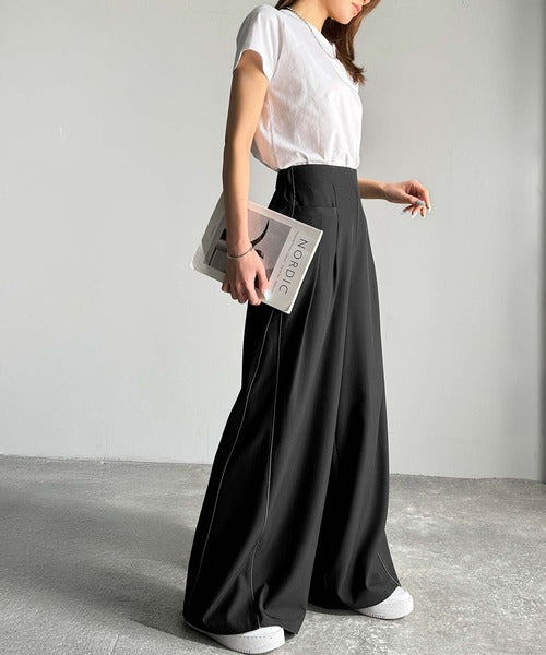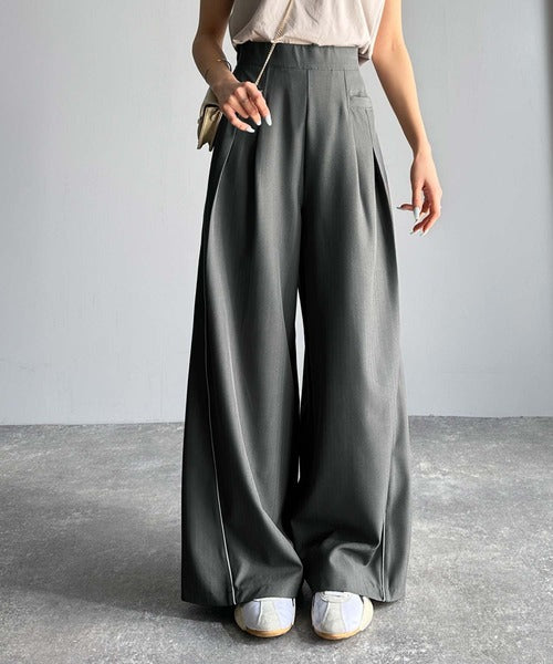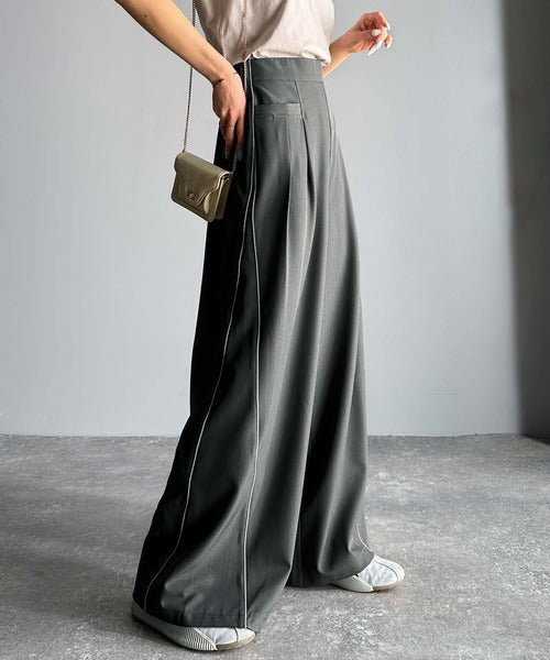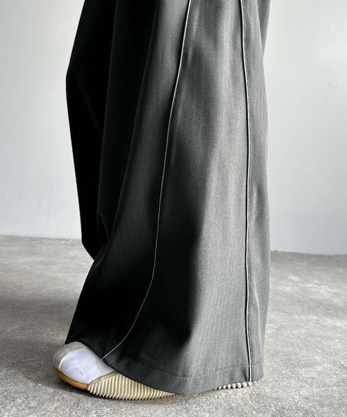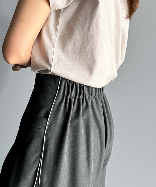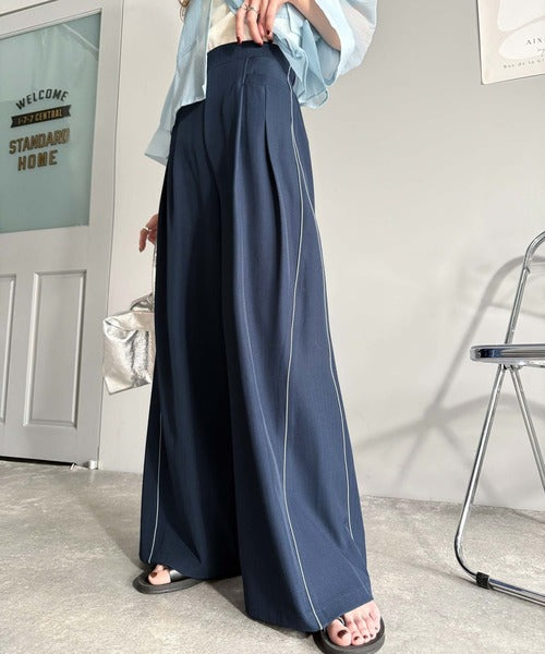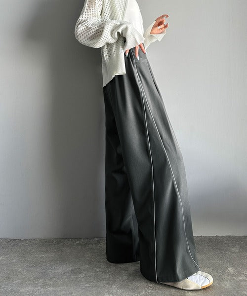 両サイドの切り替え部分に配色パイピングを施したワイドパンツ。
