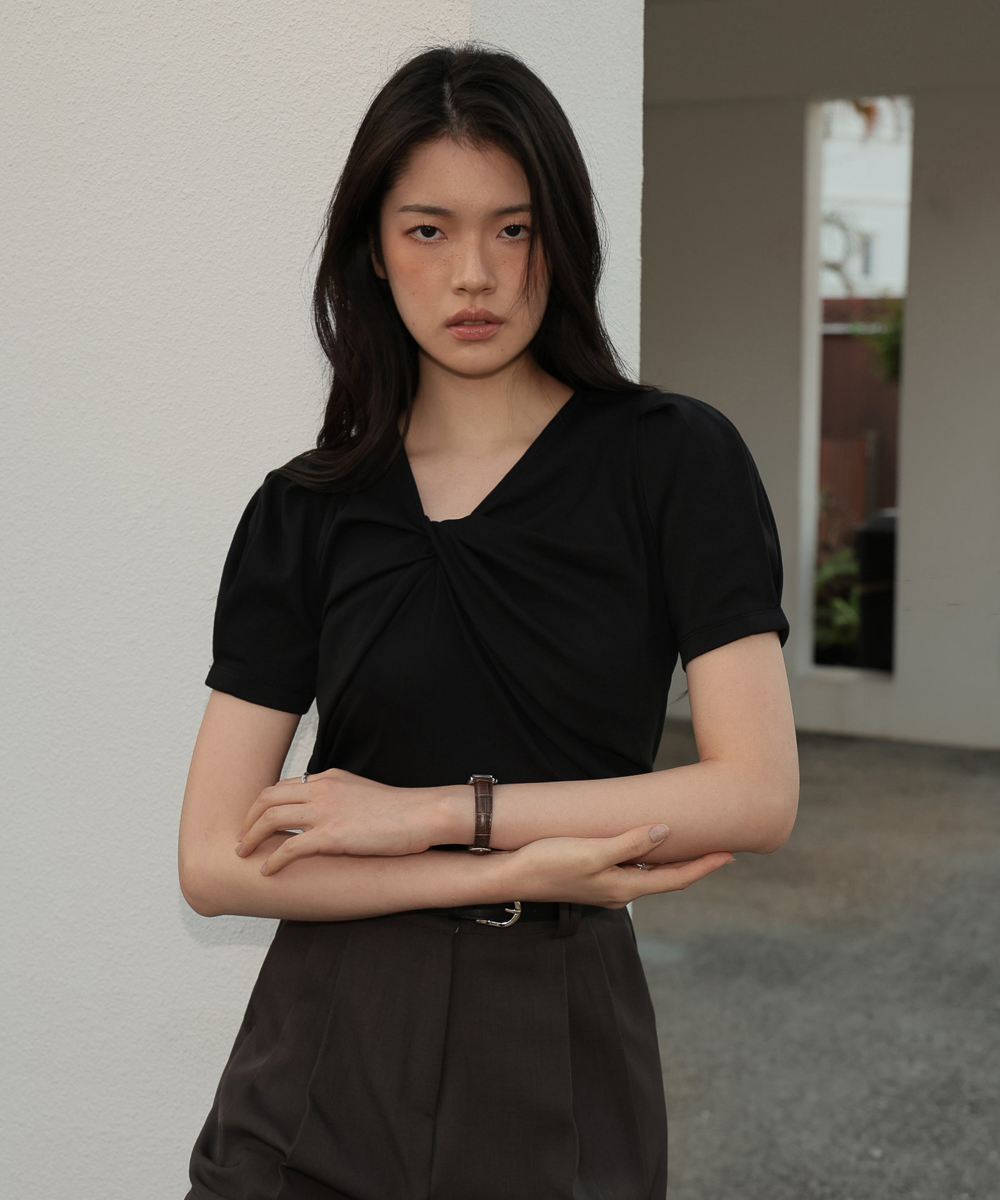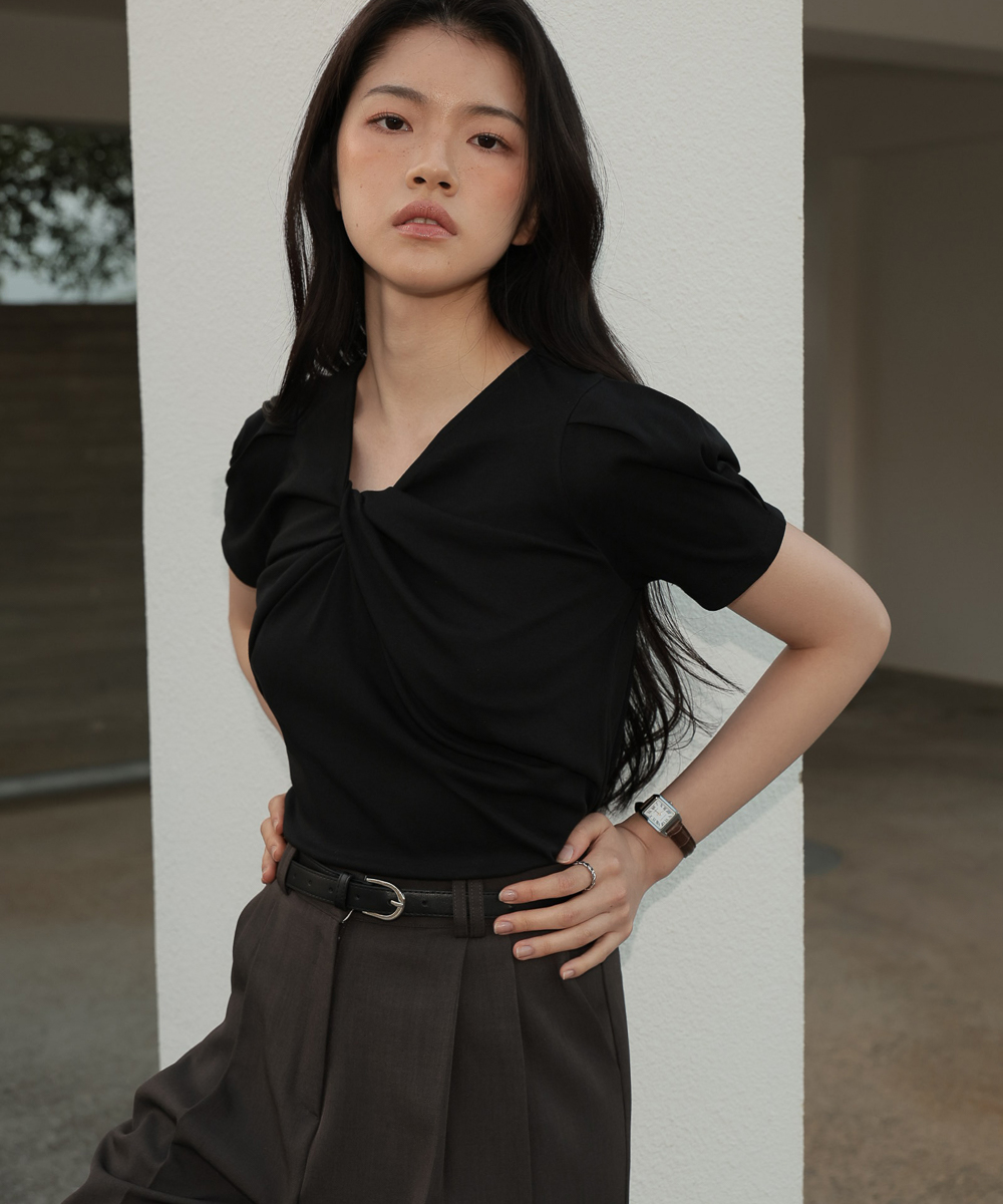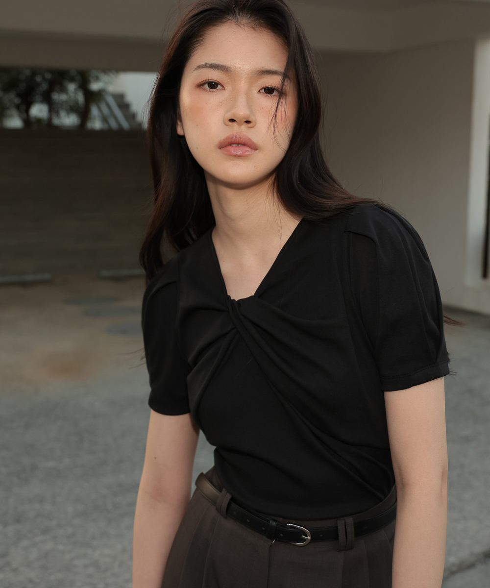ネックラインのツイストディテールが際立つ半袖Tシャツです。