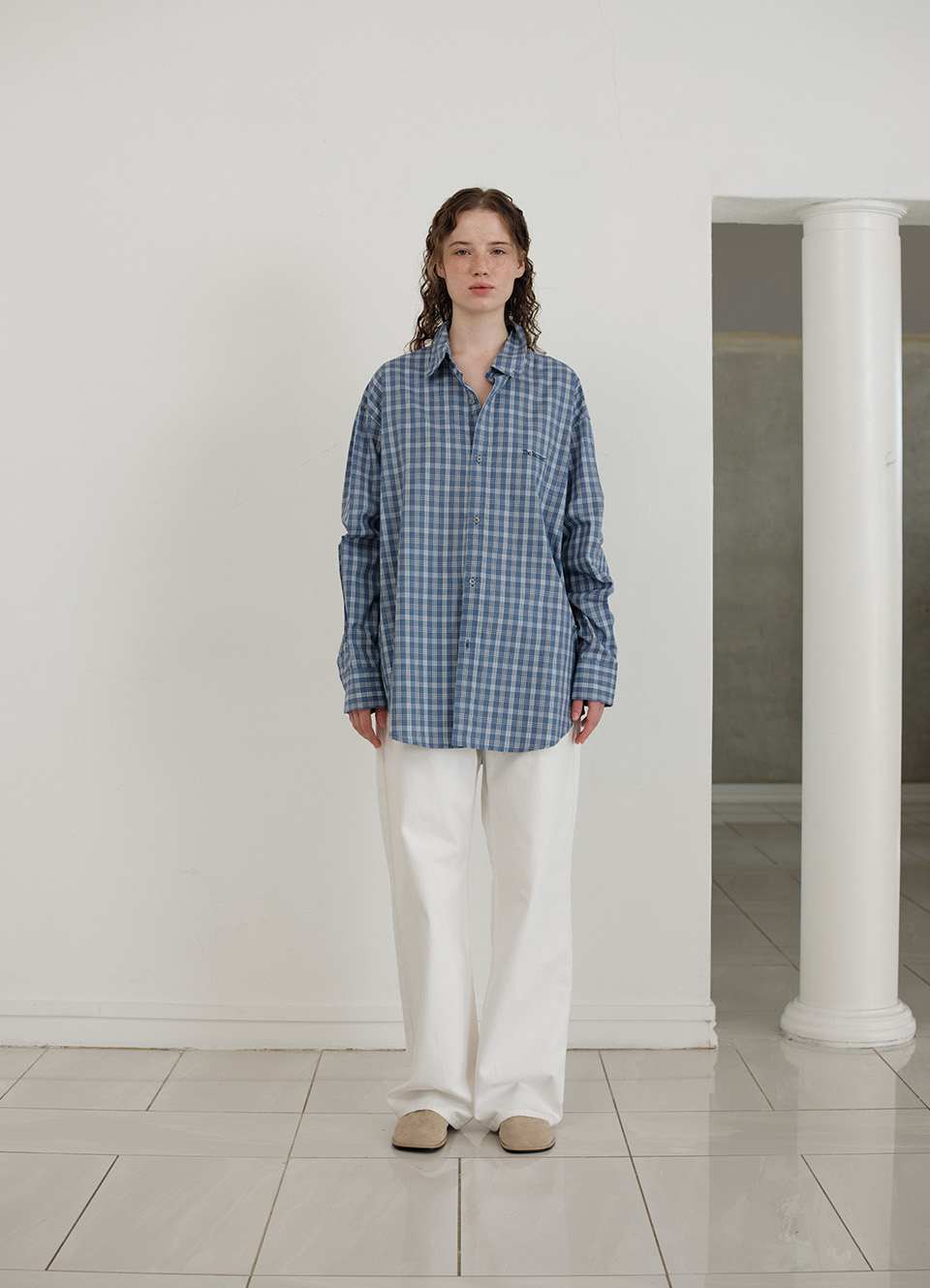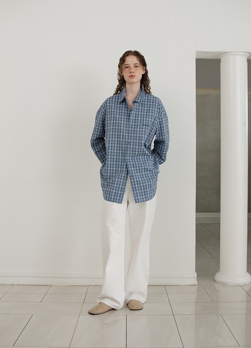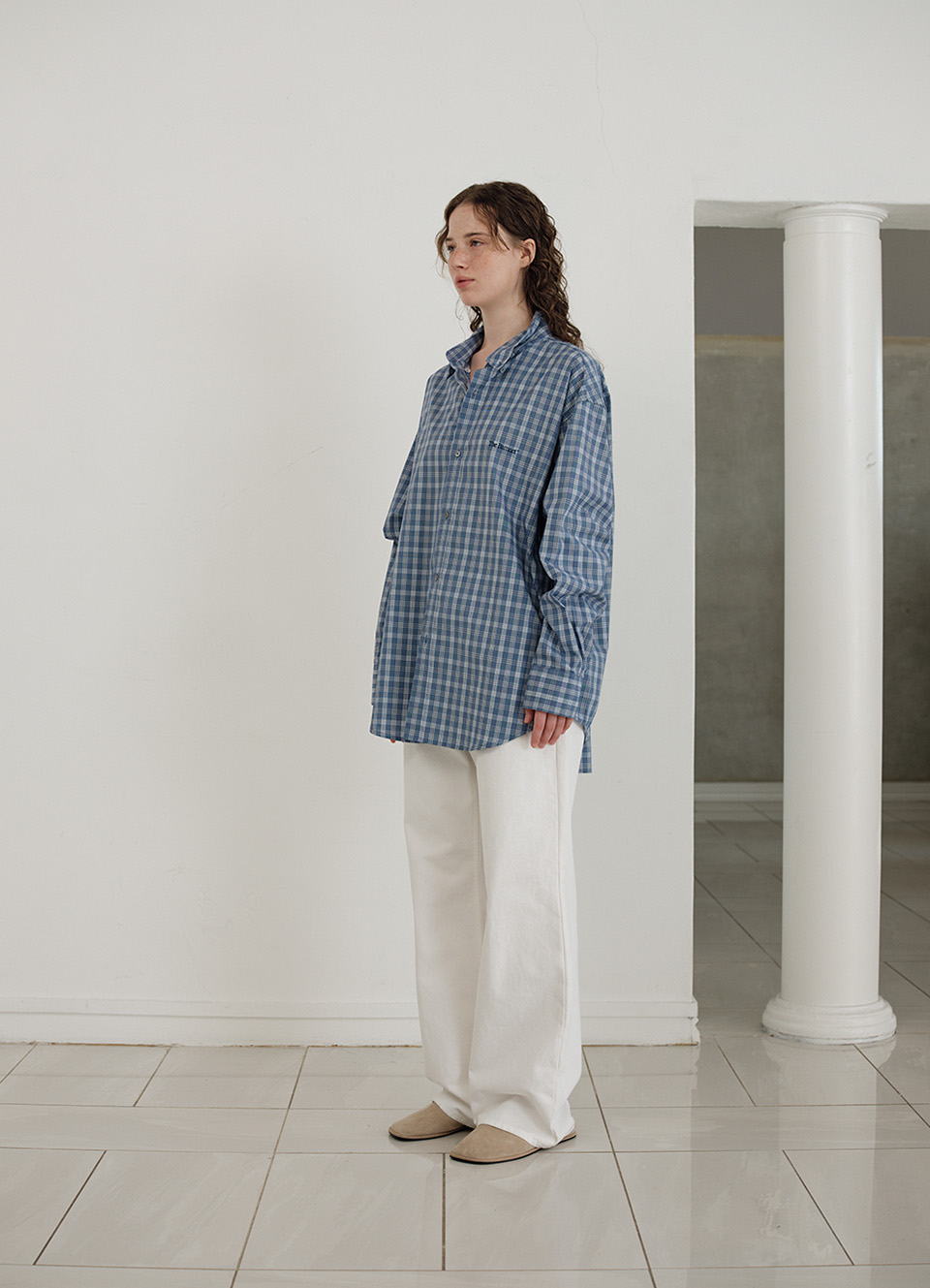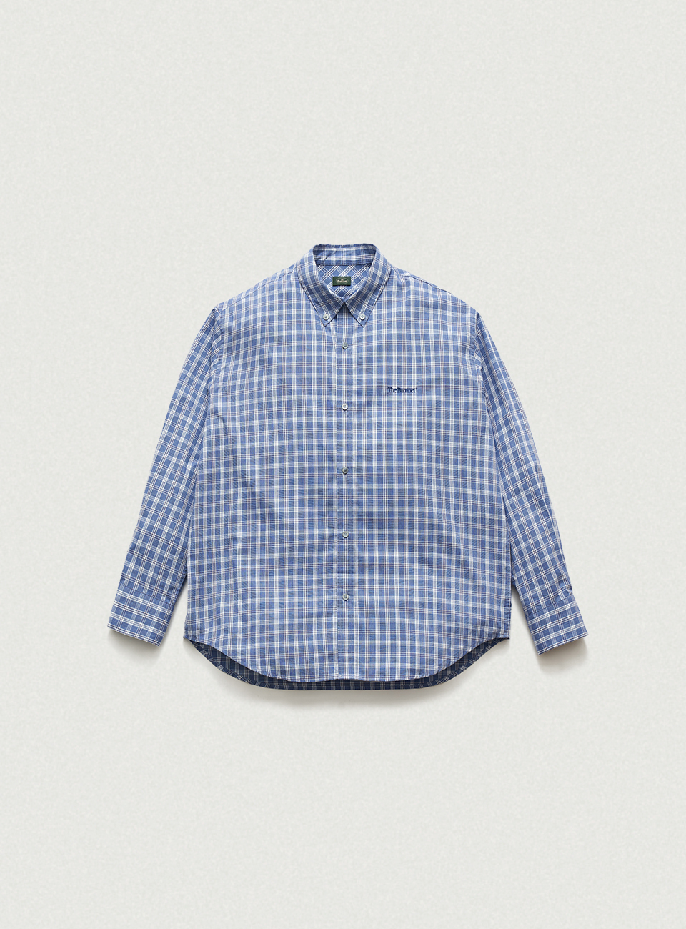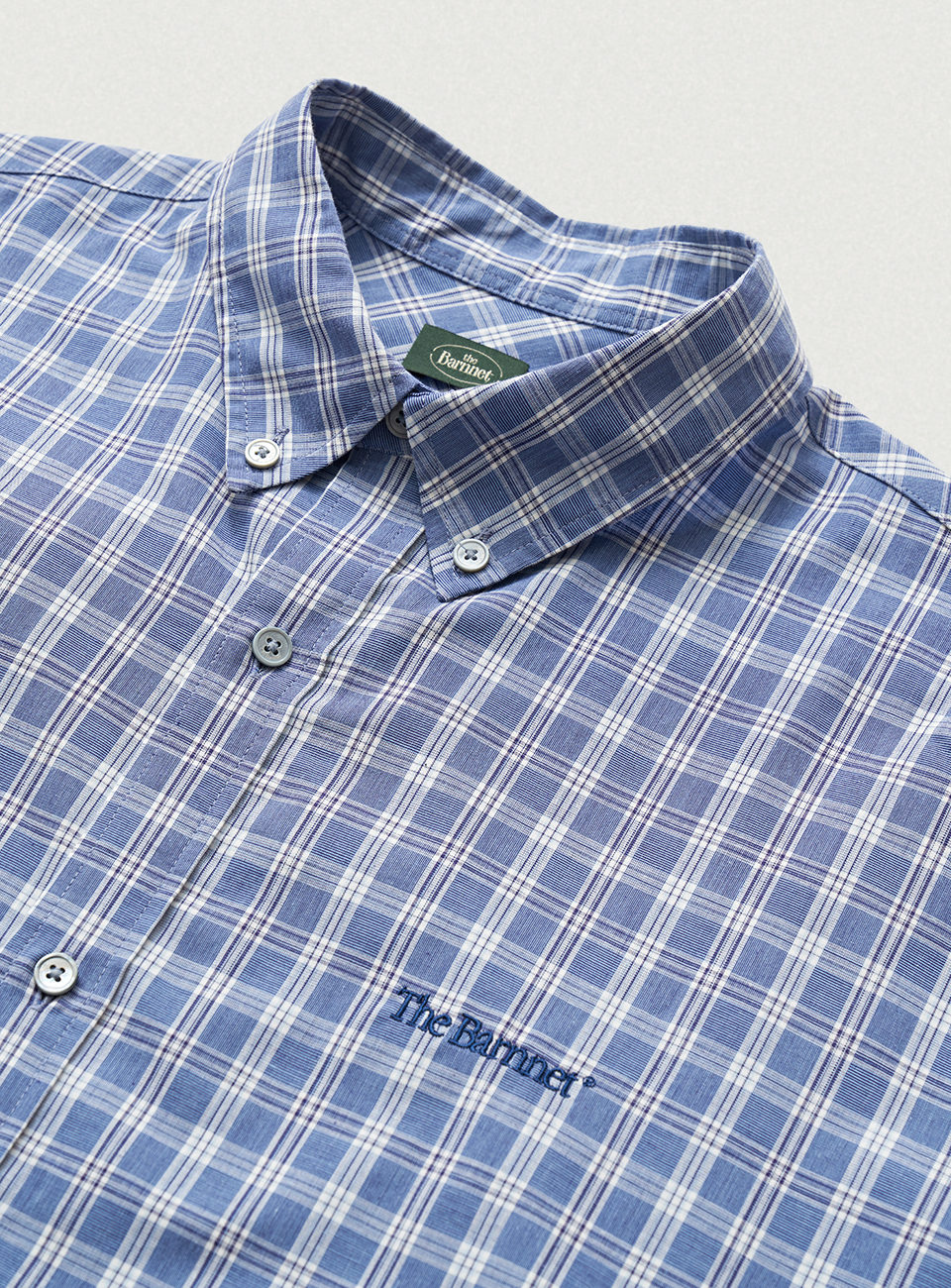 ファブリックのチェックパターンを構成するブルーカラーを用いたロゴ刺繍