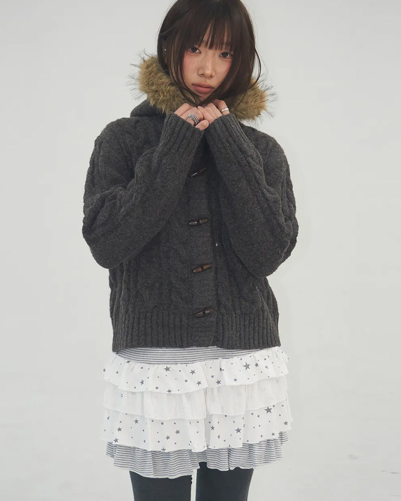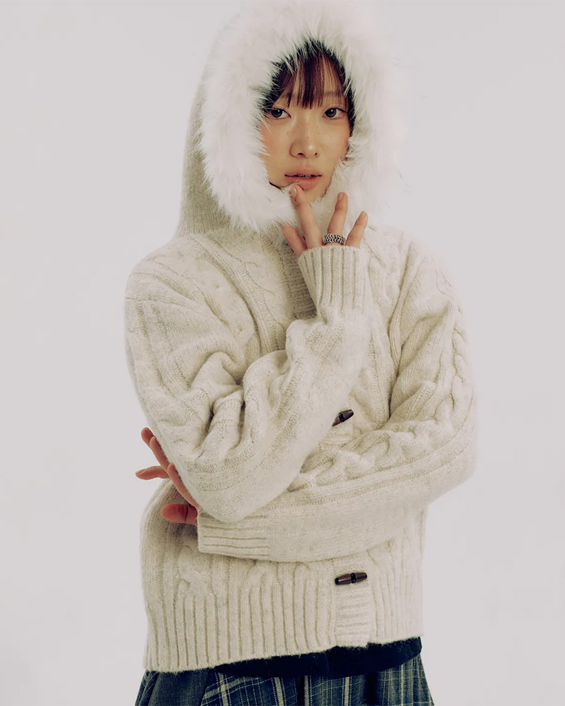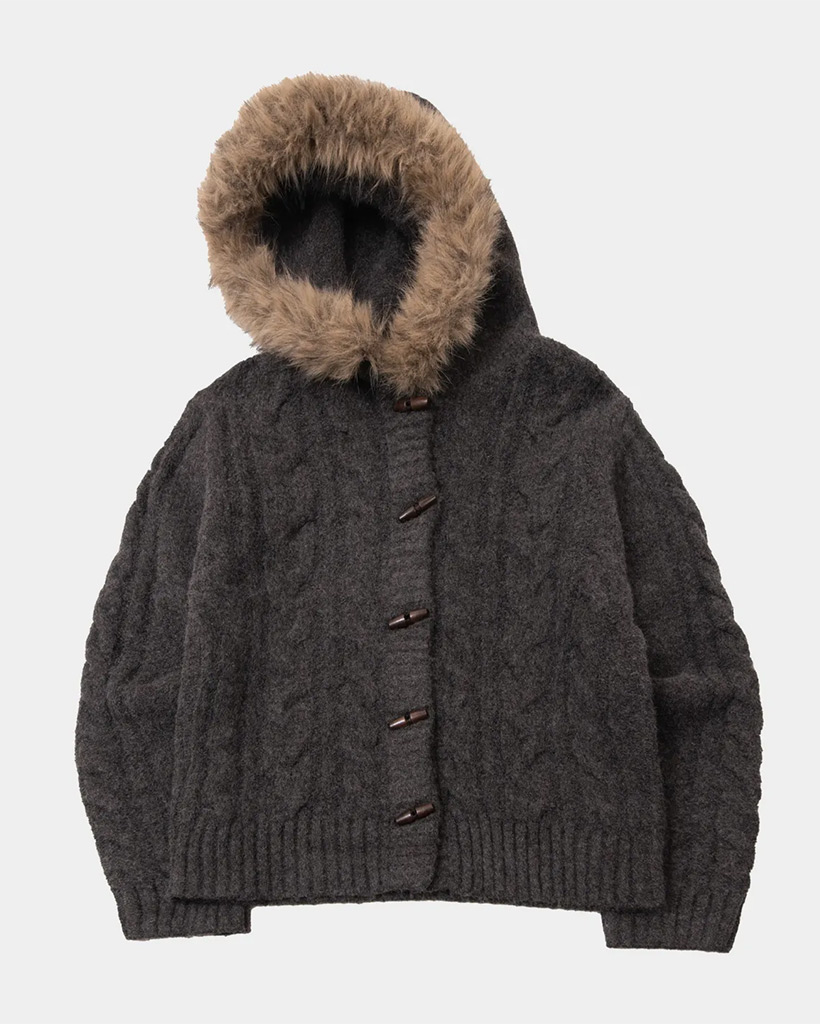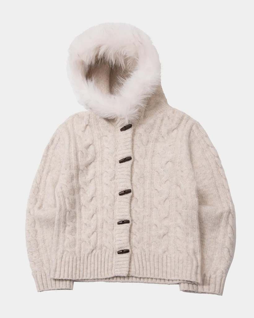 Soft Cable Knit Toggle Fur Trimmed Hooded Cardigan Jacket_2COLOR
