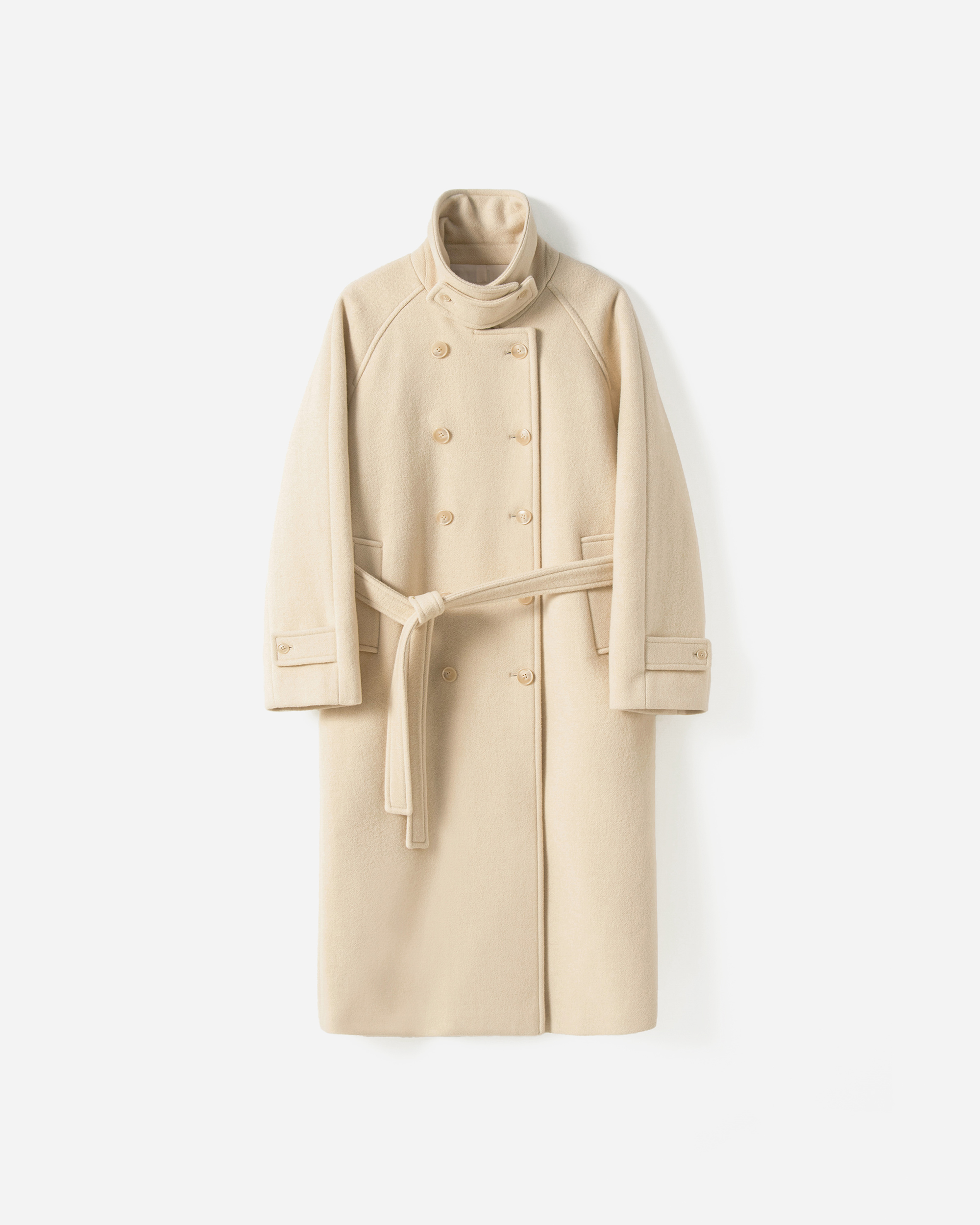 自然な曲線を描くラグランスリーブと程よいストレートシルエットが調和し、シンプルで洗練されたバルマカーンコートデザインを実現しました。