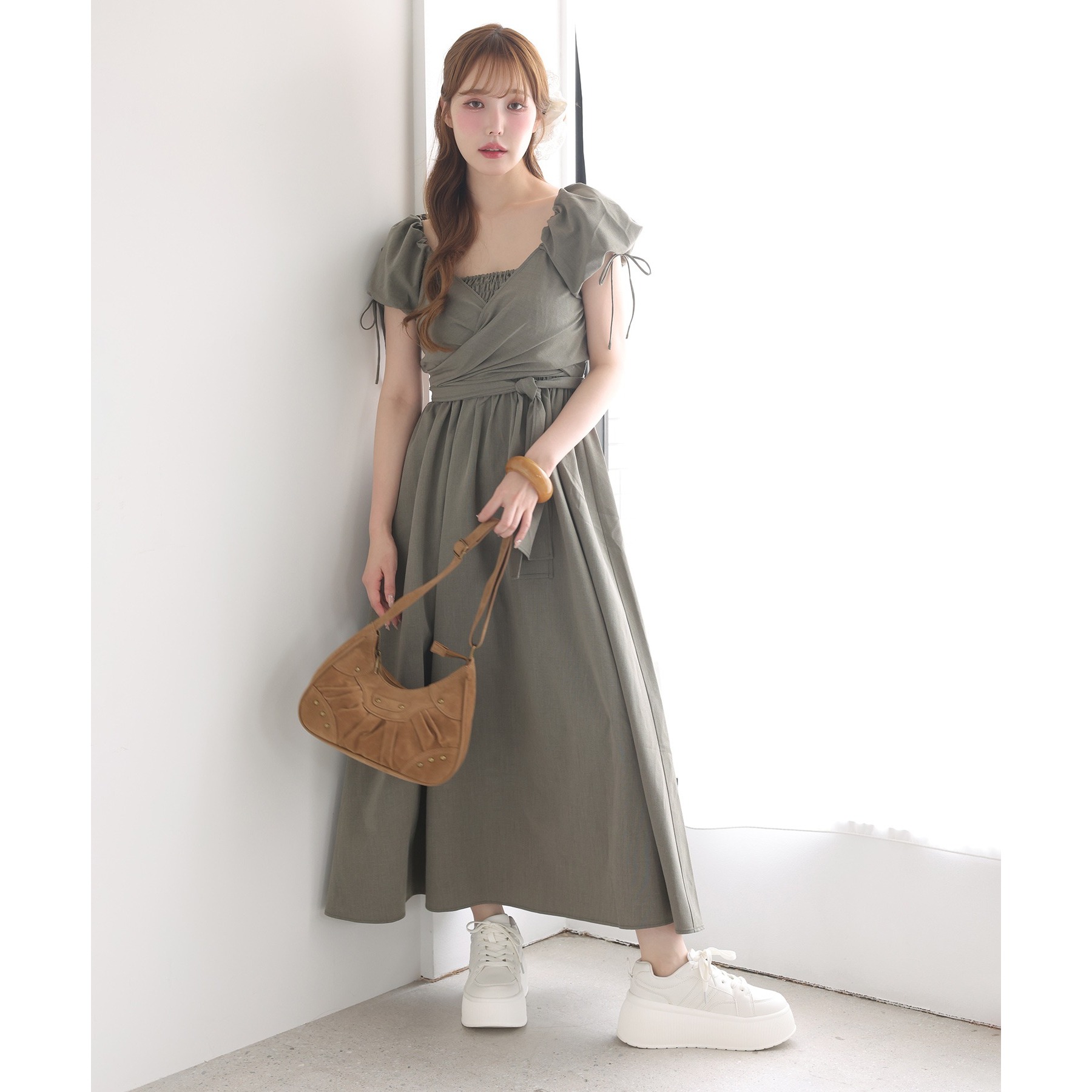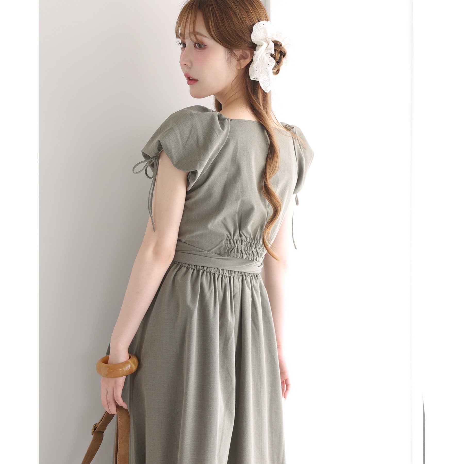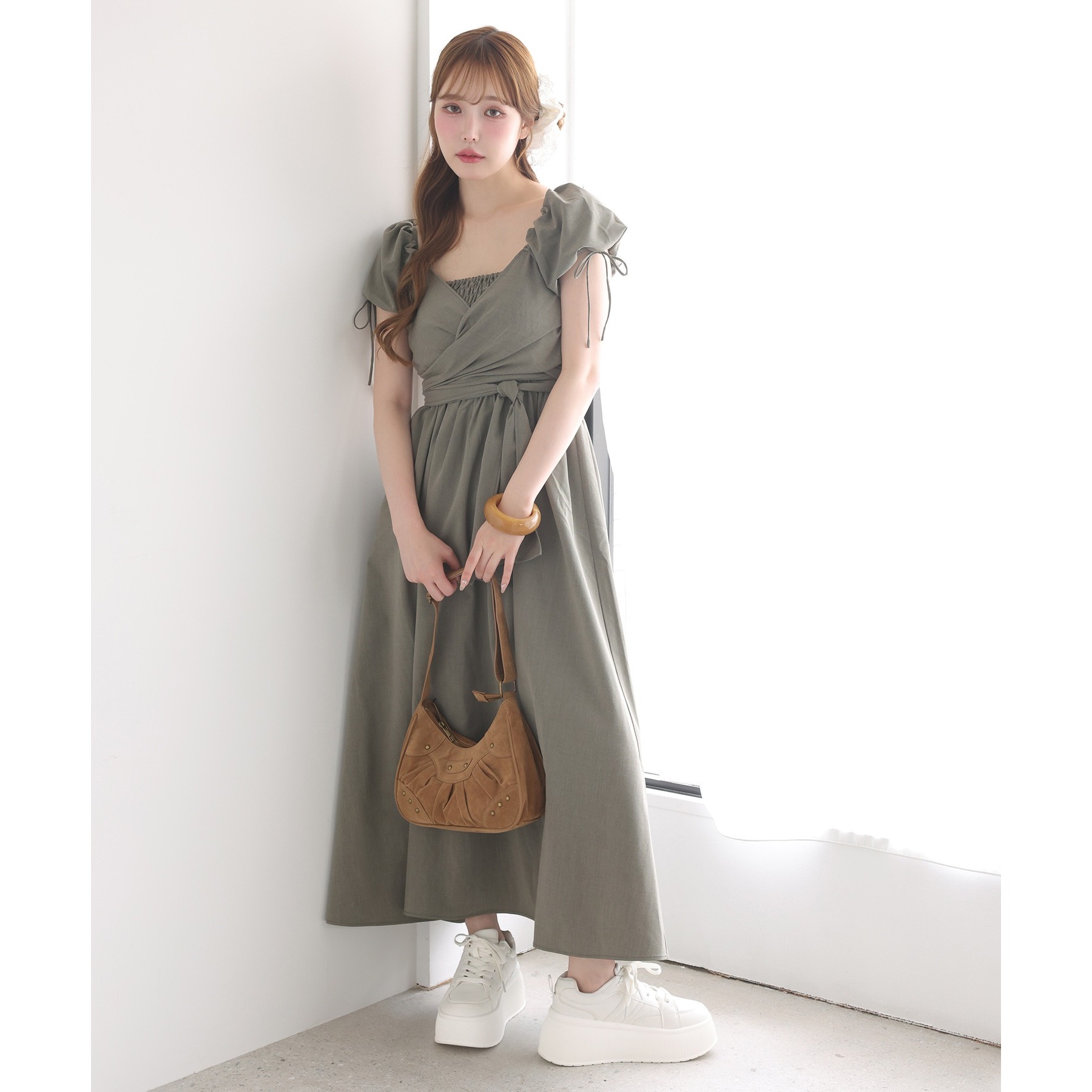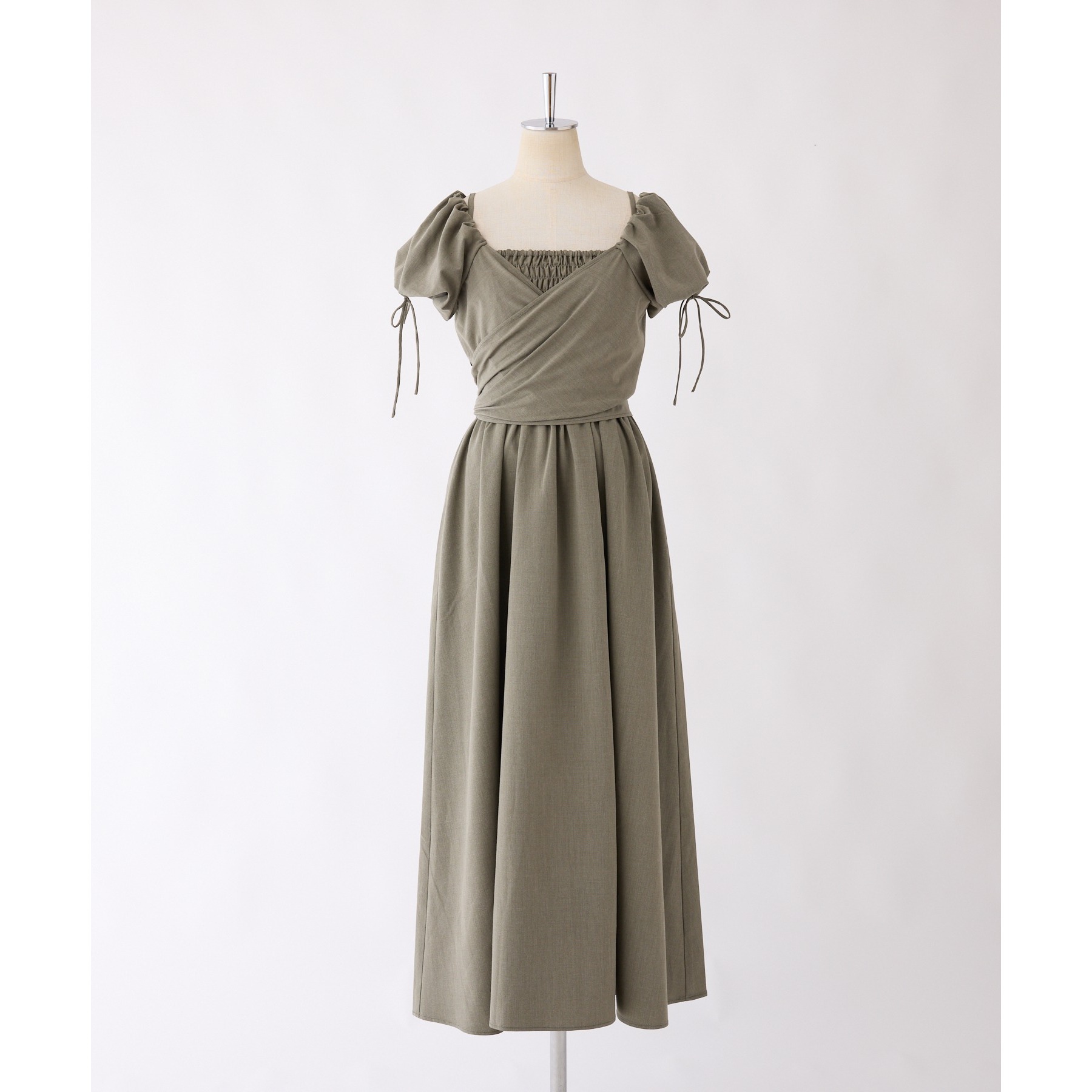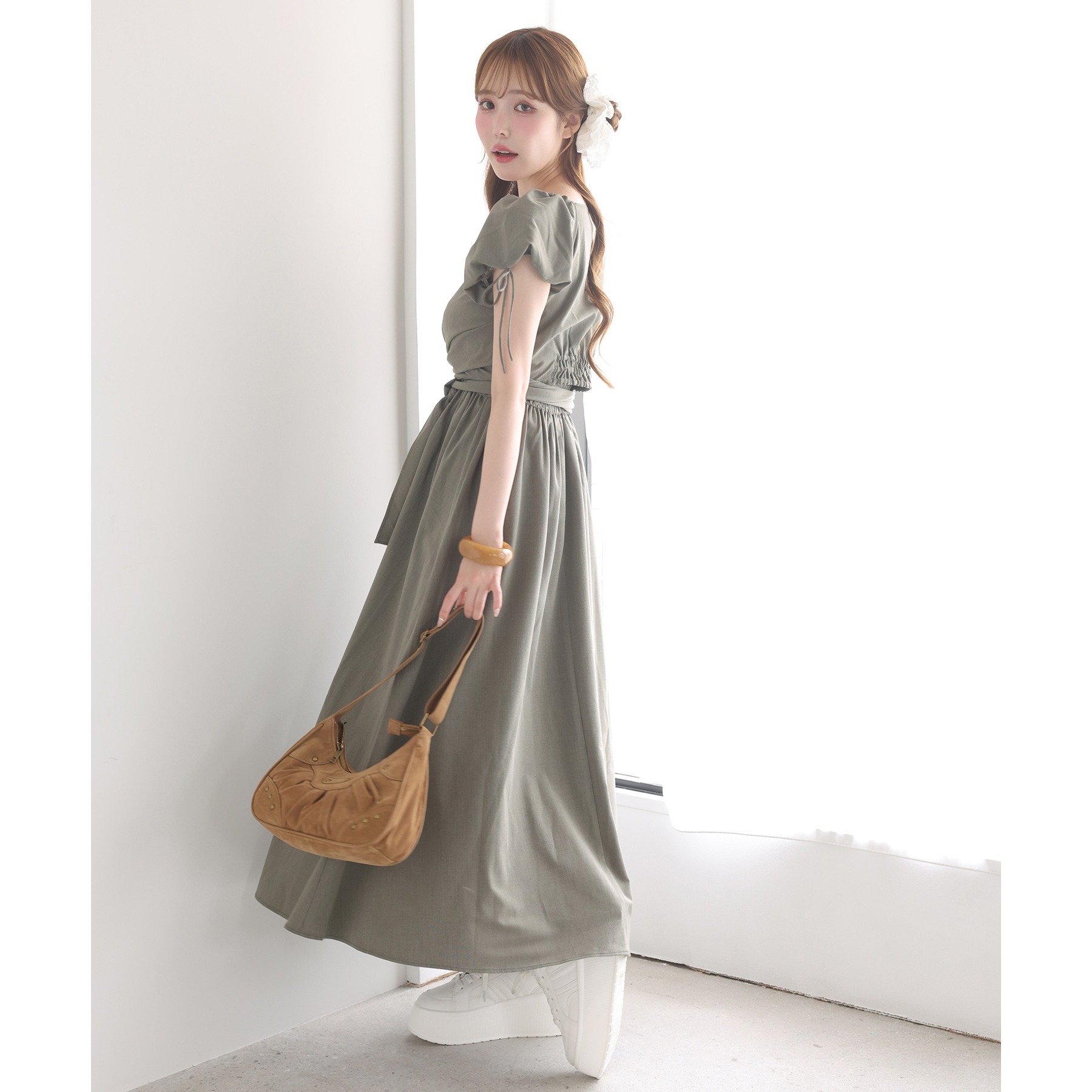 シャーリングデザインがウエストラインもキレイに見せてくれるロングワンピースとブラウスのセットアイテム