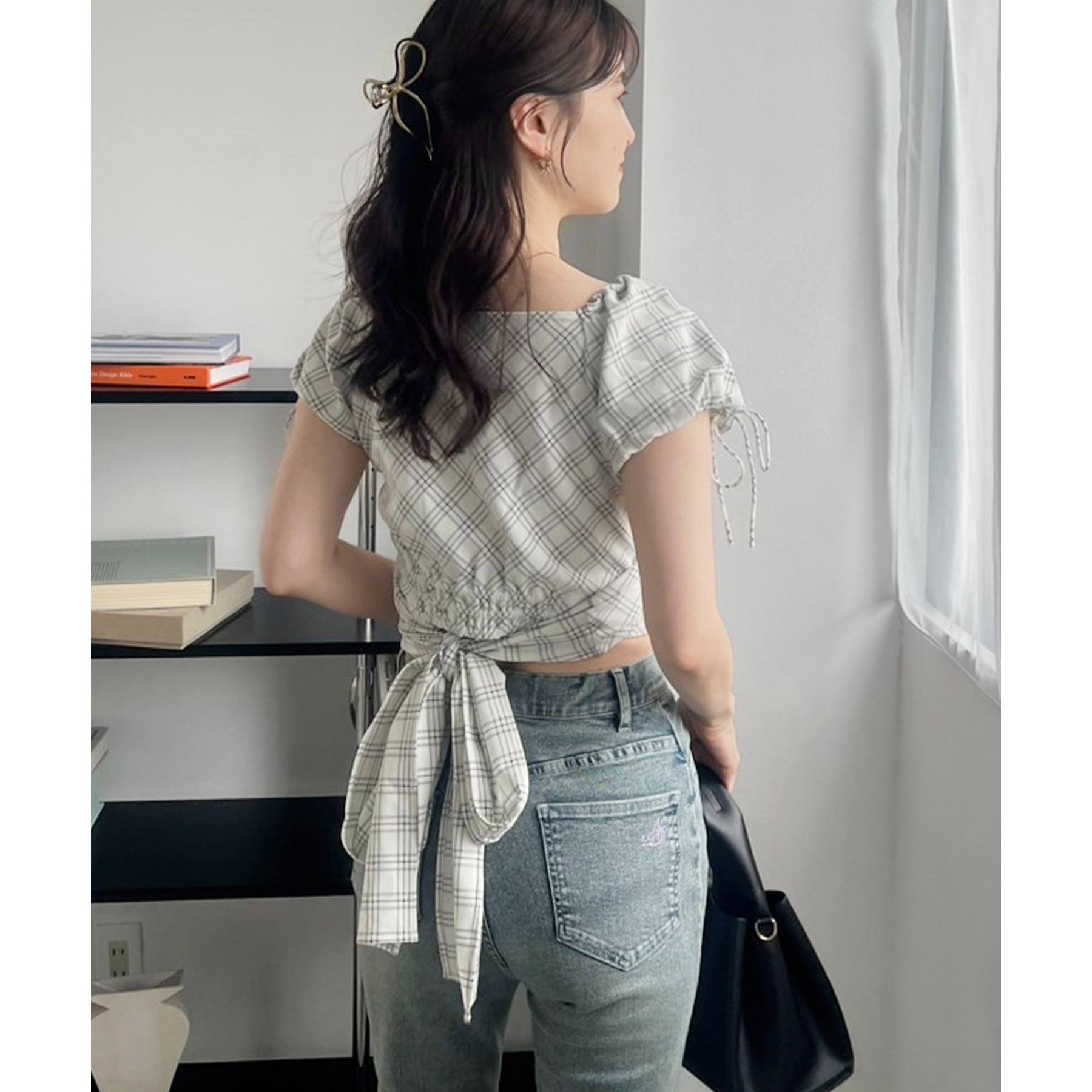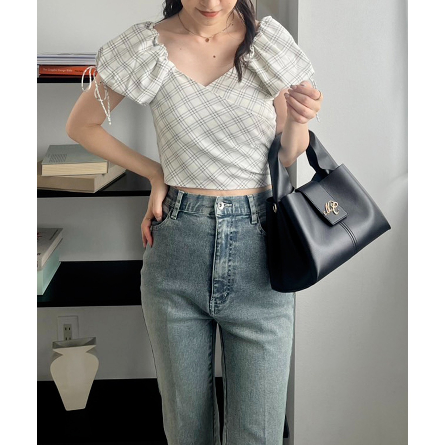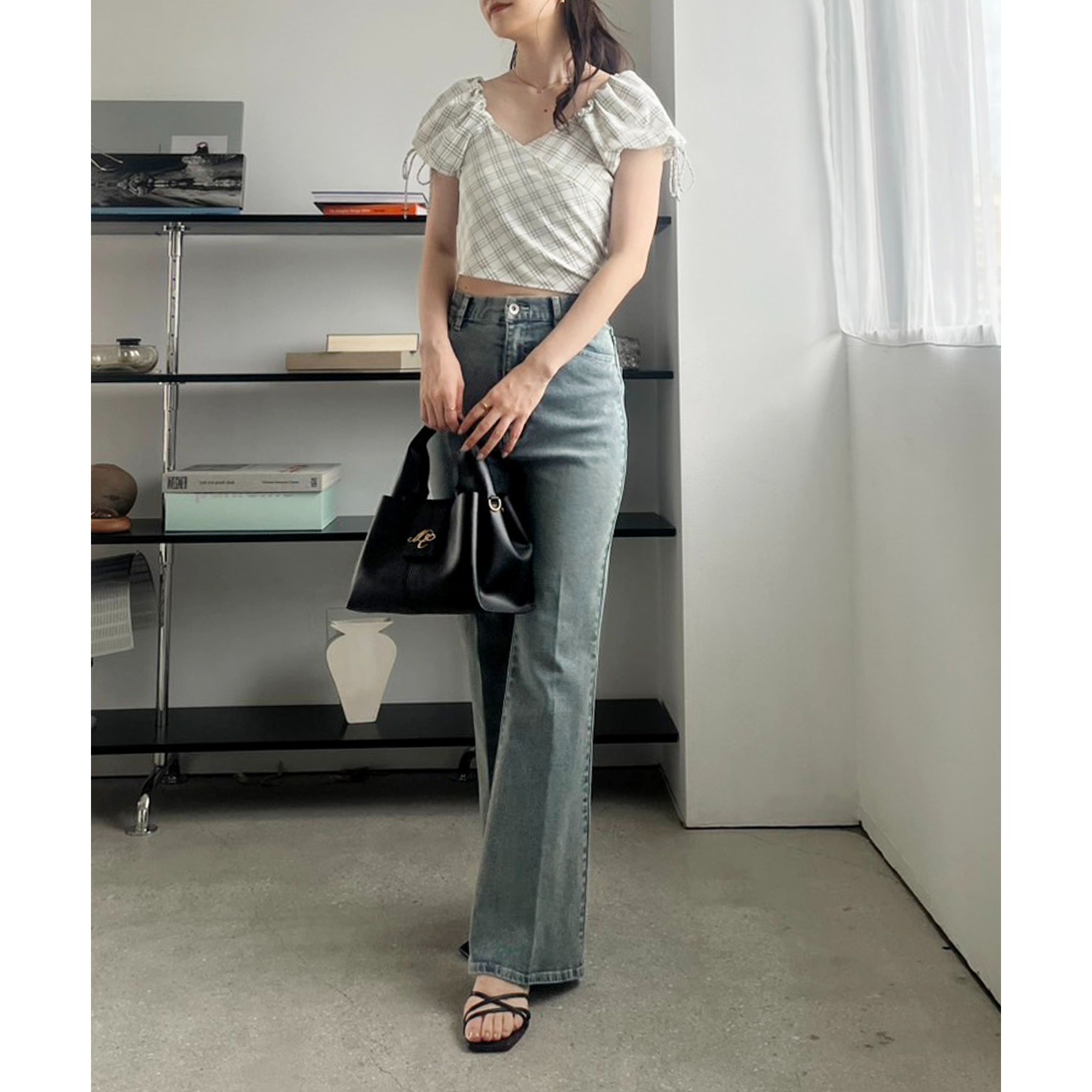 トップスはコンパクトなクロップド丈で足長効果を演出します。