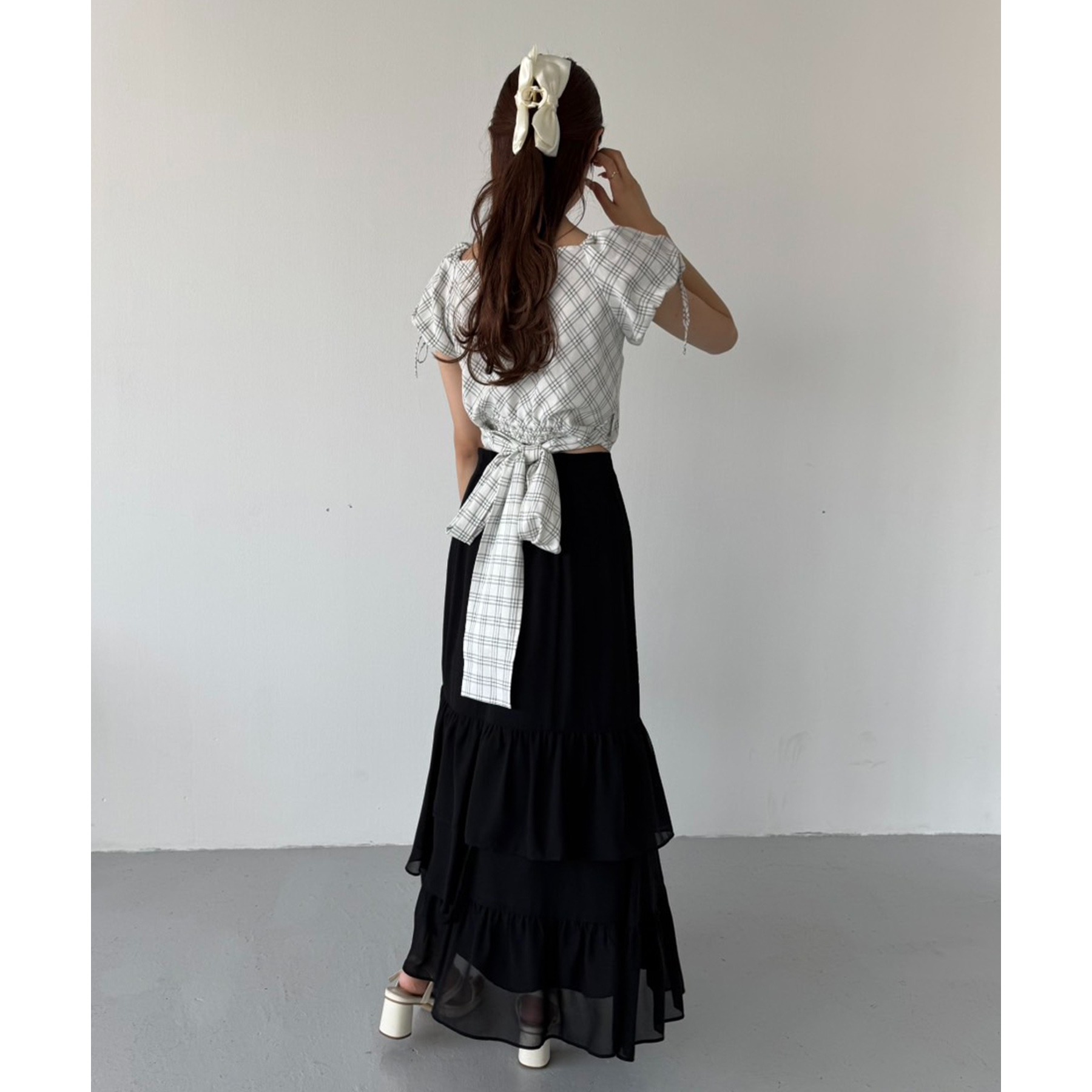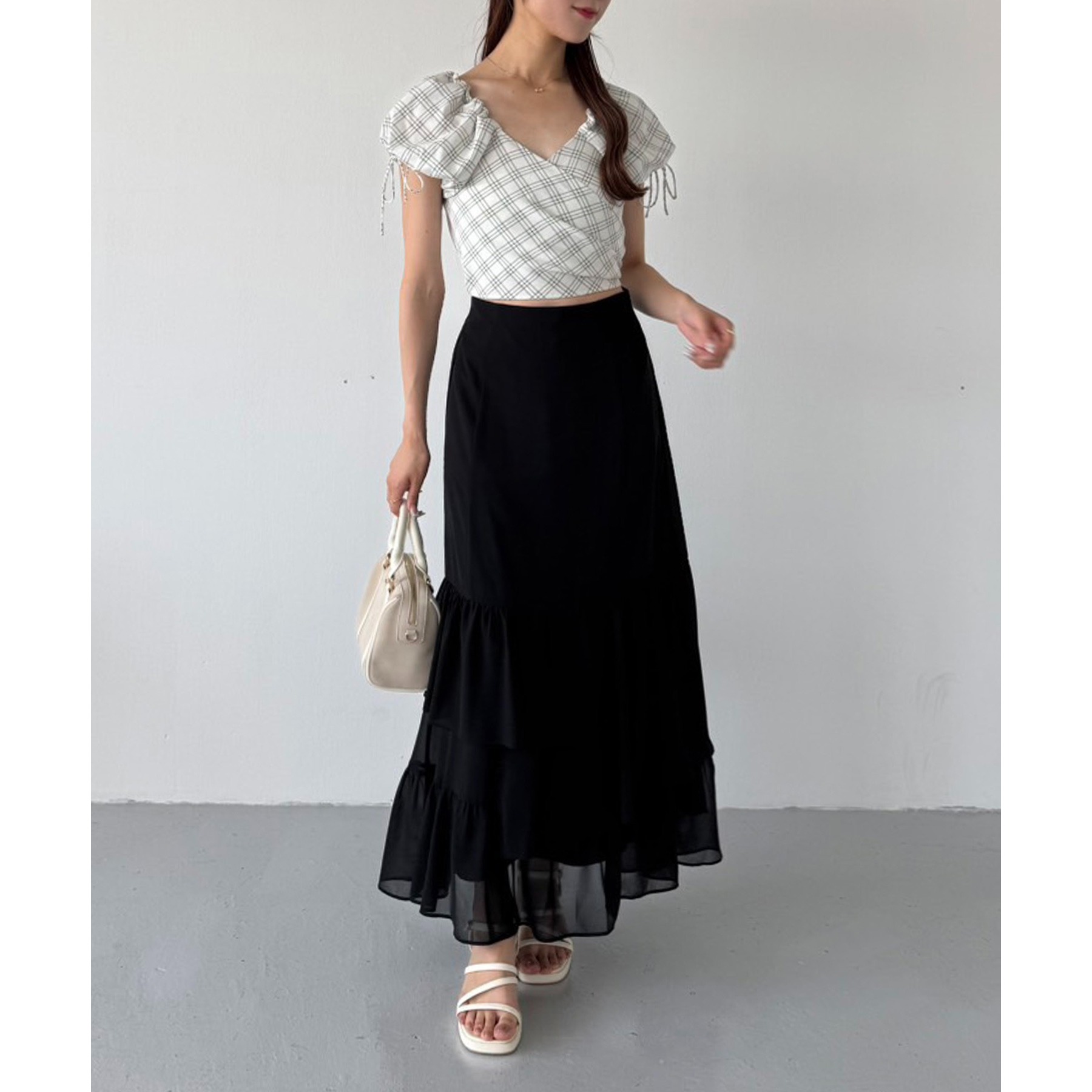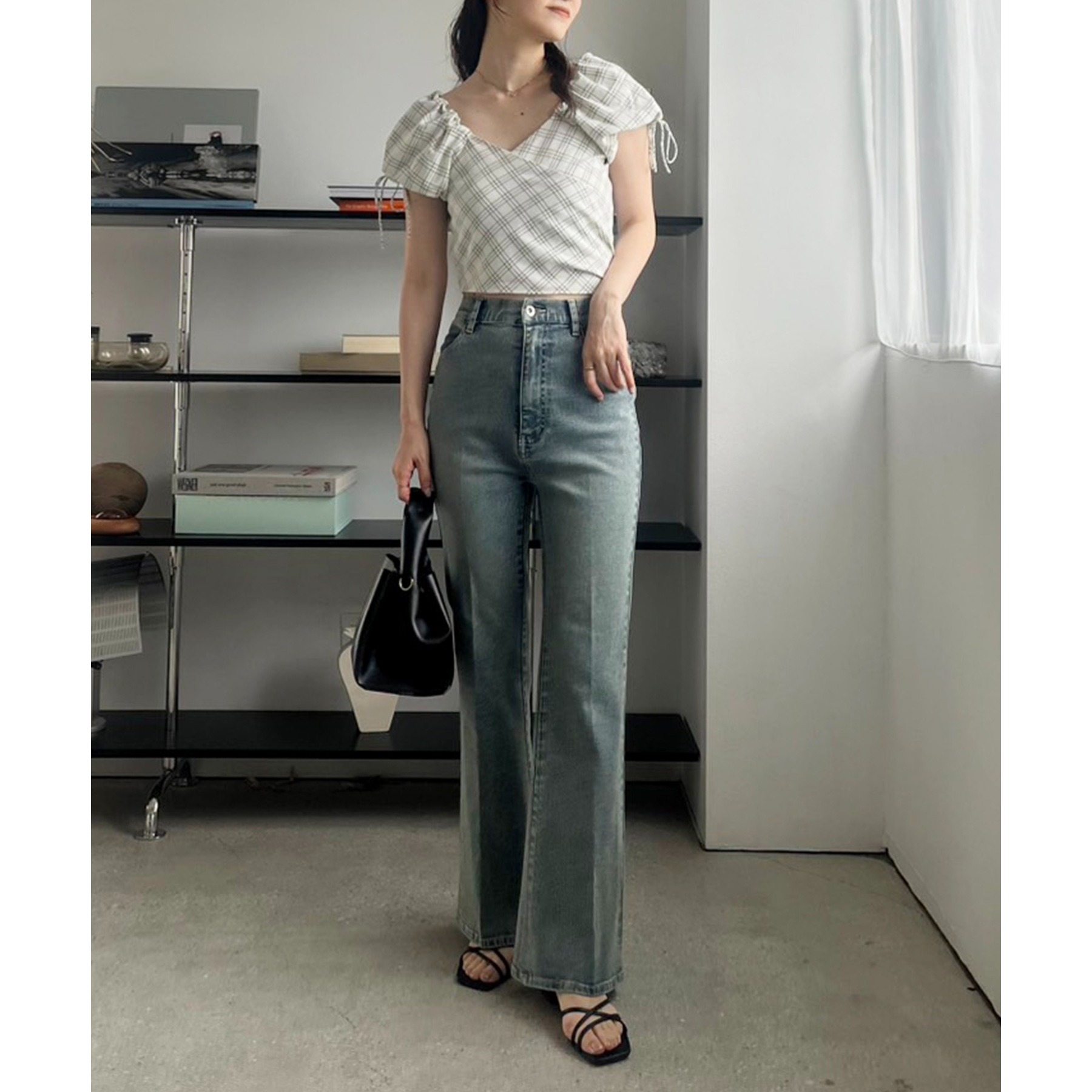 トップスはコンパクトなクロップド丈で足長効果を演出します。