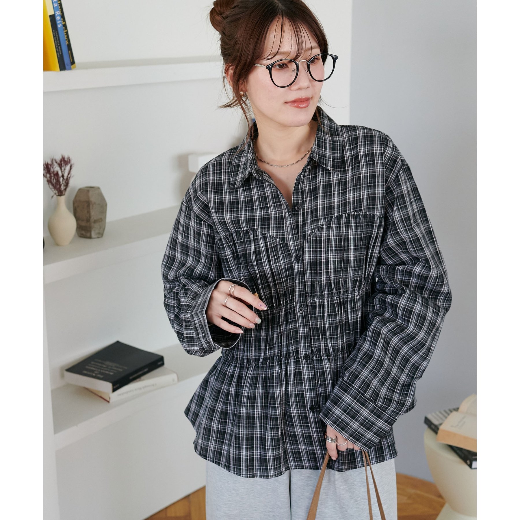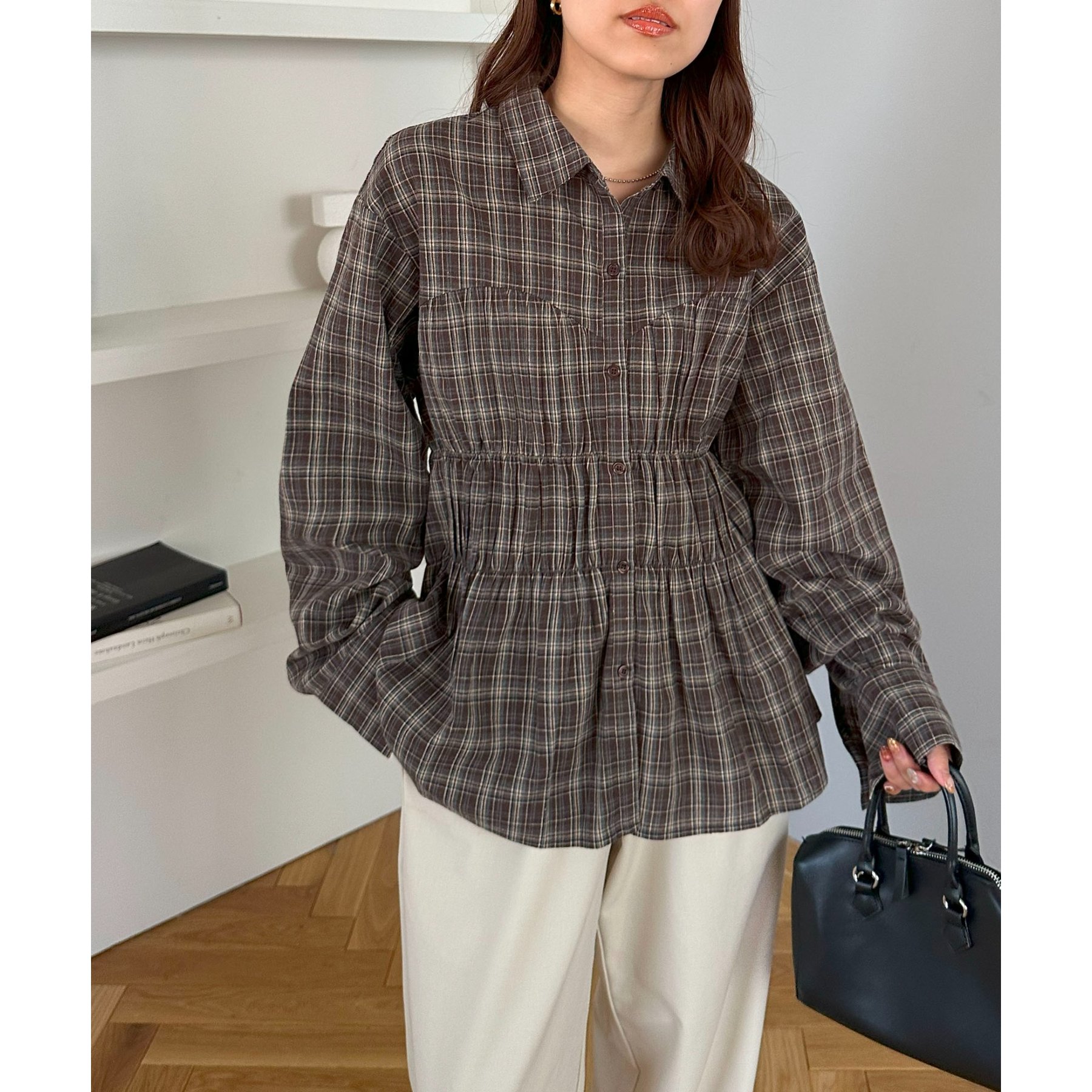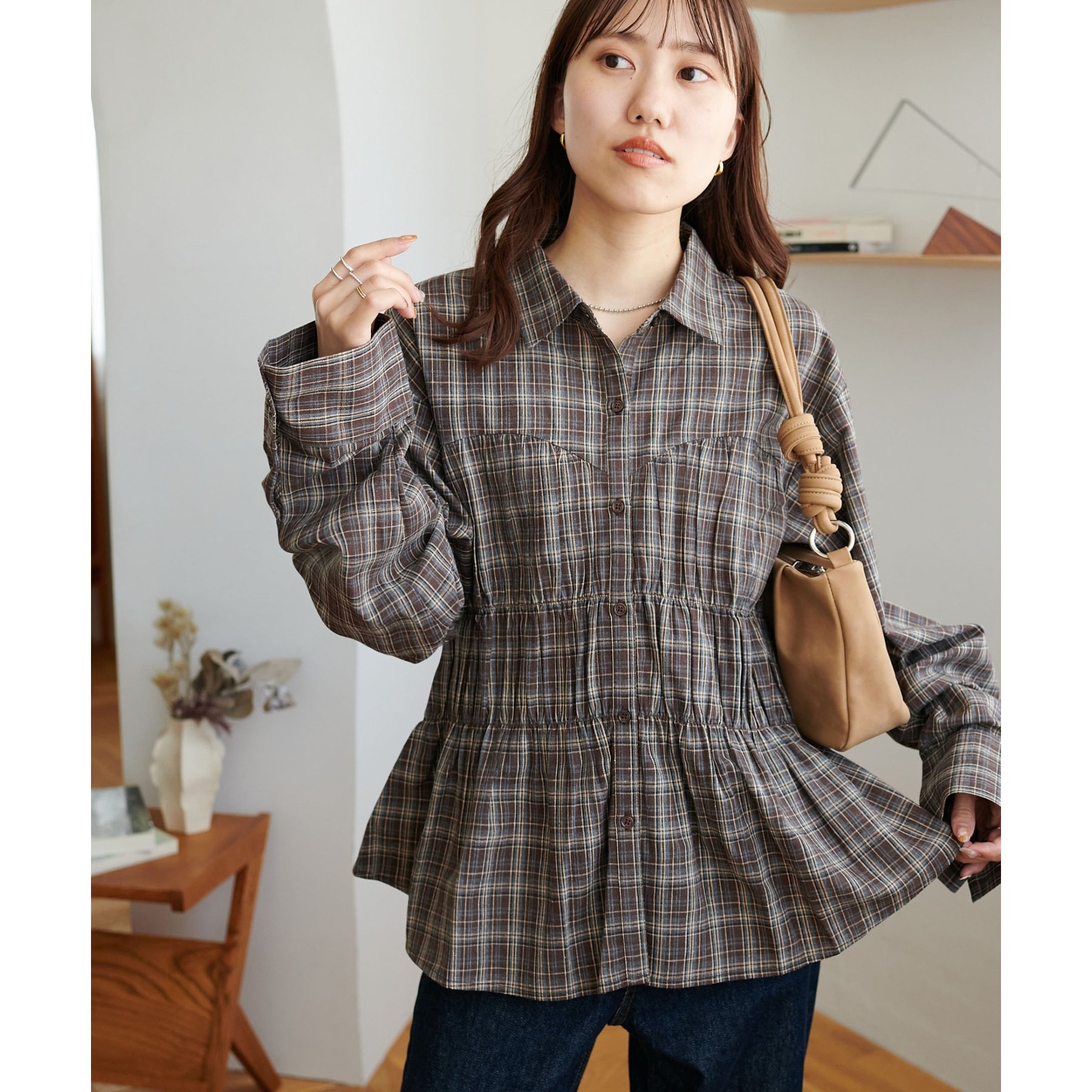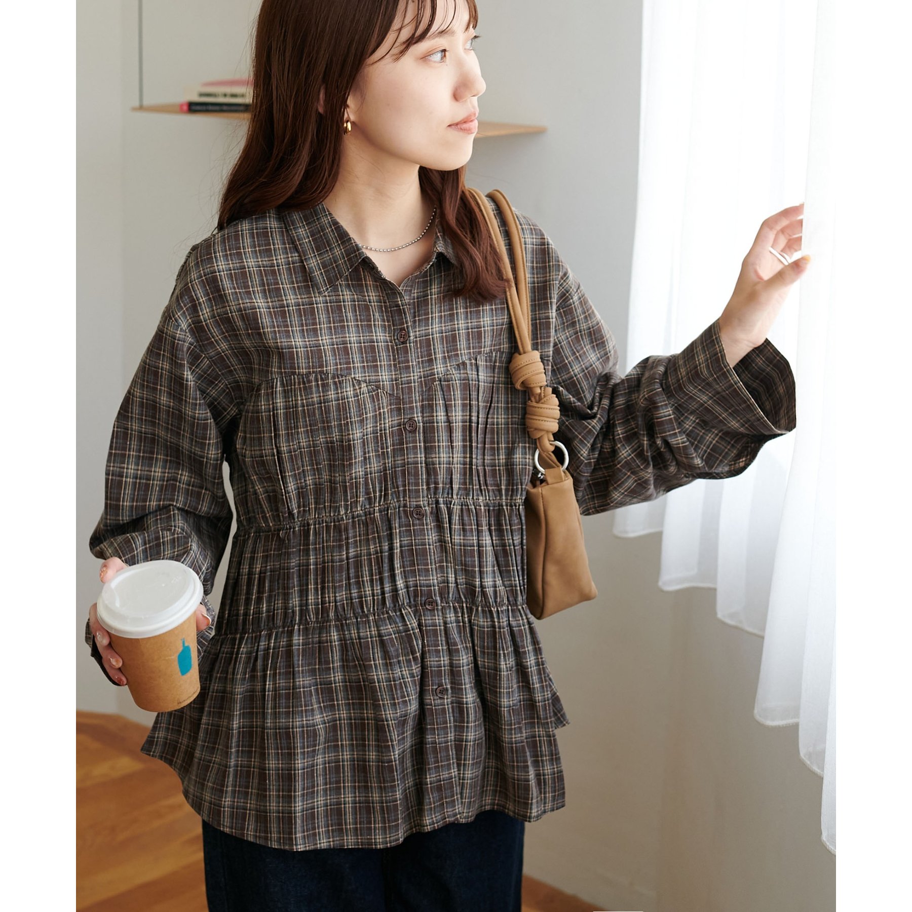 柔らかなシルエットが女性らしい、シャーリングチェックシャツ