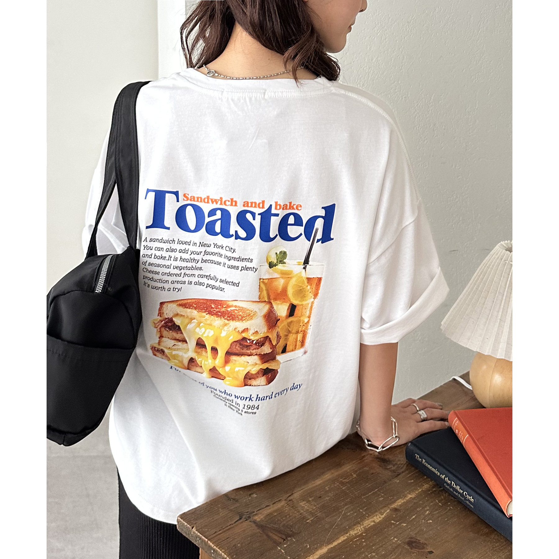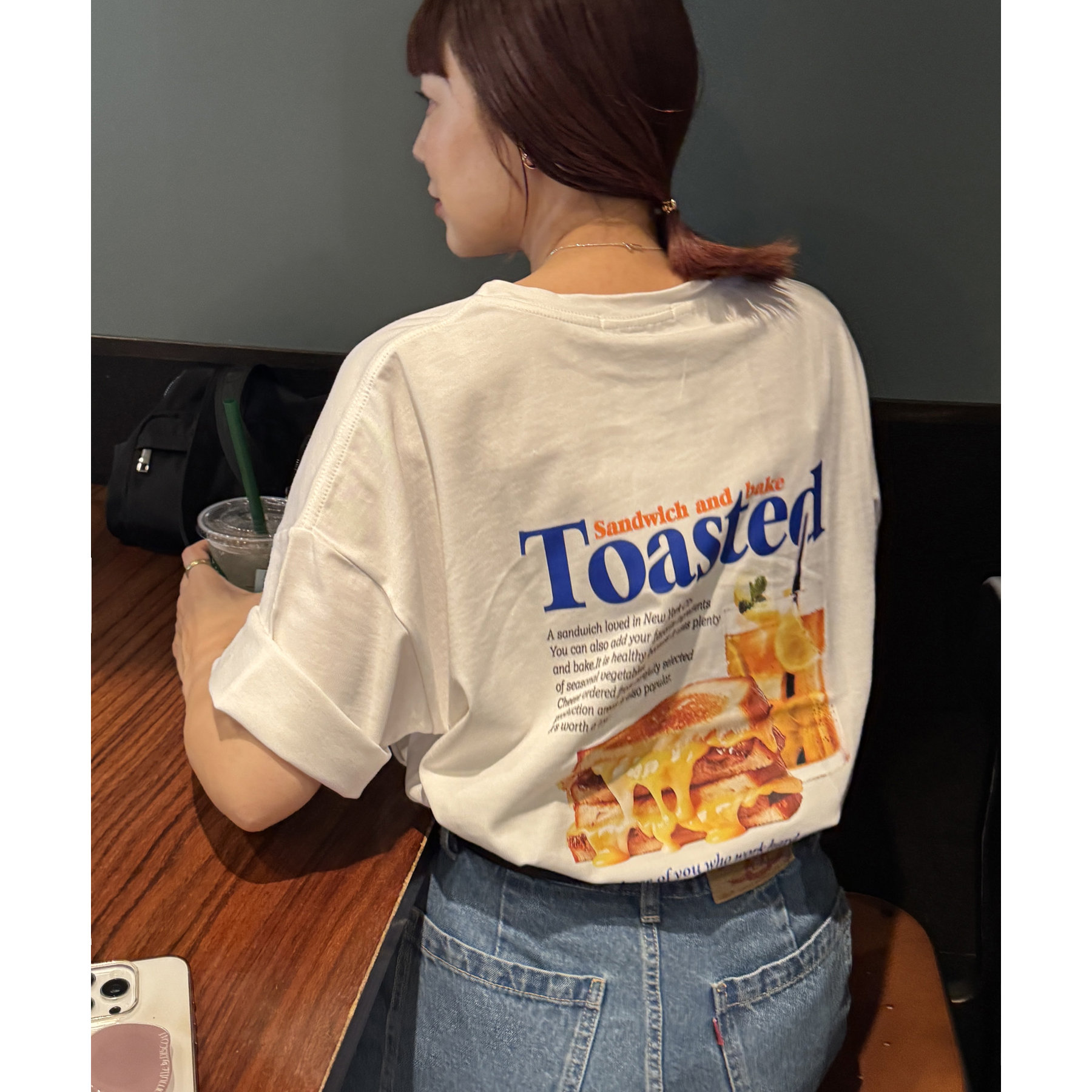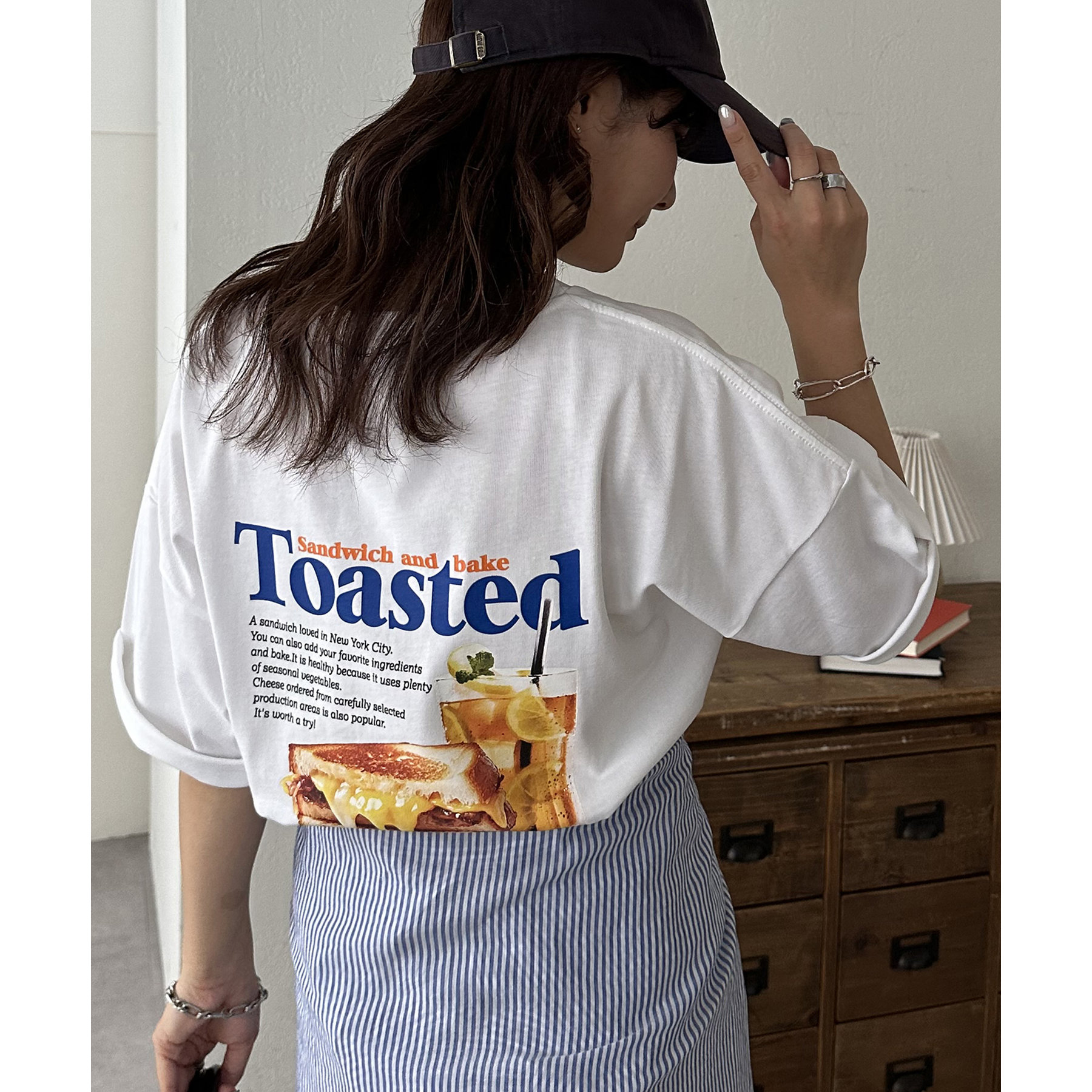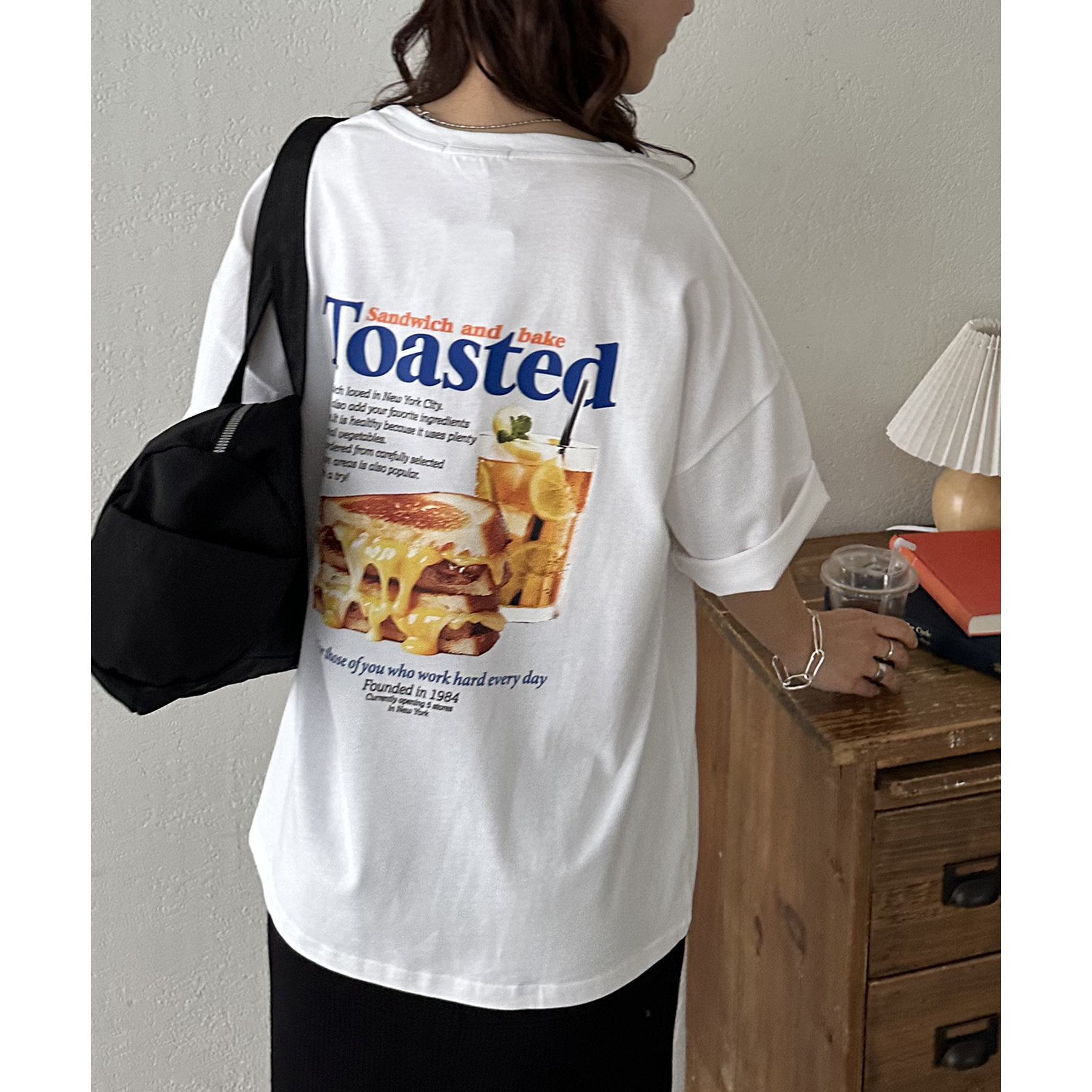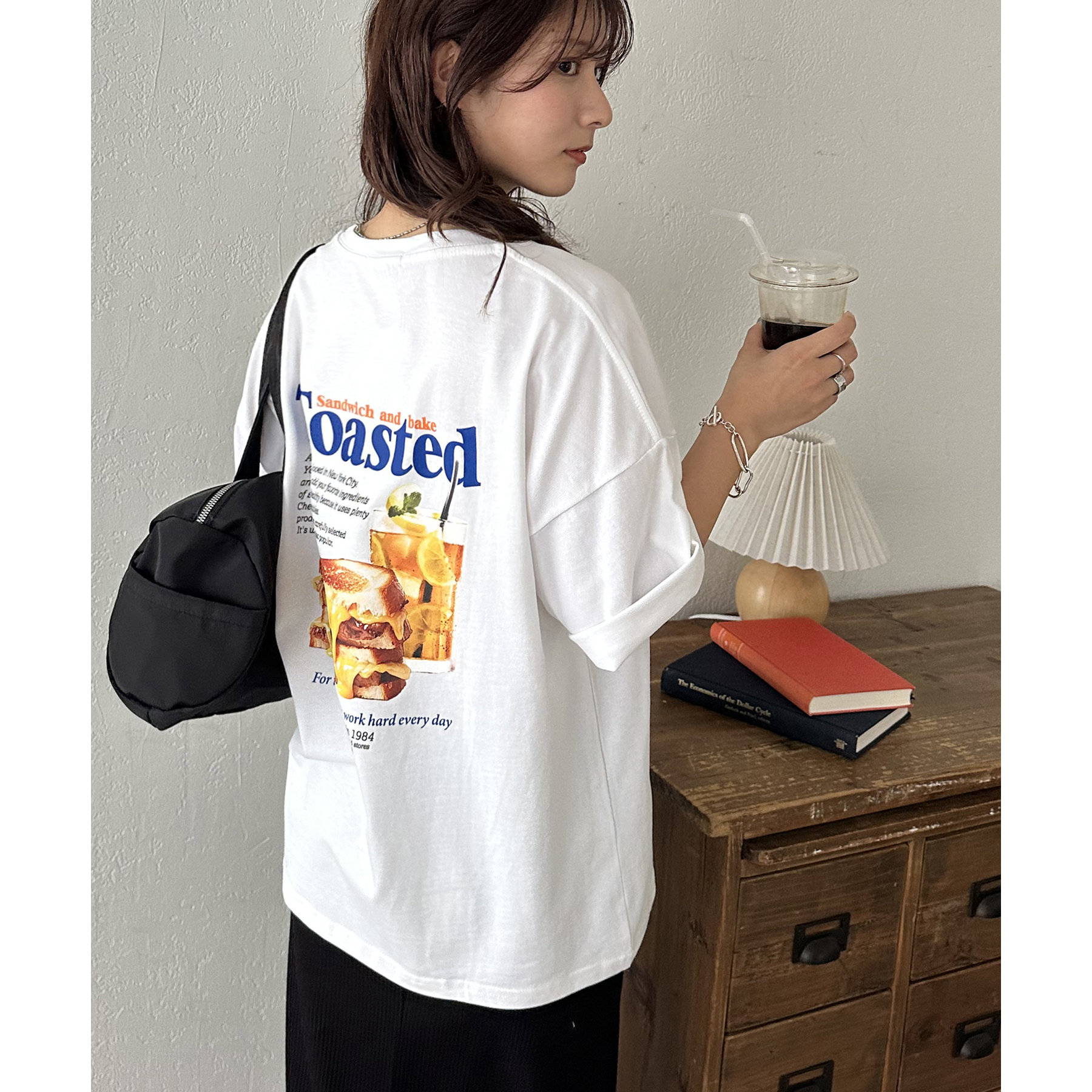 目を惹くユニークなトーストとドリンクのフォトプリントが背中に大胆にあしらわれたビッグTシャツ。