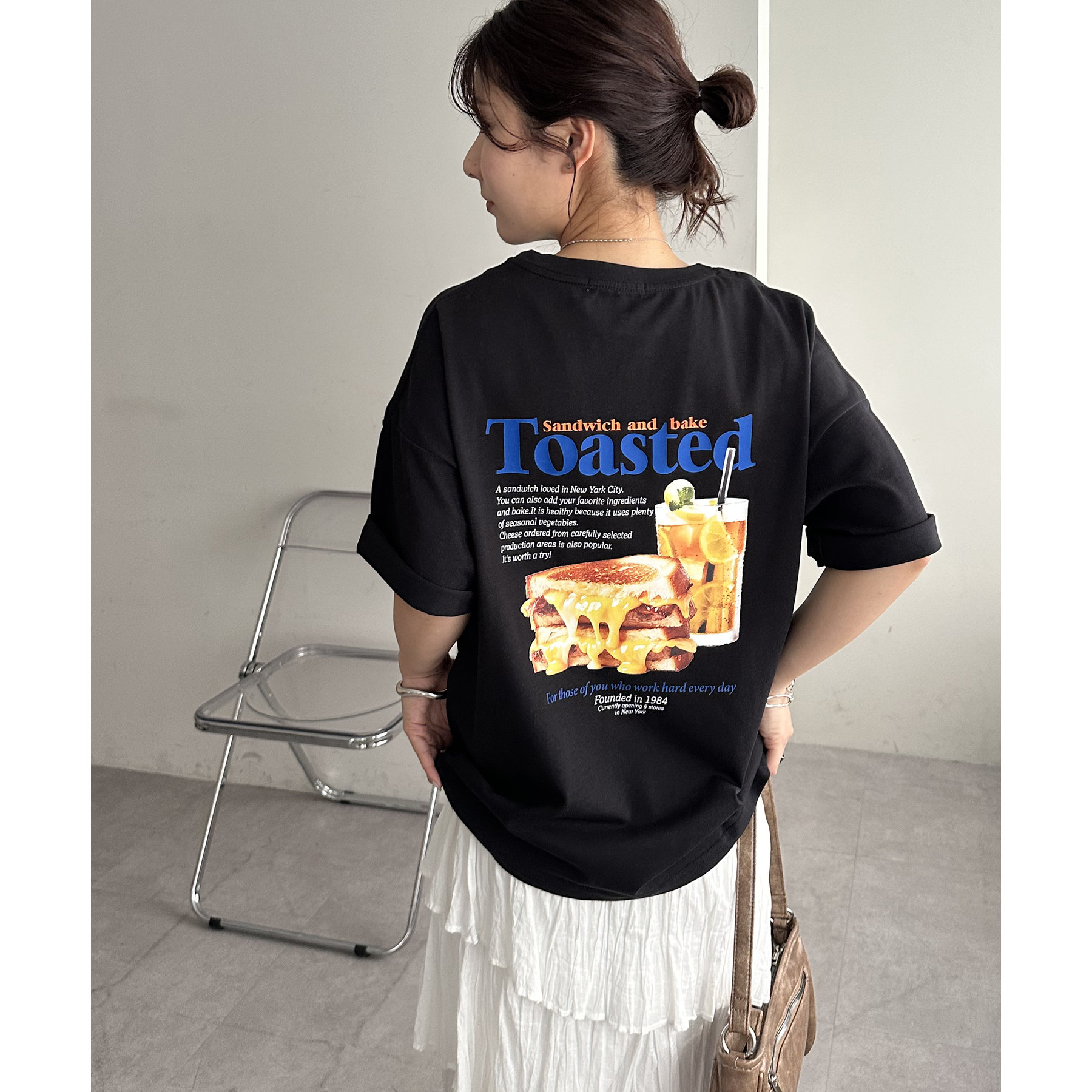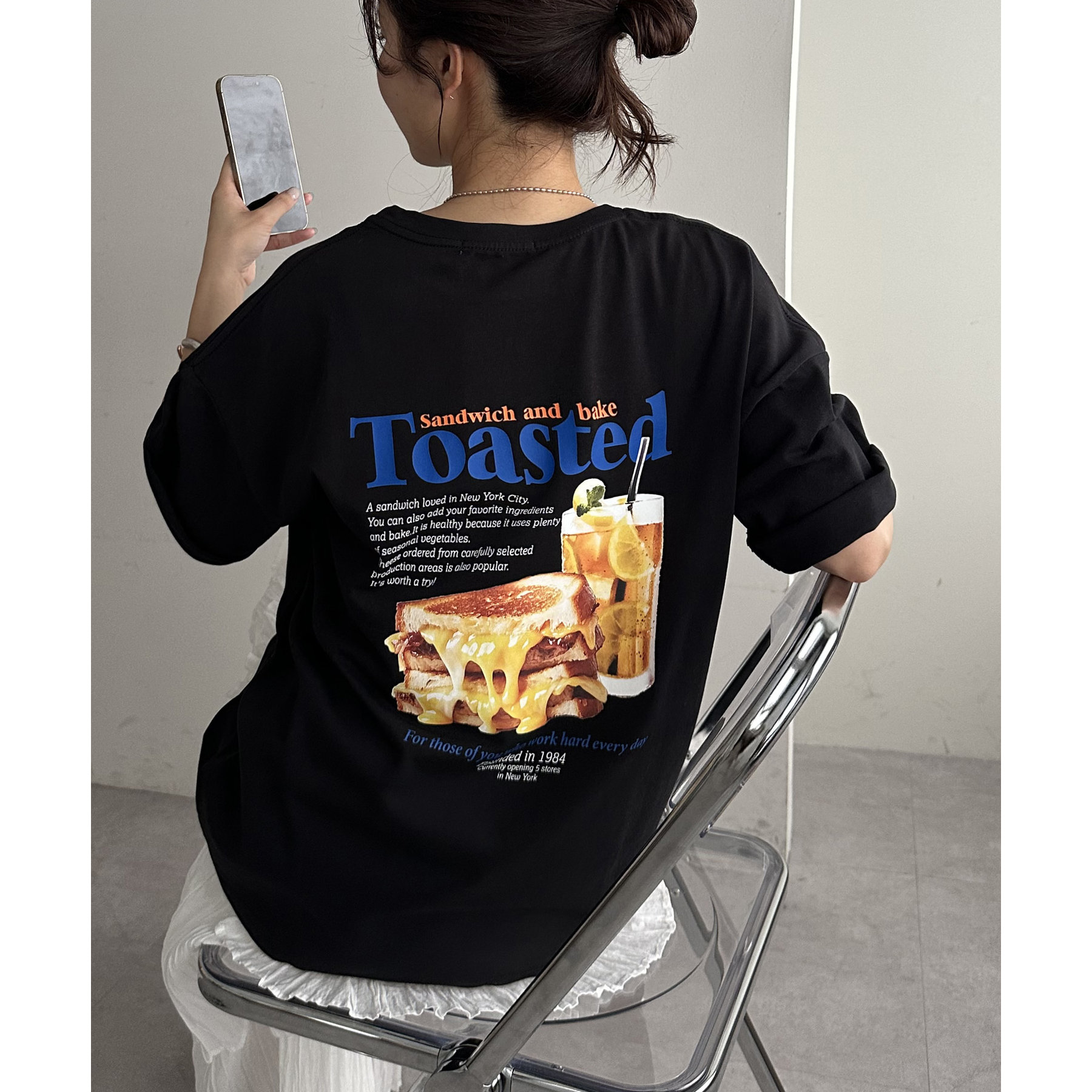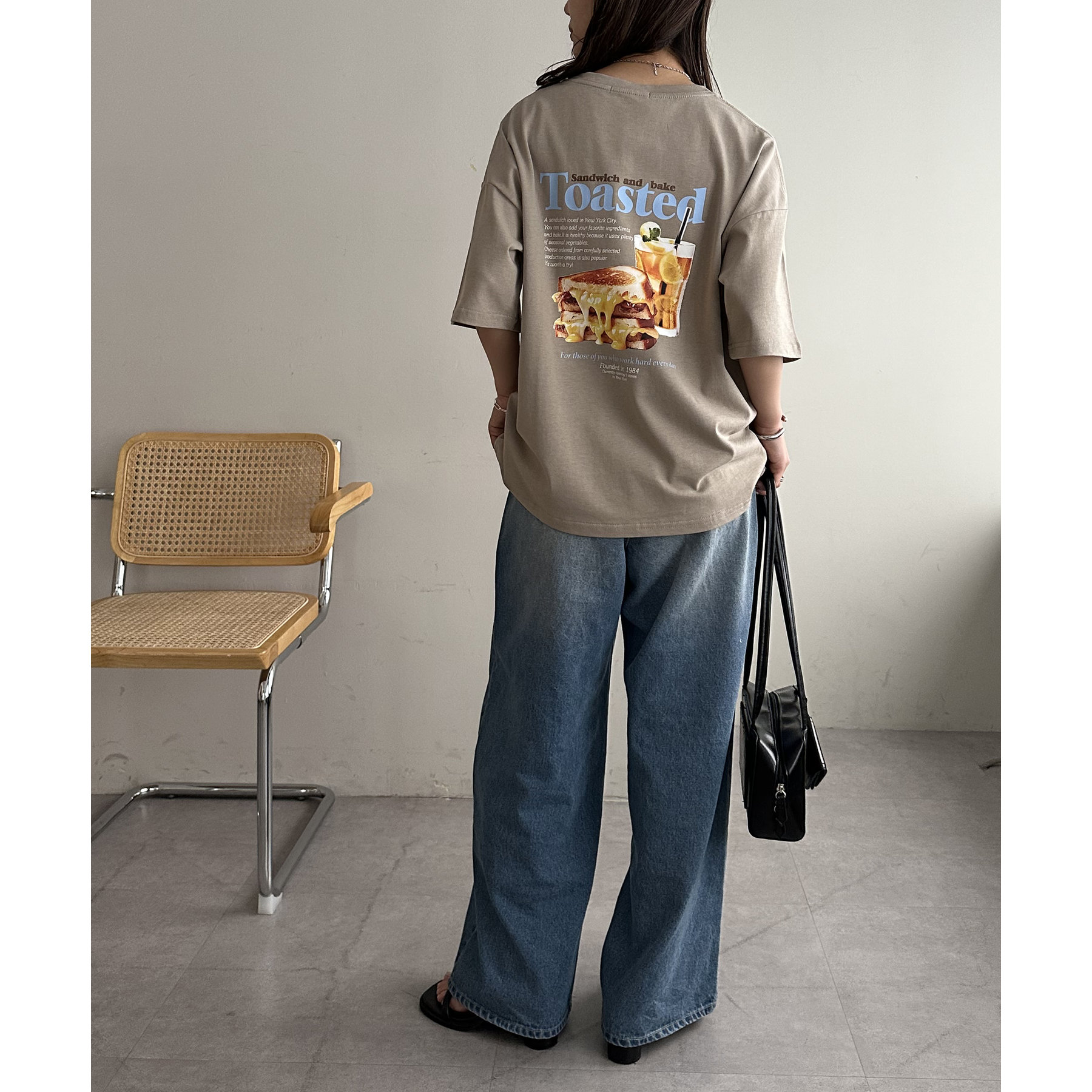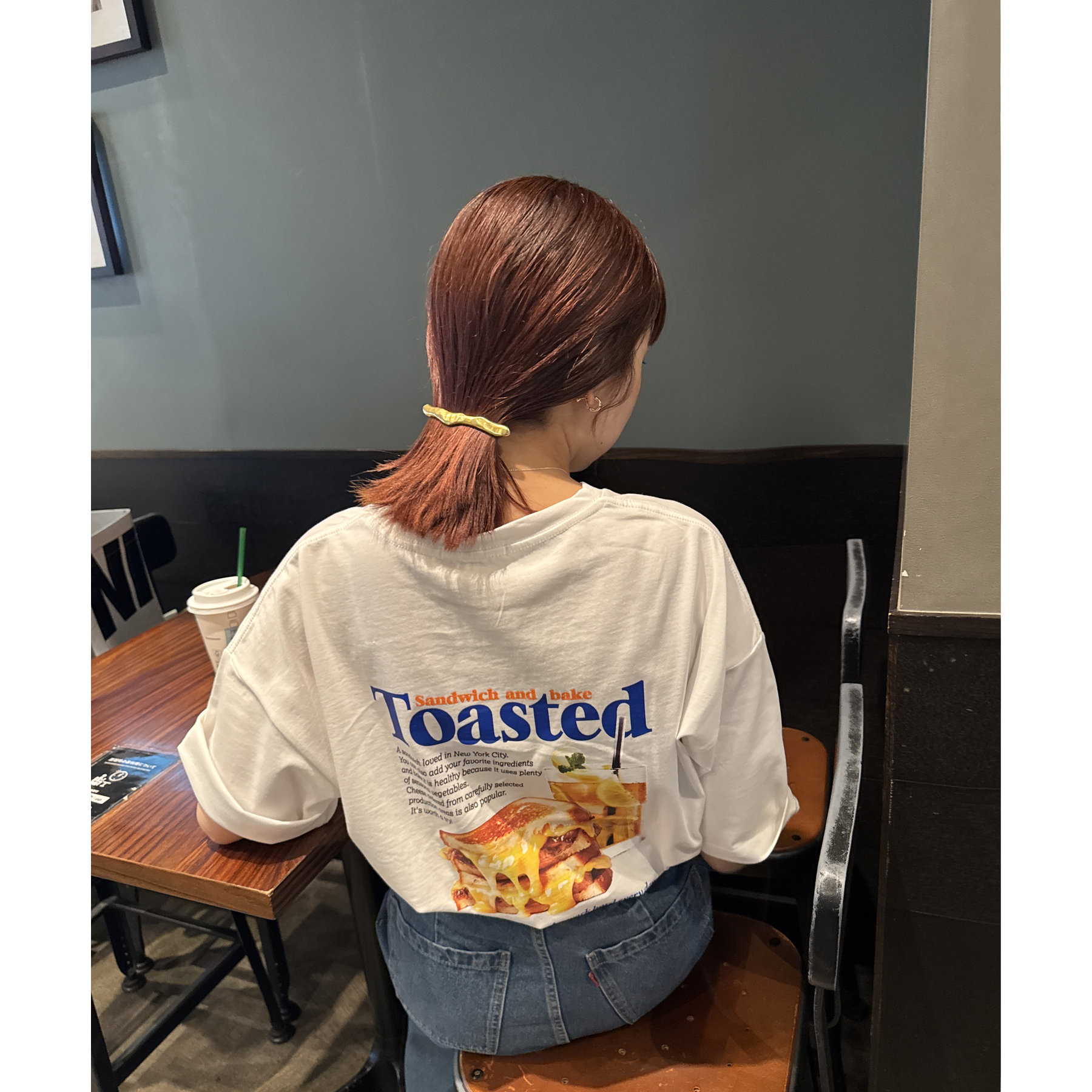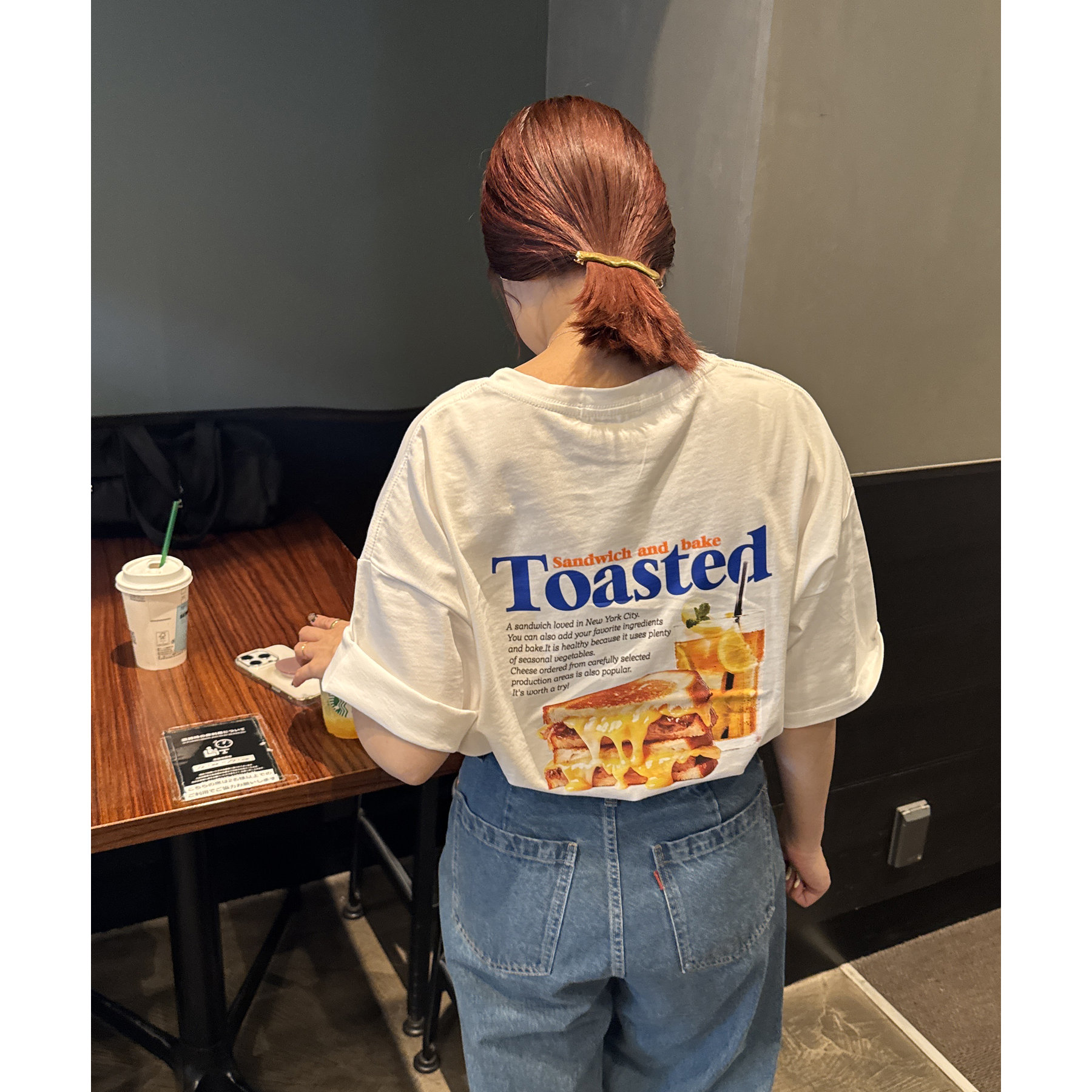 目を惹くユニークなトーストとドリンクのフォトプリントが背中に大胆にあしらわれたビッグTシャツ。