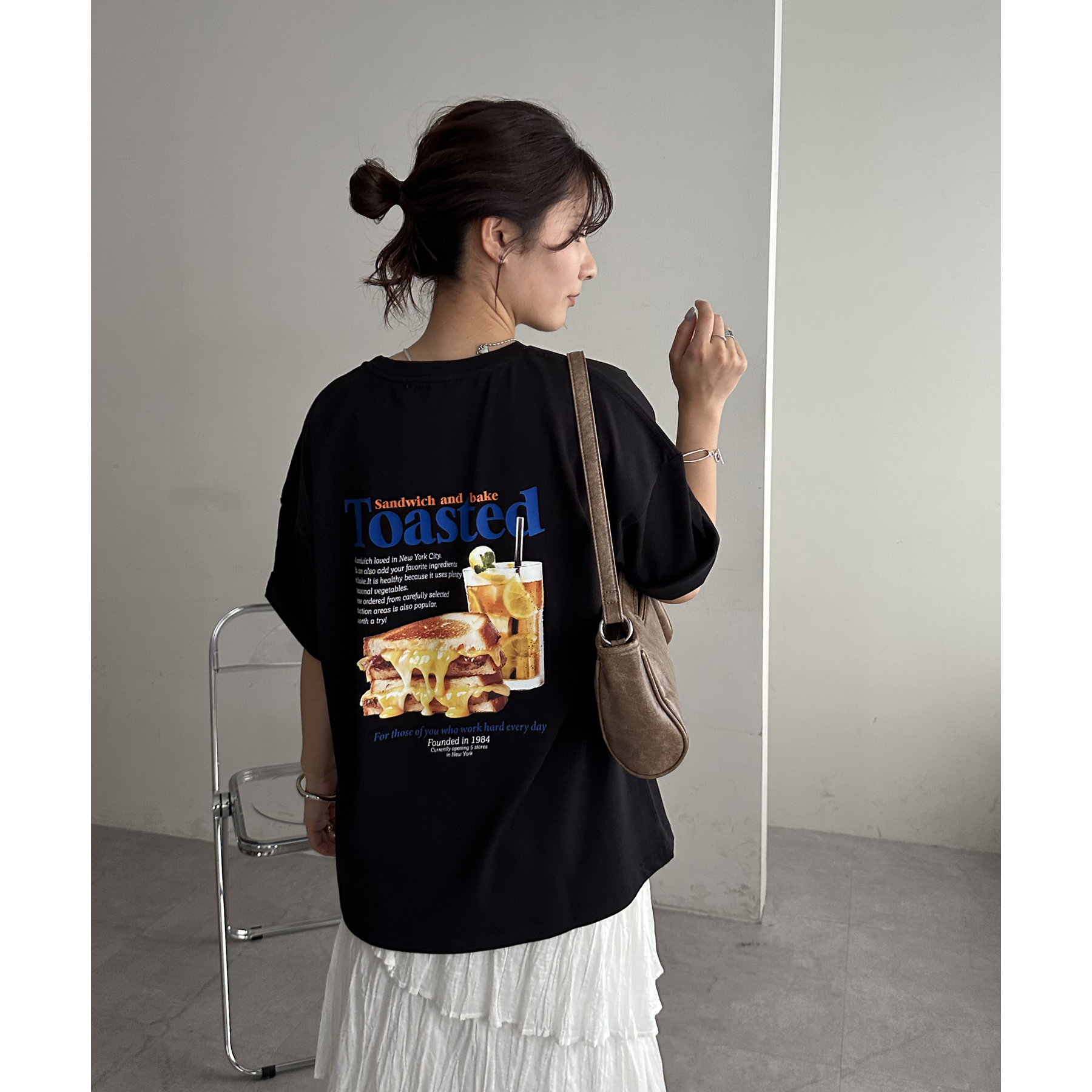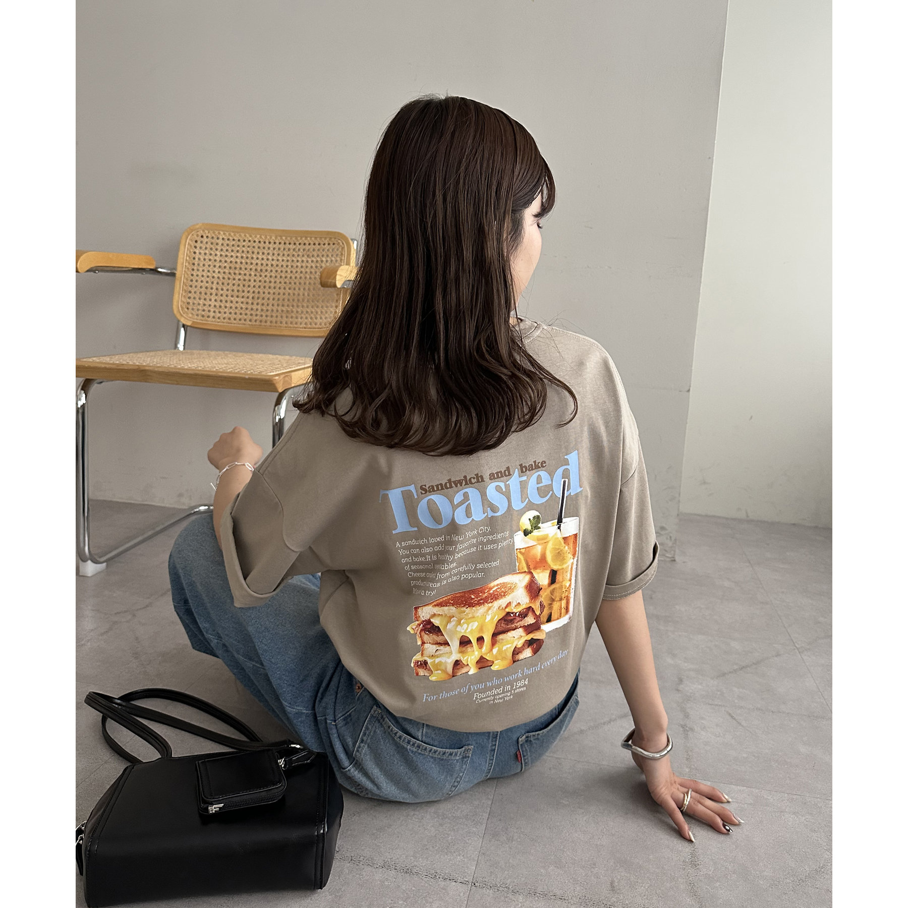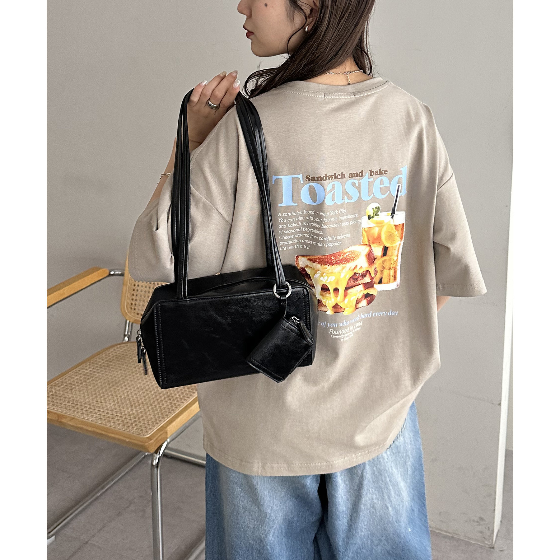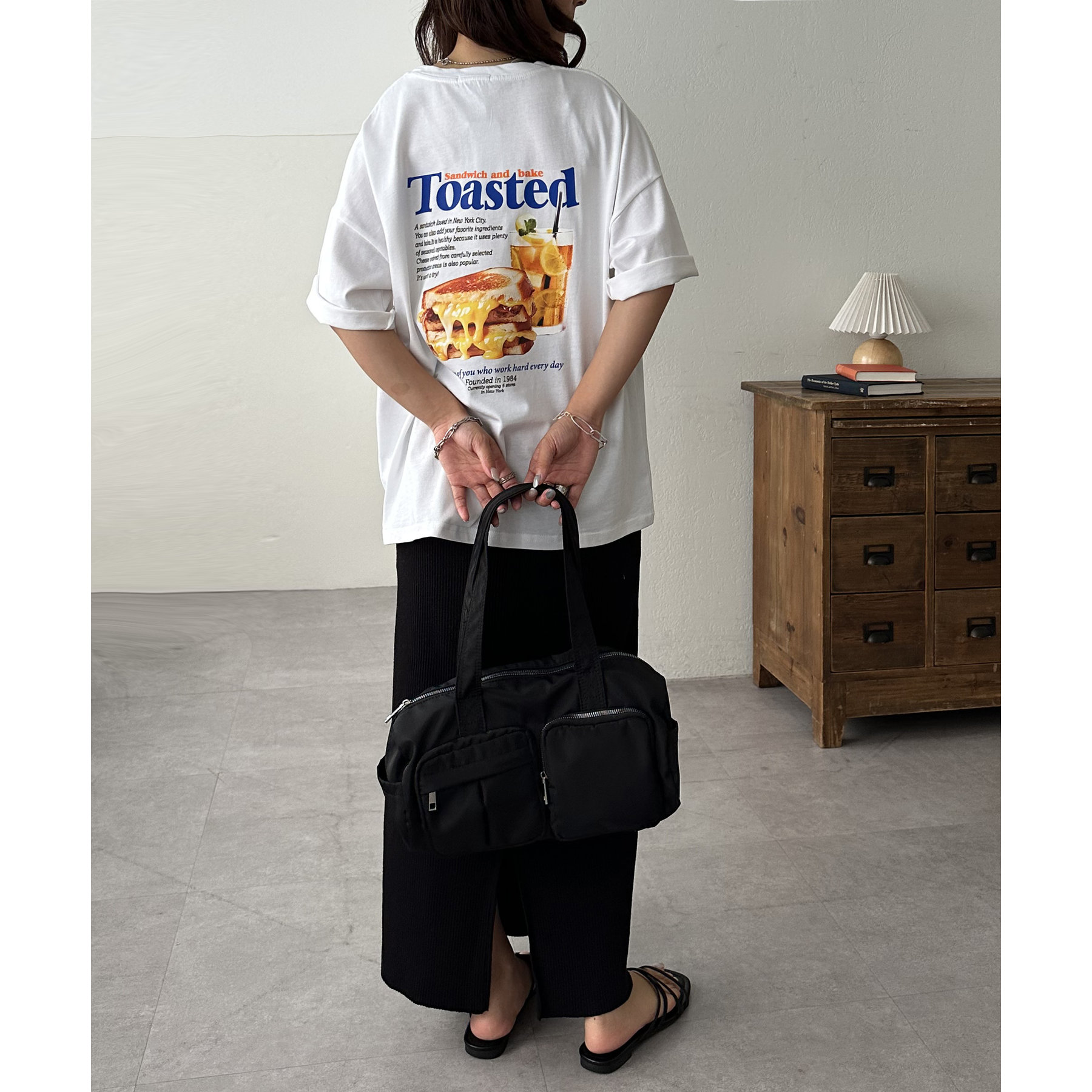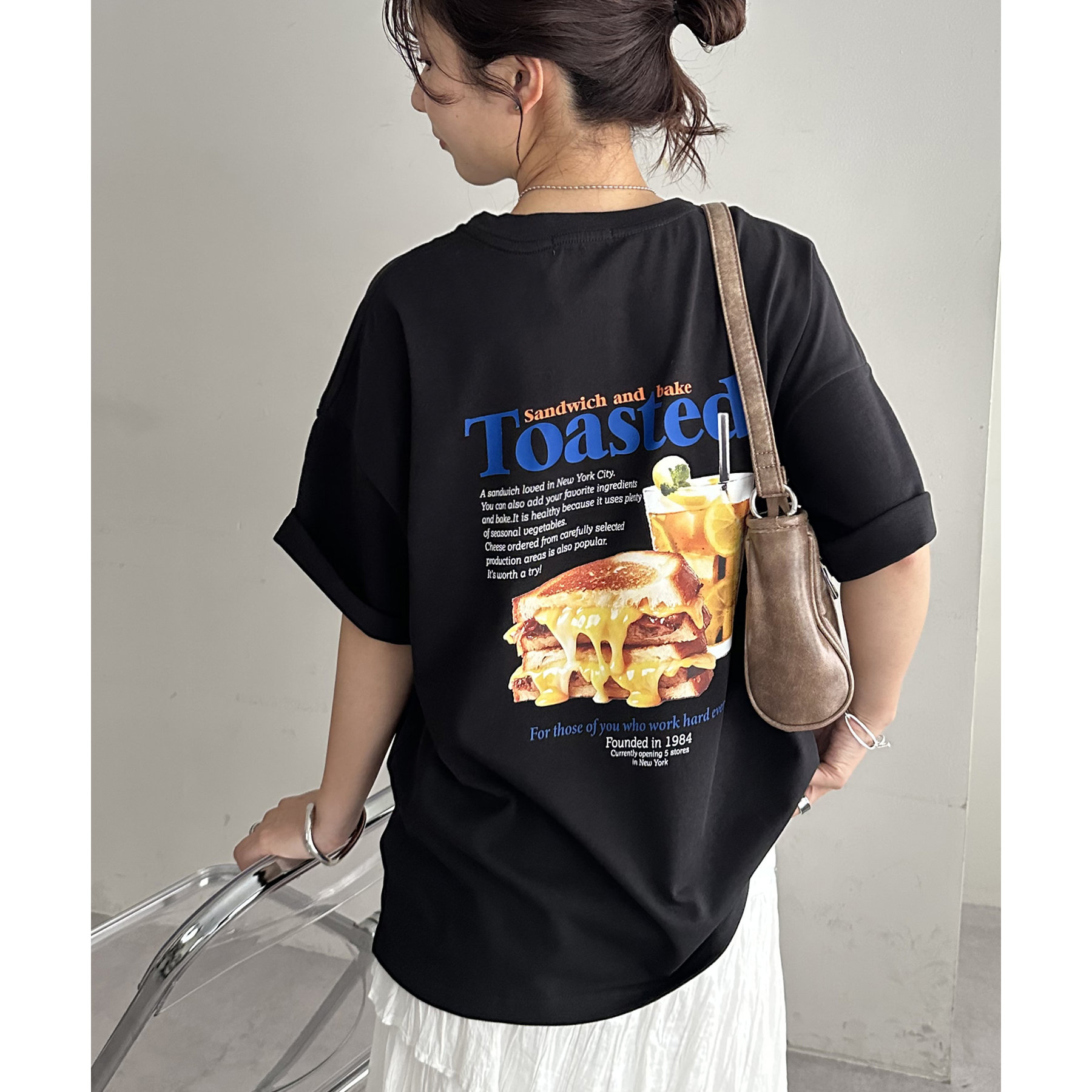 目を惹くユニークなトーストとドリンクのフォトプリントが背中に大胆にあしらわれたビッグTシャツ。