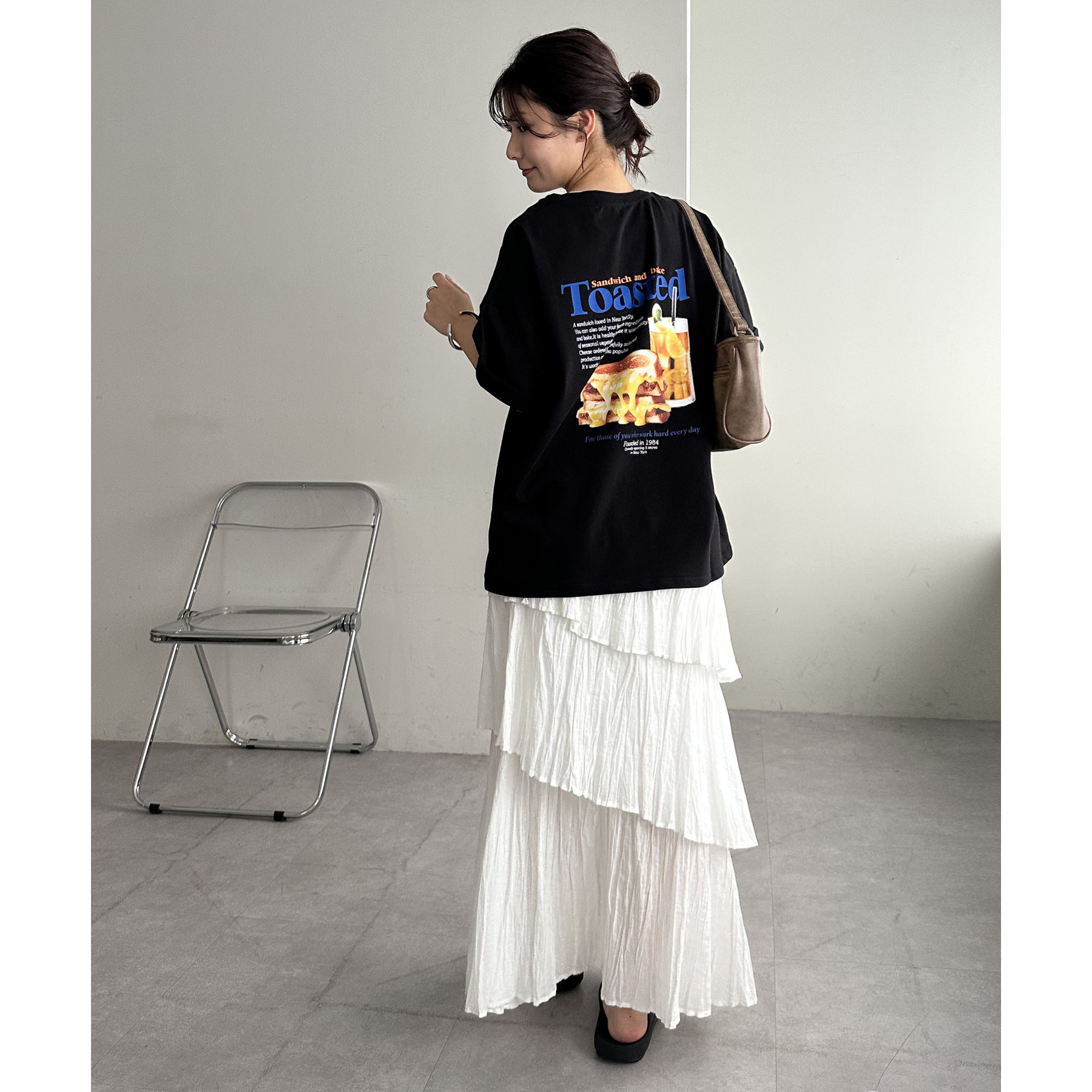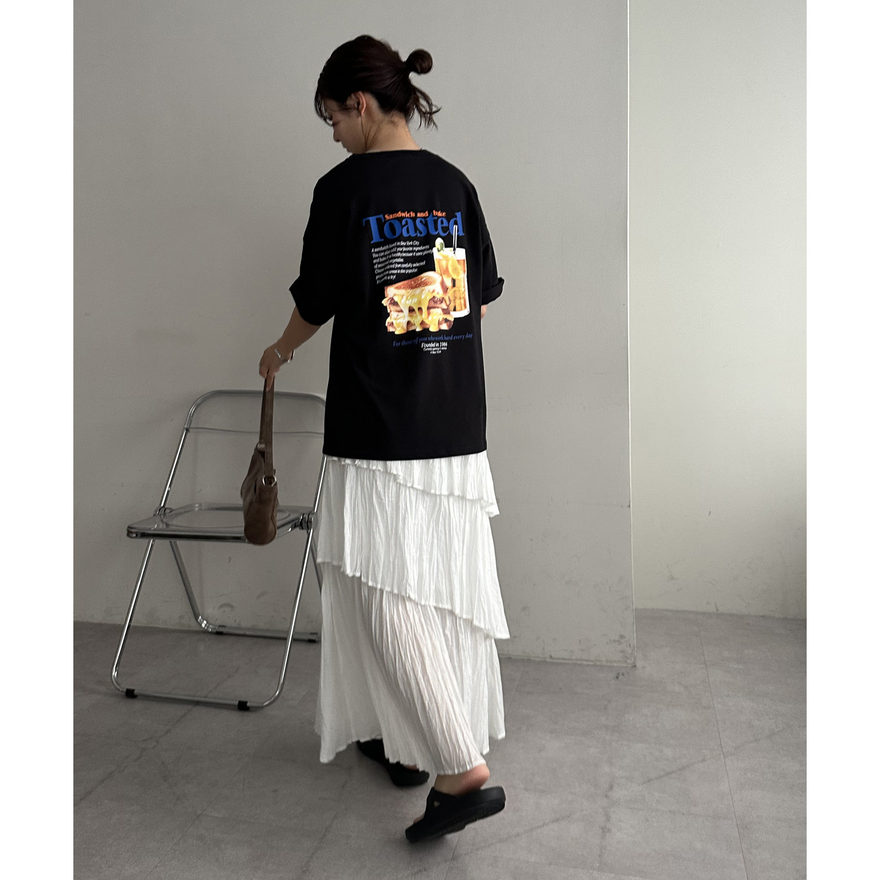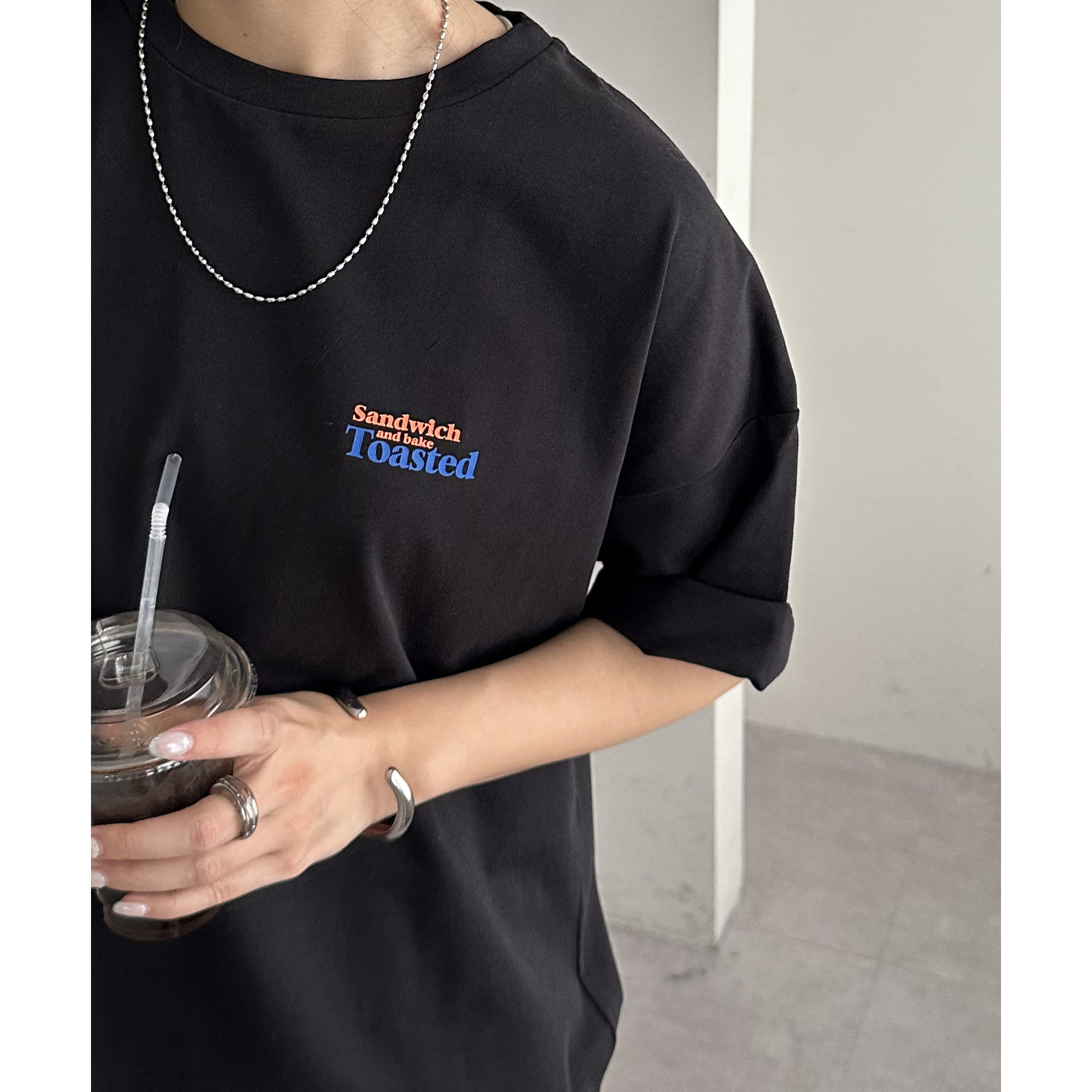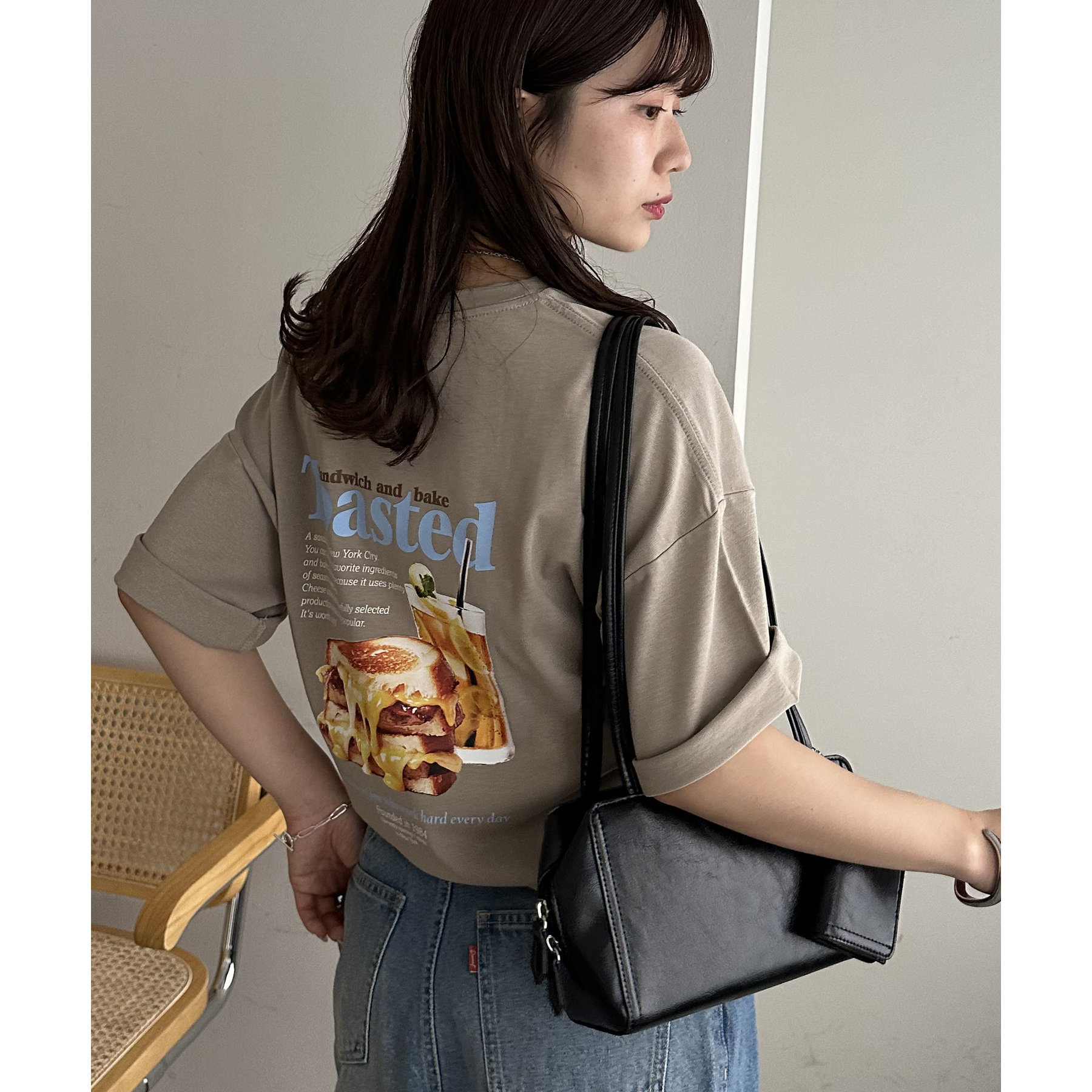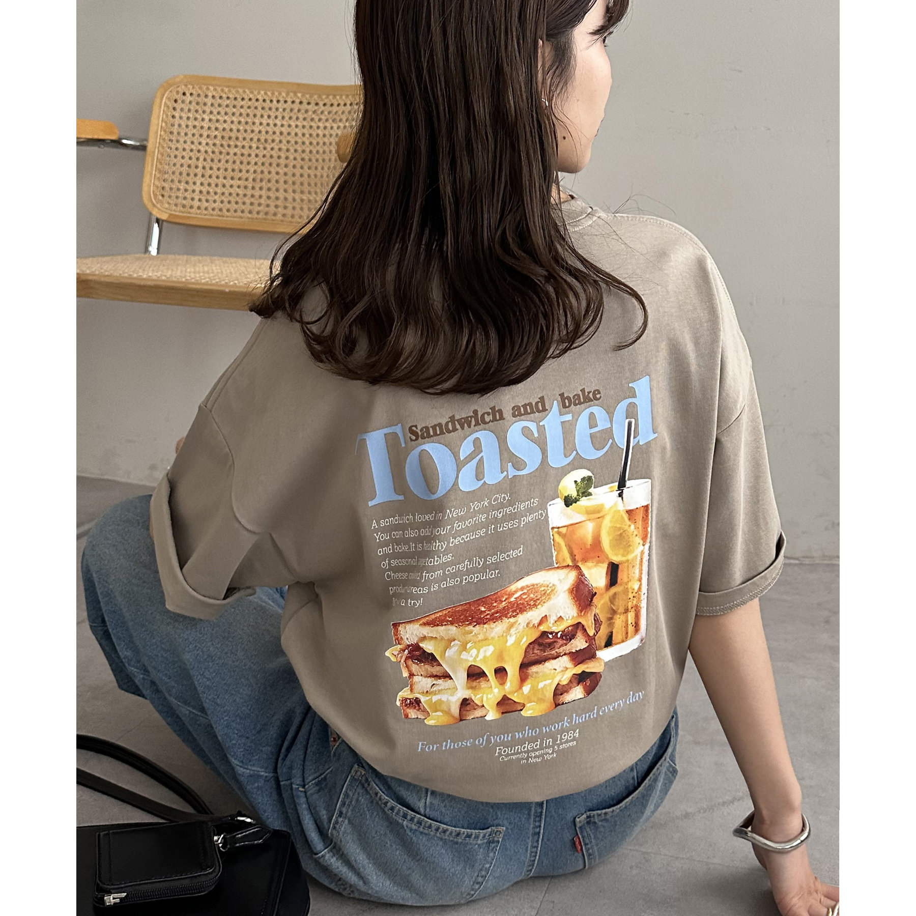 目を惹くユニークなトーストとドリンクのフォトプリントが背中に大胆にあしらわれたビッグTシャツ。