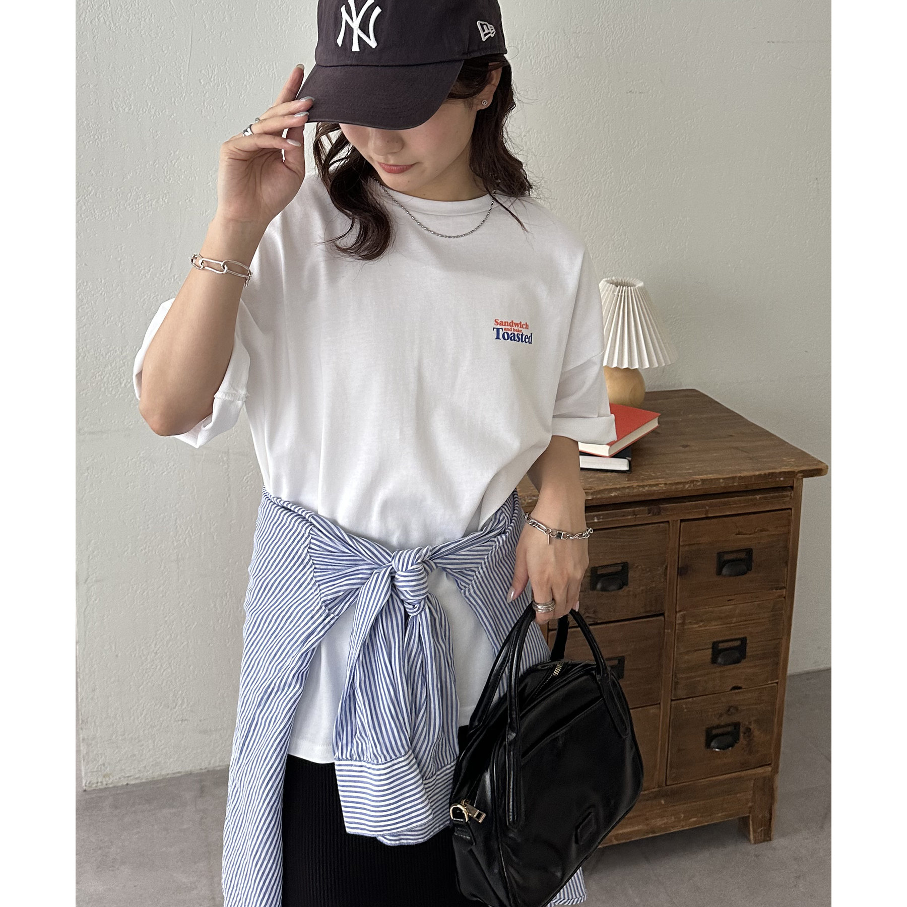 155cmスタッフ:お尻がすっぽり隠れる丈感で気になる腰回りもカバーできます。プリントが目立つので、シンプルな小物合わせがおすすめです◎