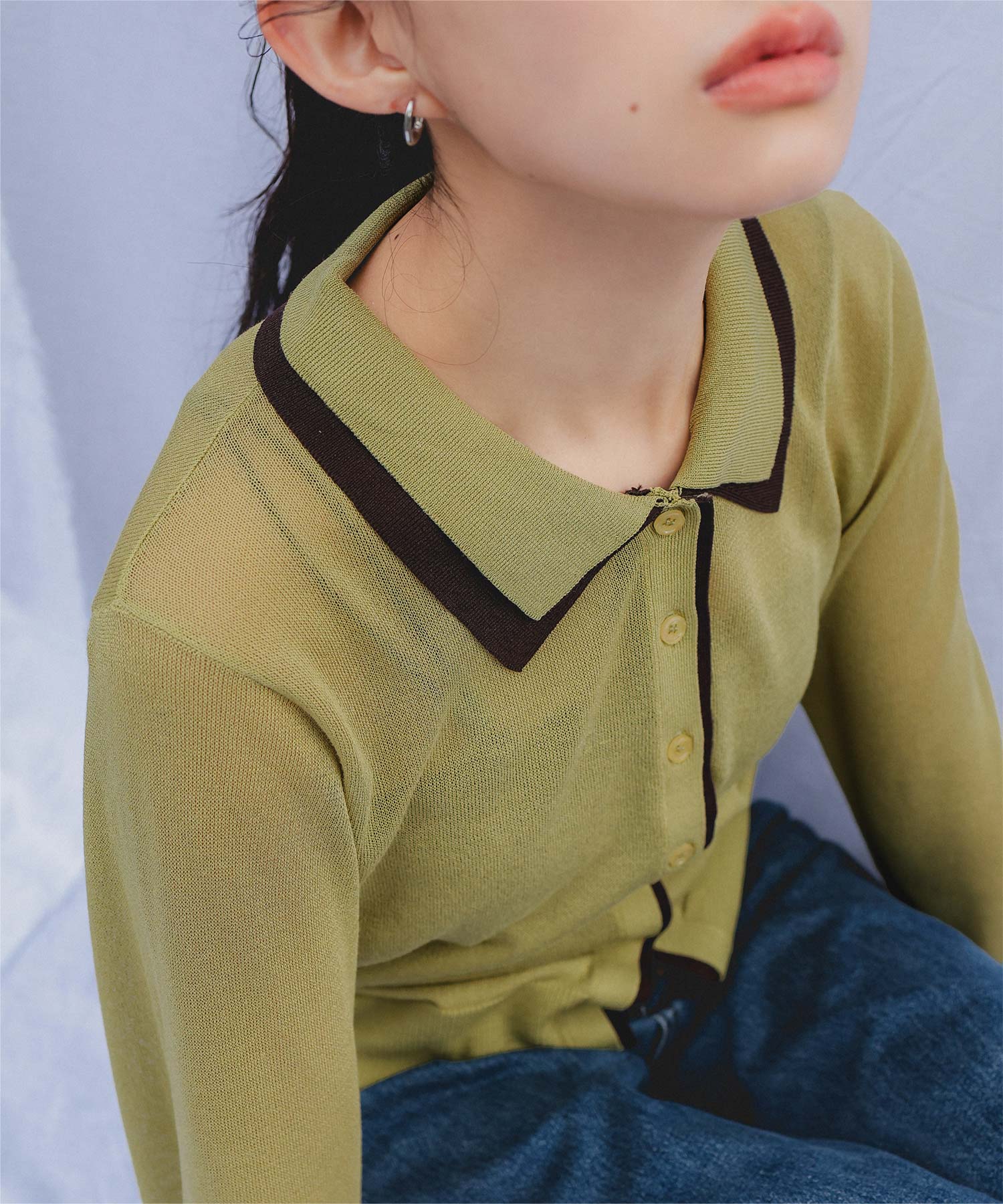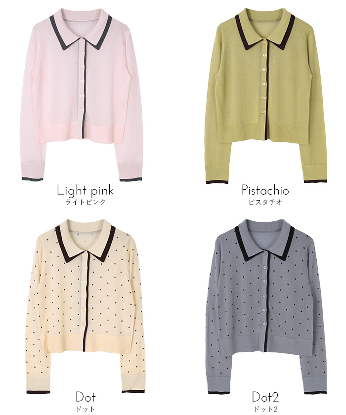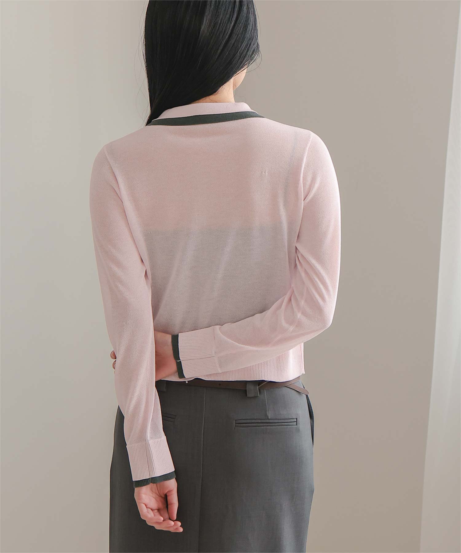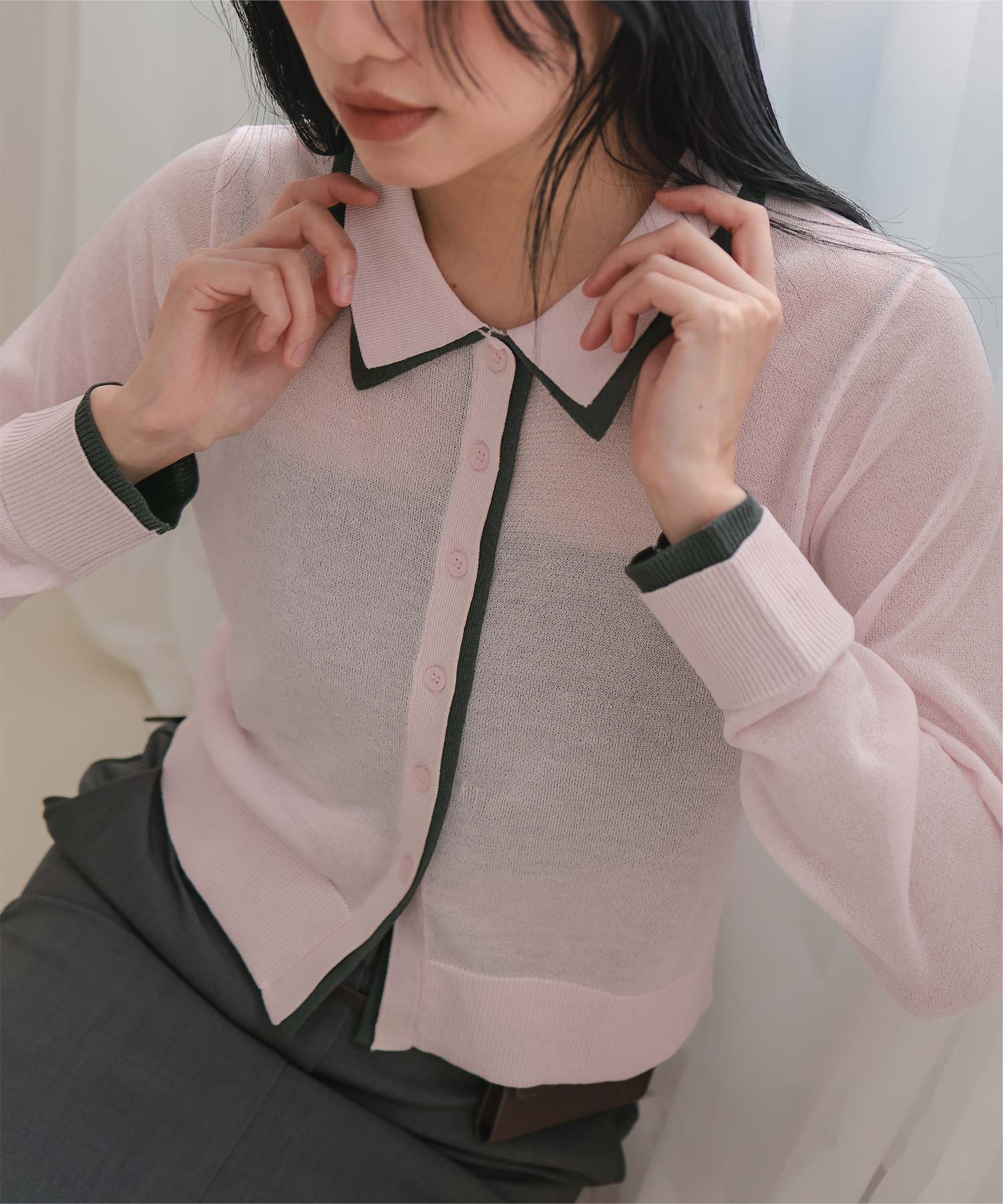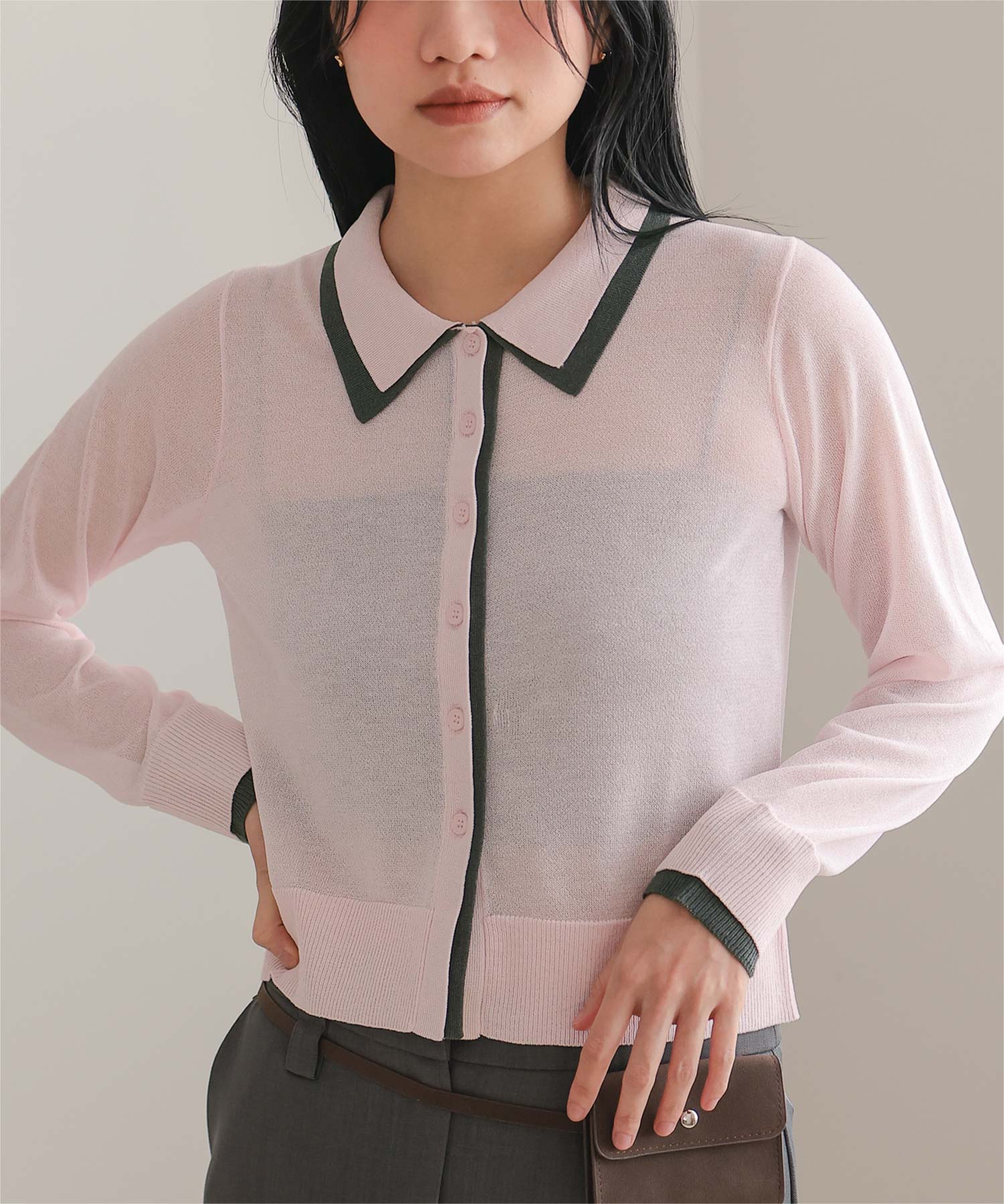 ・襟・前立て・袖口に配色ラインを効かせた、レイヤード見えのシアーカーディガン