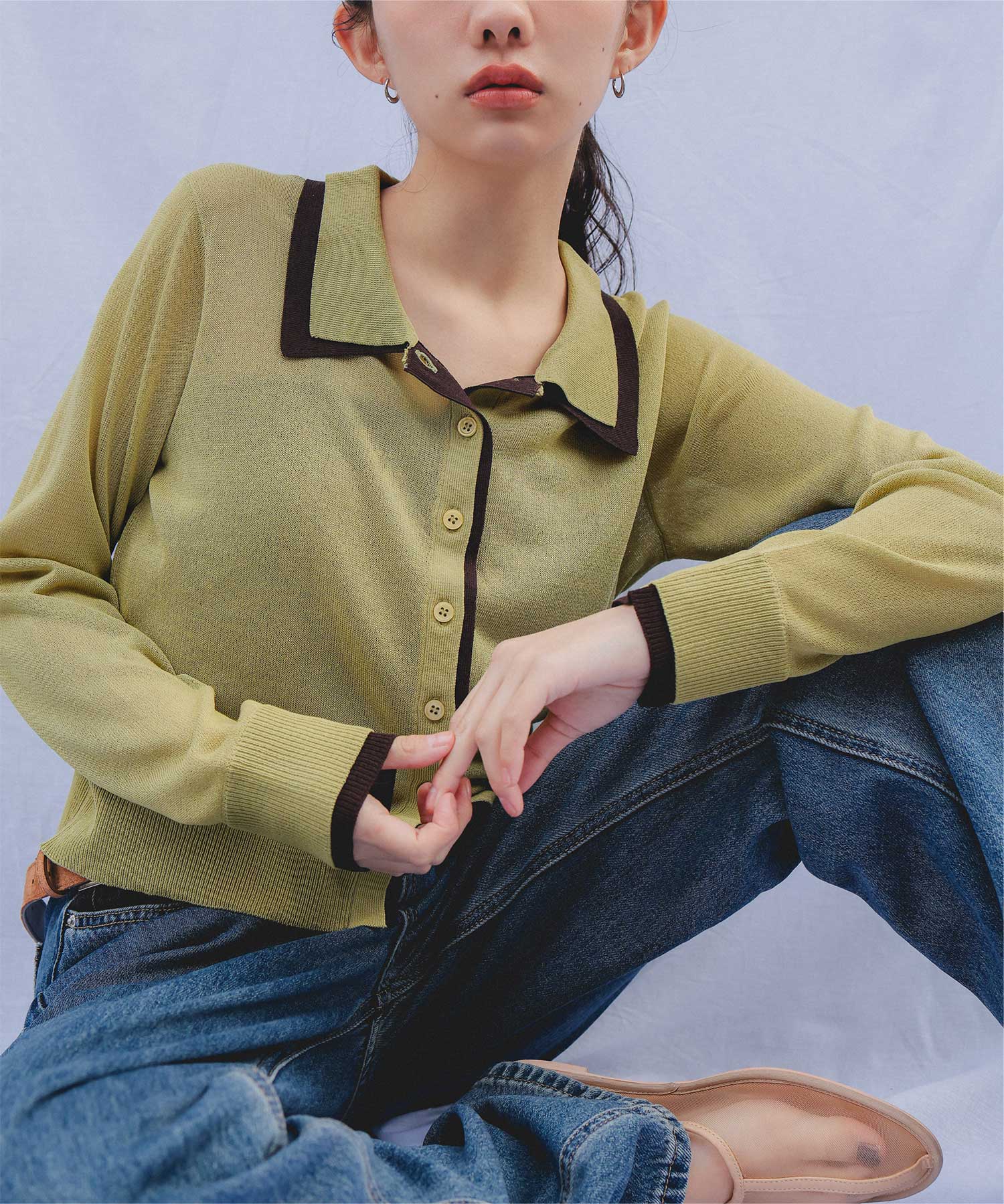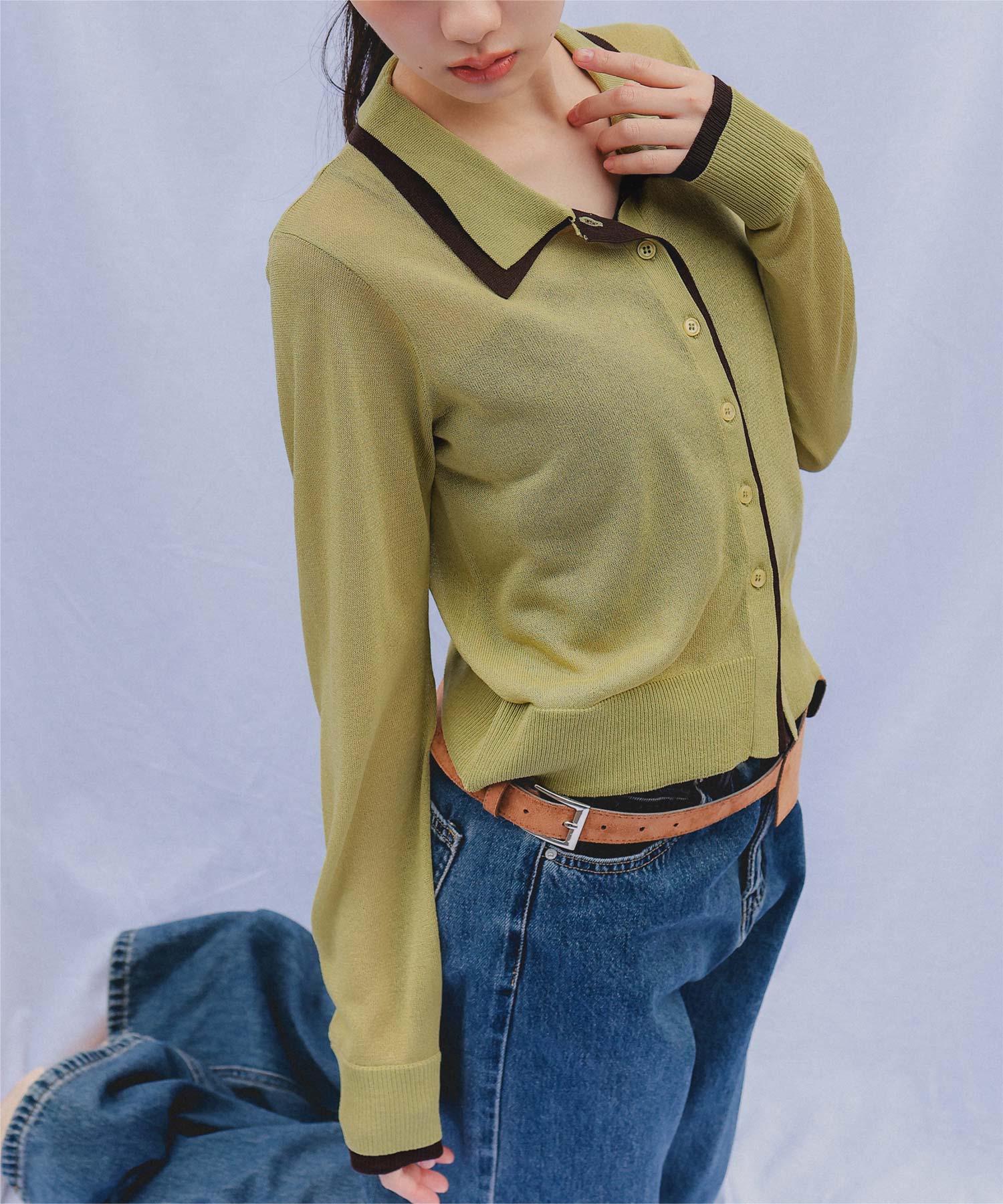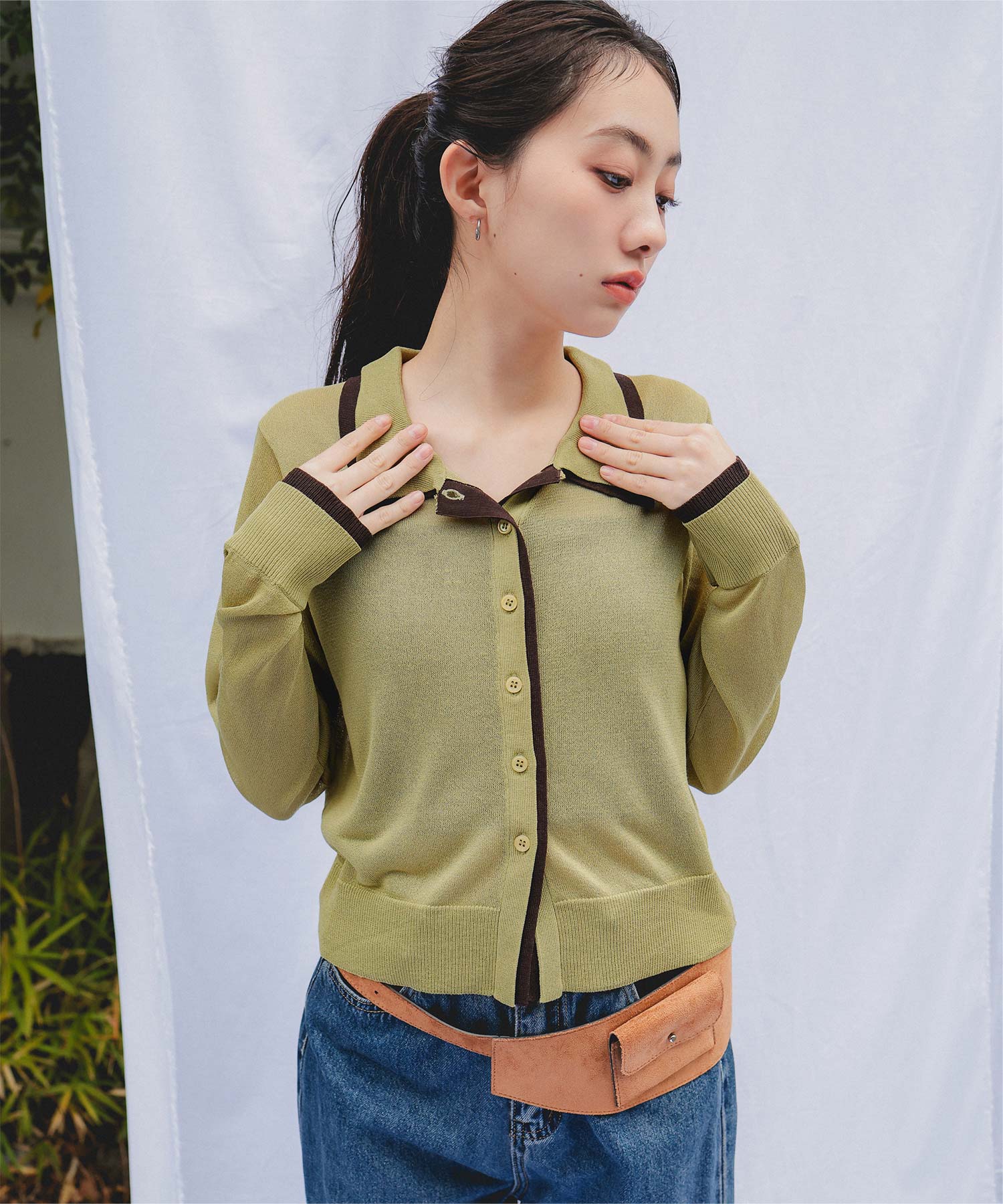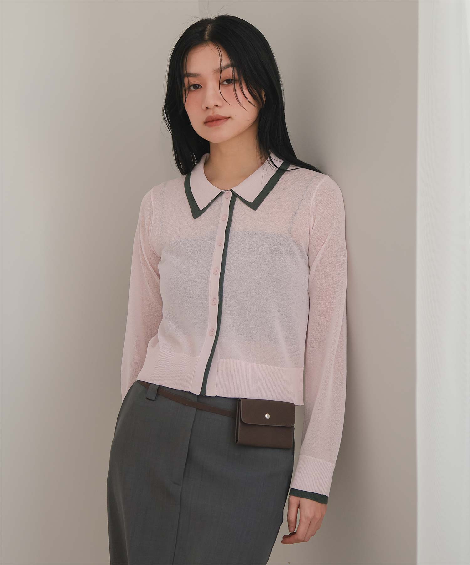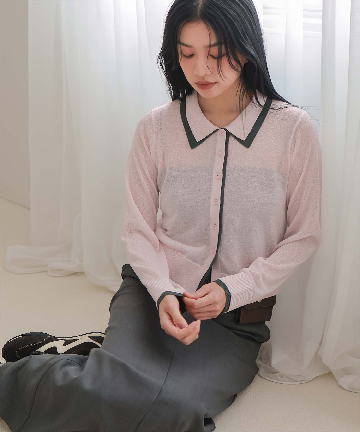 ・襟・前立て・袖口に配色ラインを効かせた、レイヤード見えのシアーカーディガン