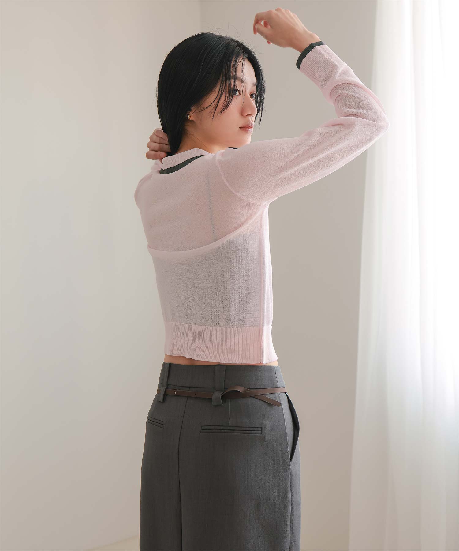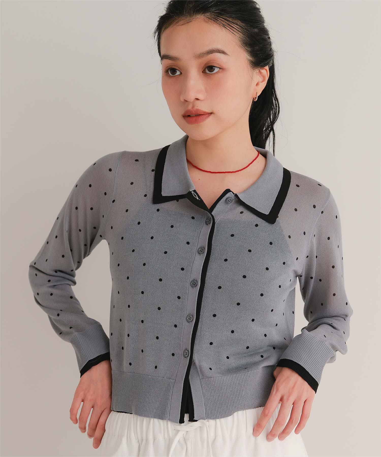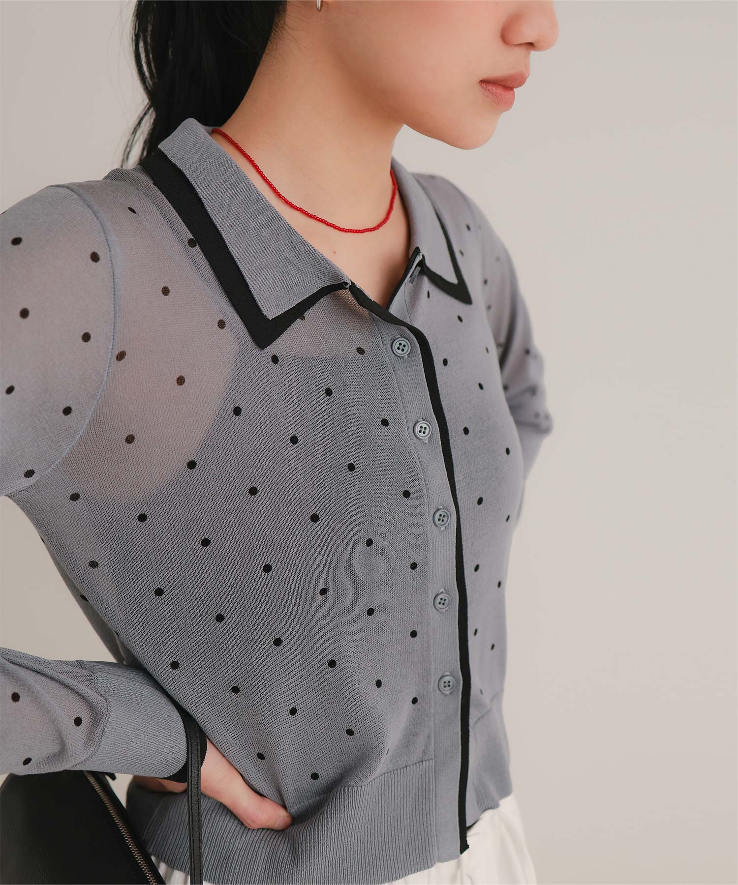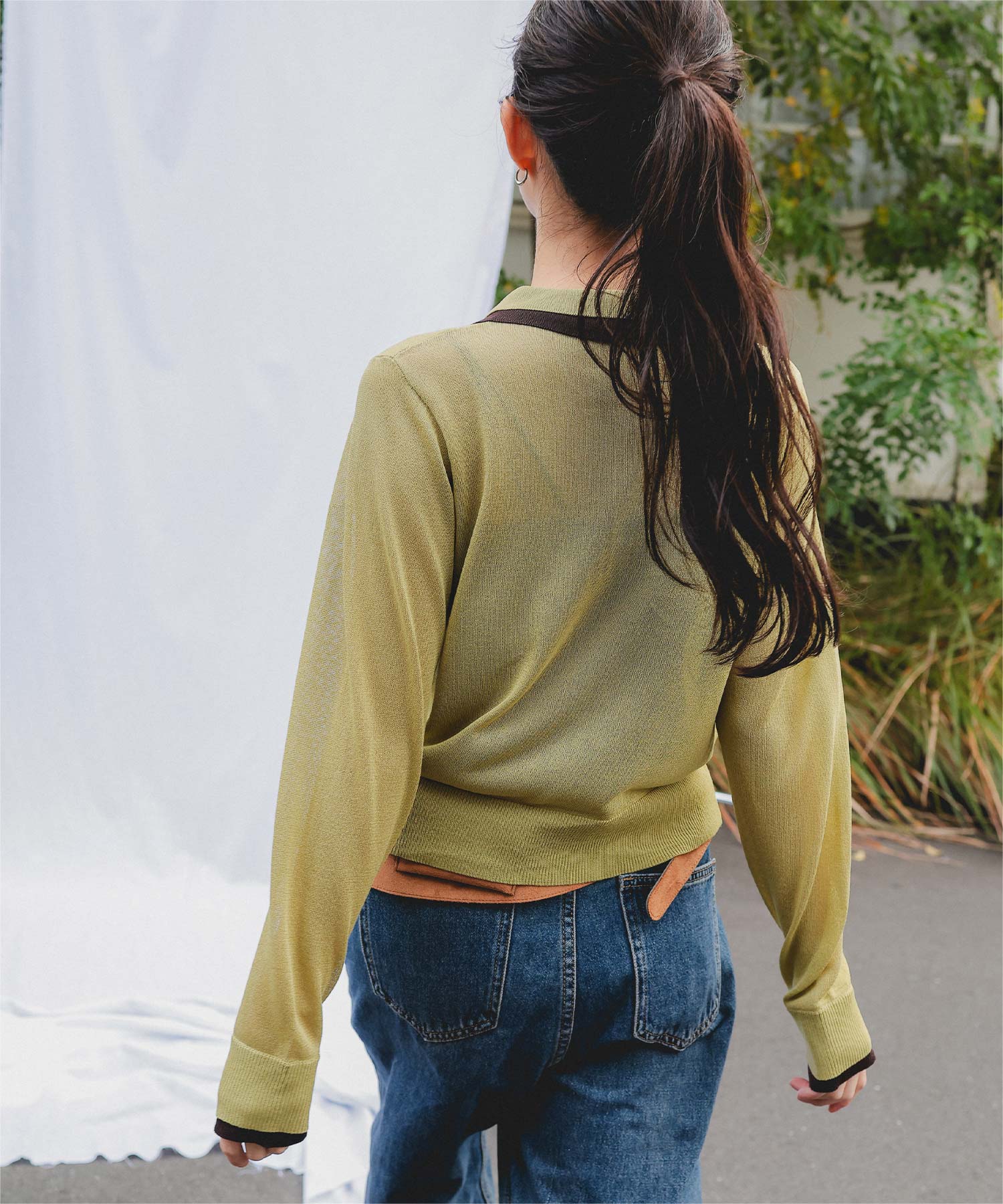 ・襟・前立て・袖口に配色ラインを効かせた、レイヤード見えのシアーカーディガン