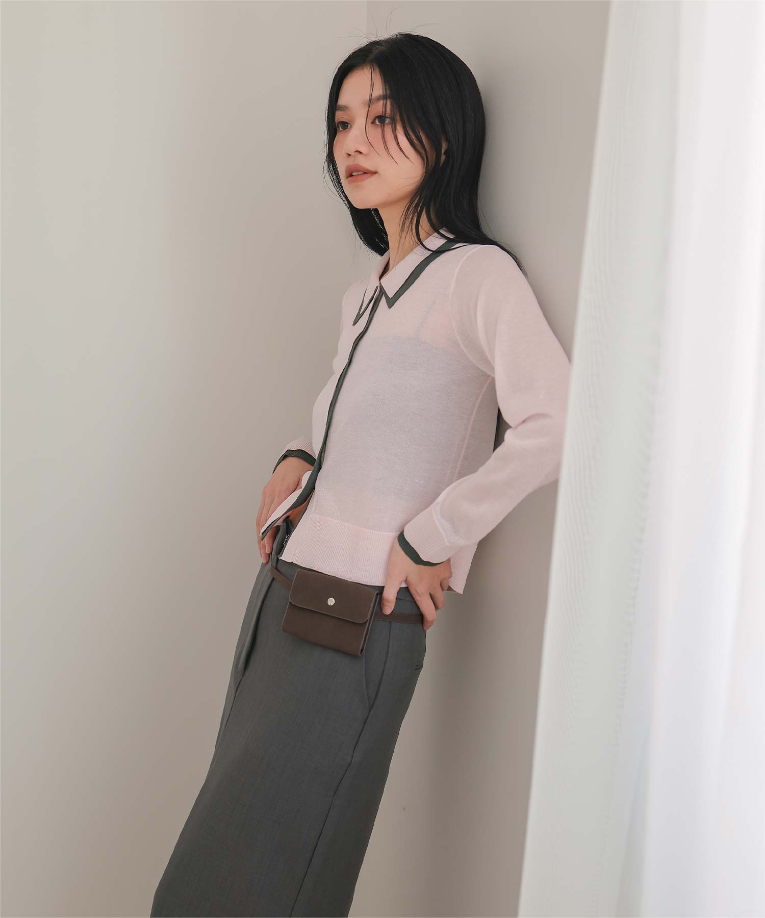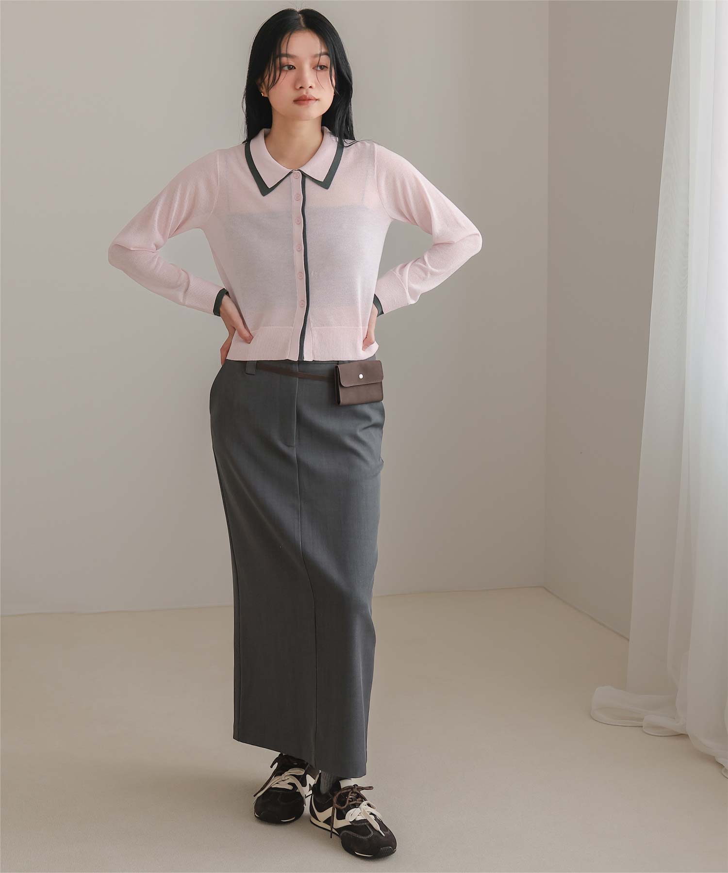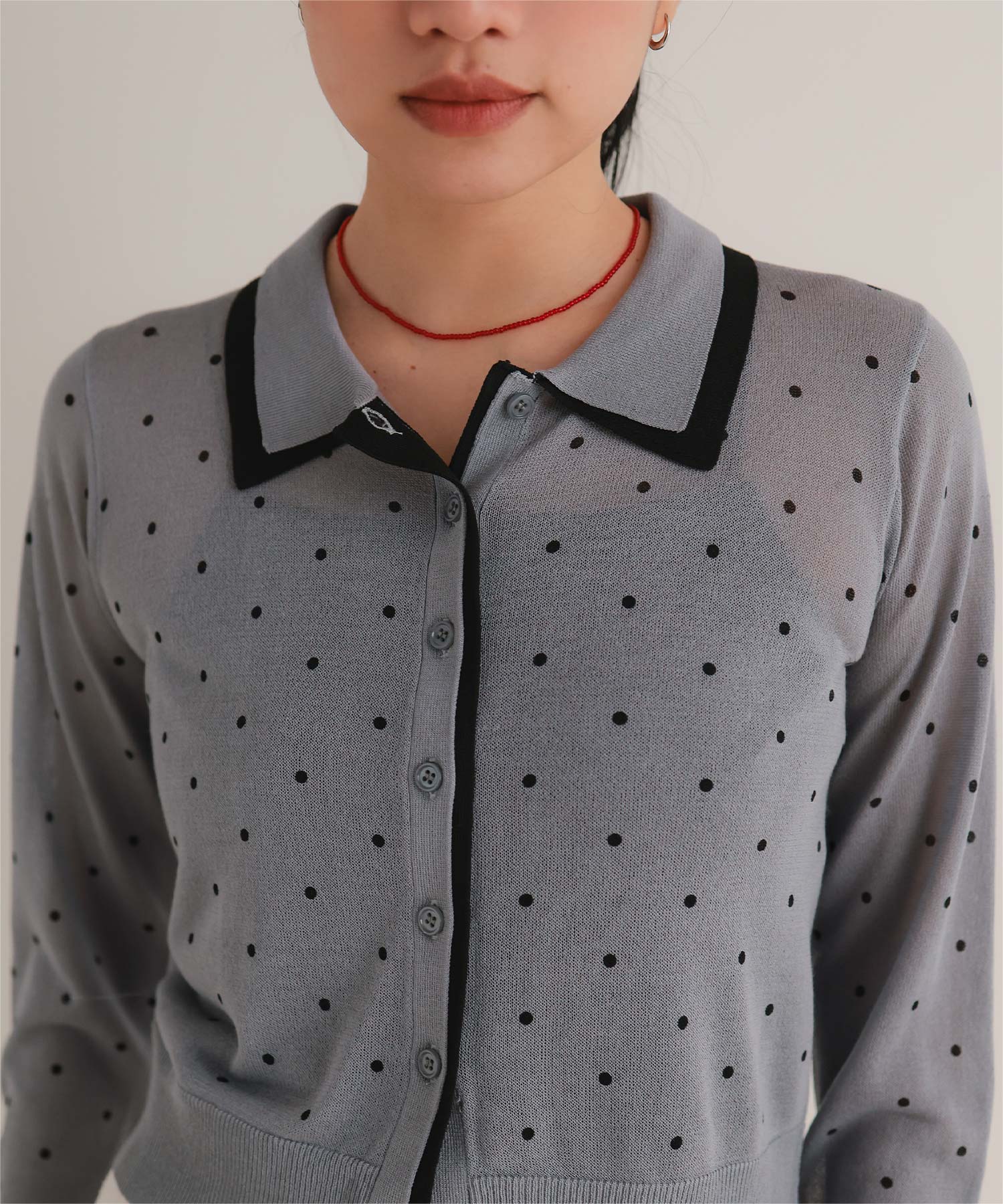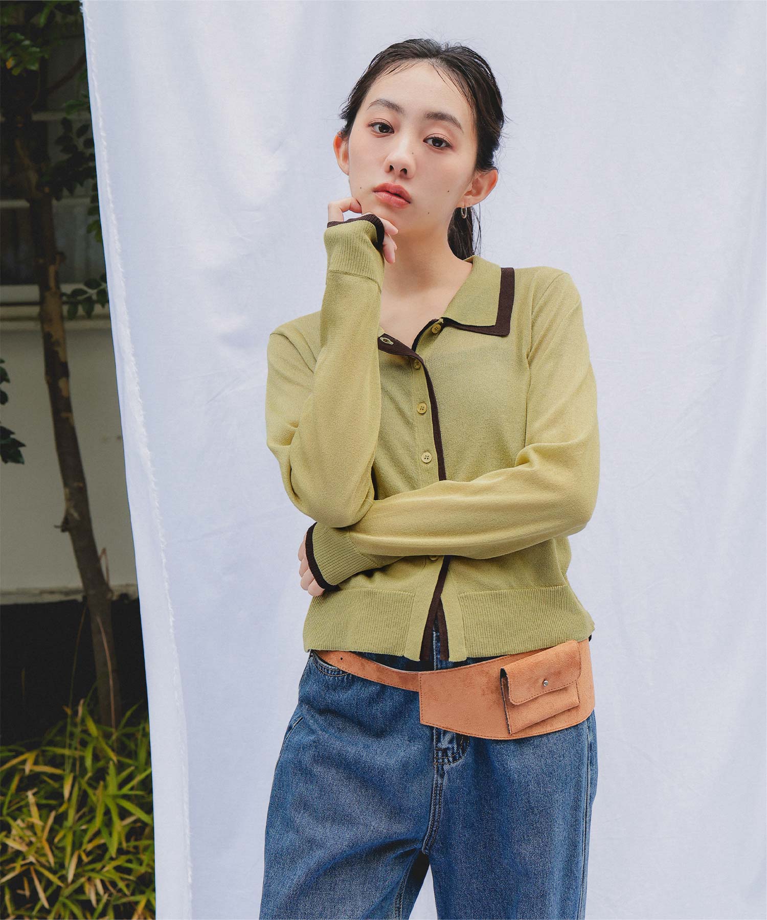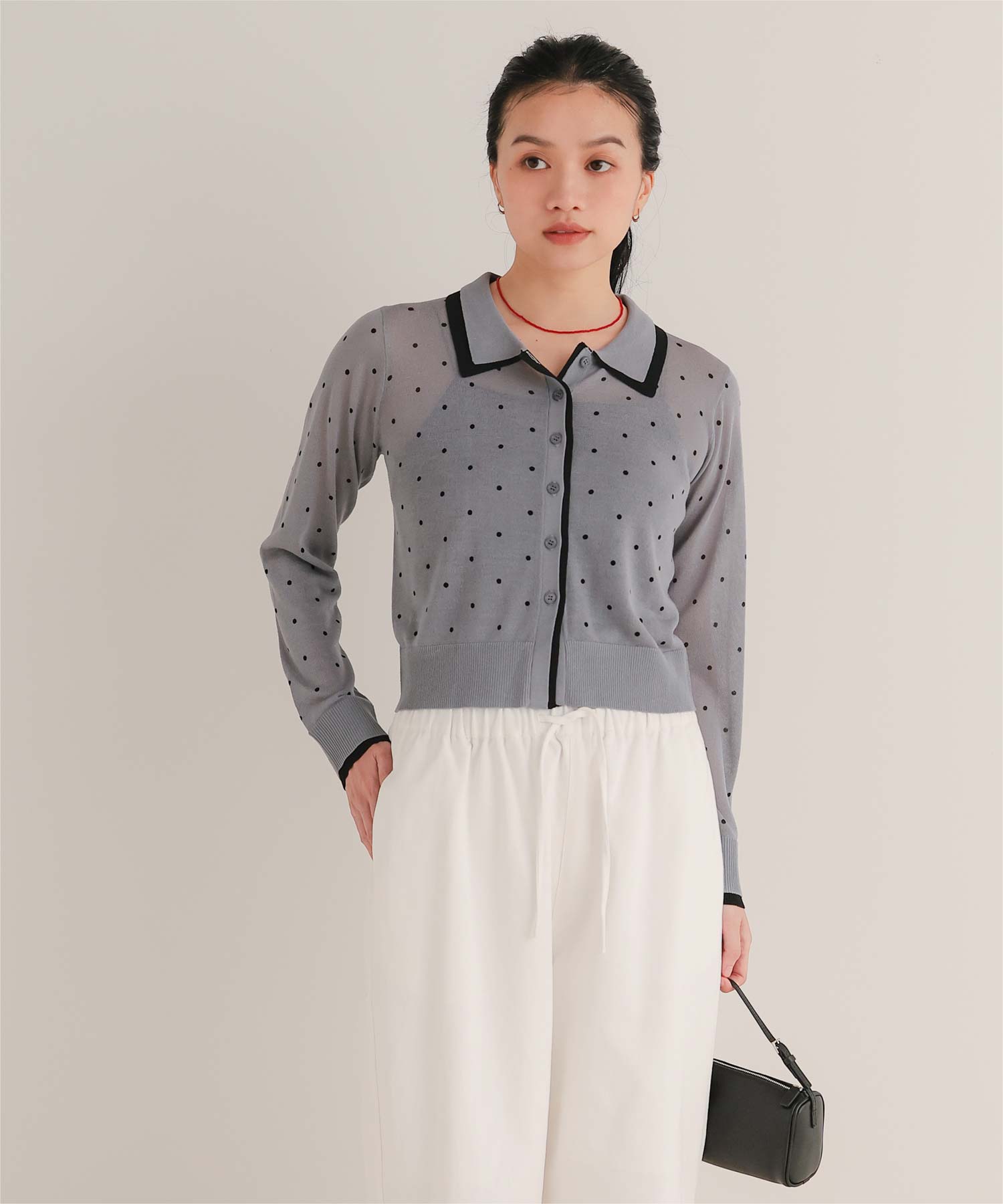 ・襟・前立て・袖口に配色ラインを効かせた、レイヤード見えのシアーカーディガン