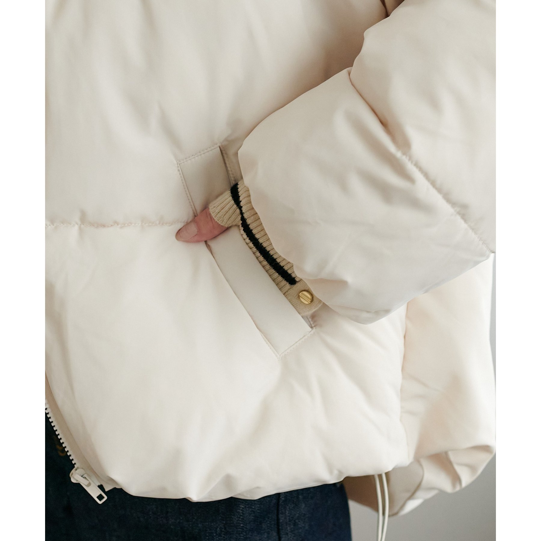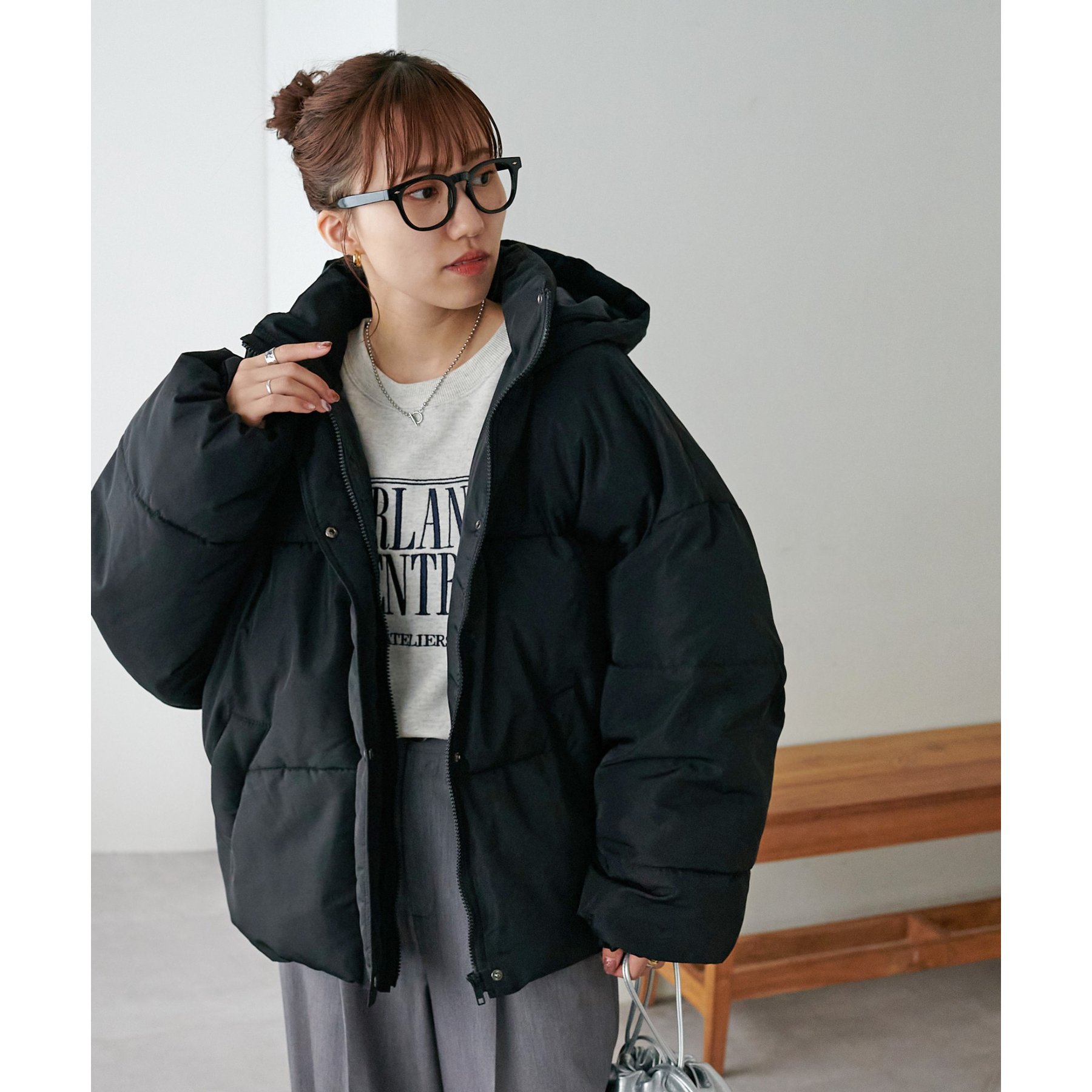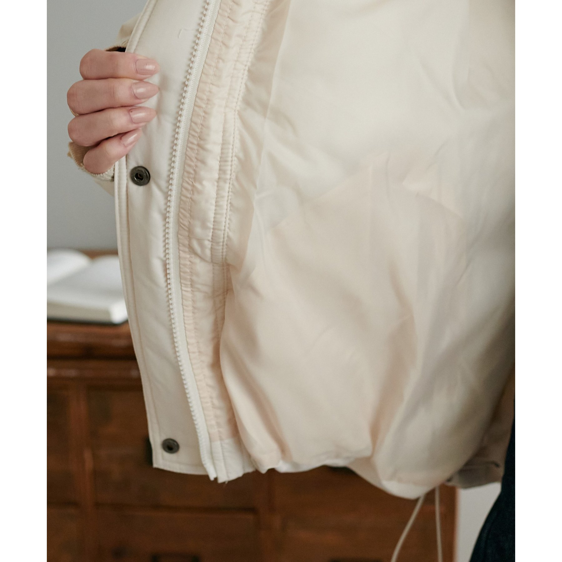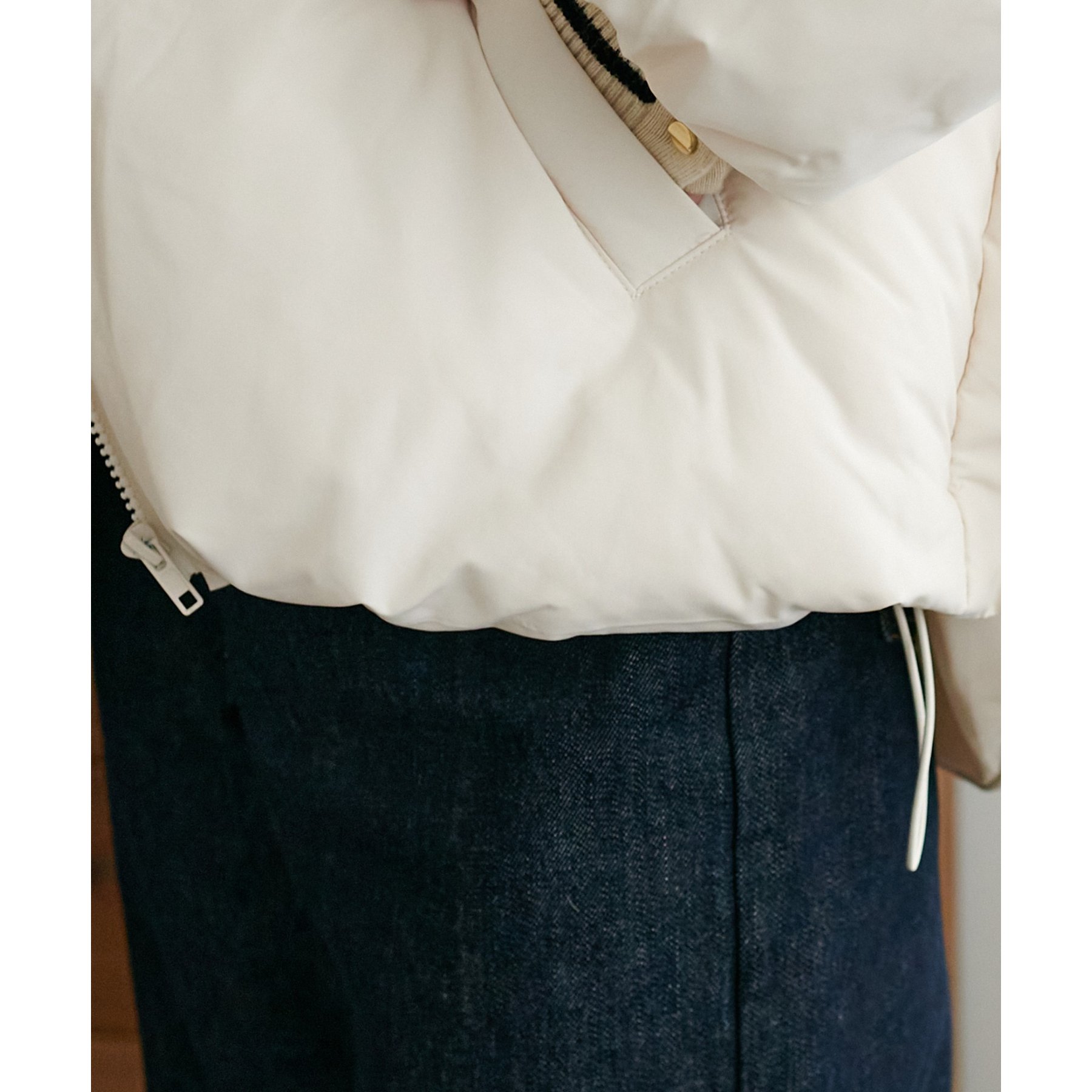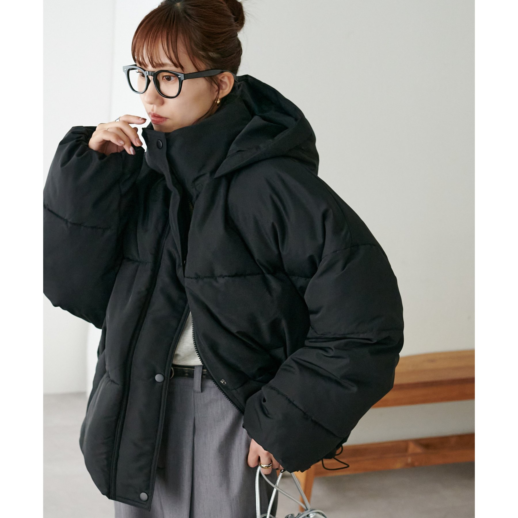 162cmスタッフ(Fサイズ着用): 中綿が入っており暖かくて軽い!着心地抜群です。ラウンドヘムデザインが柔らかな印象を与えます♩