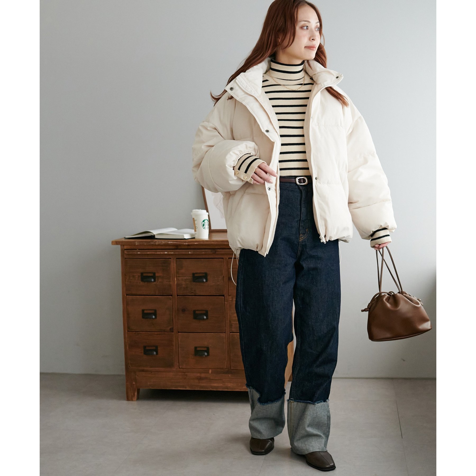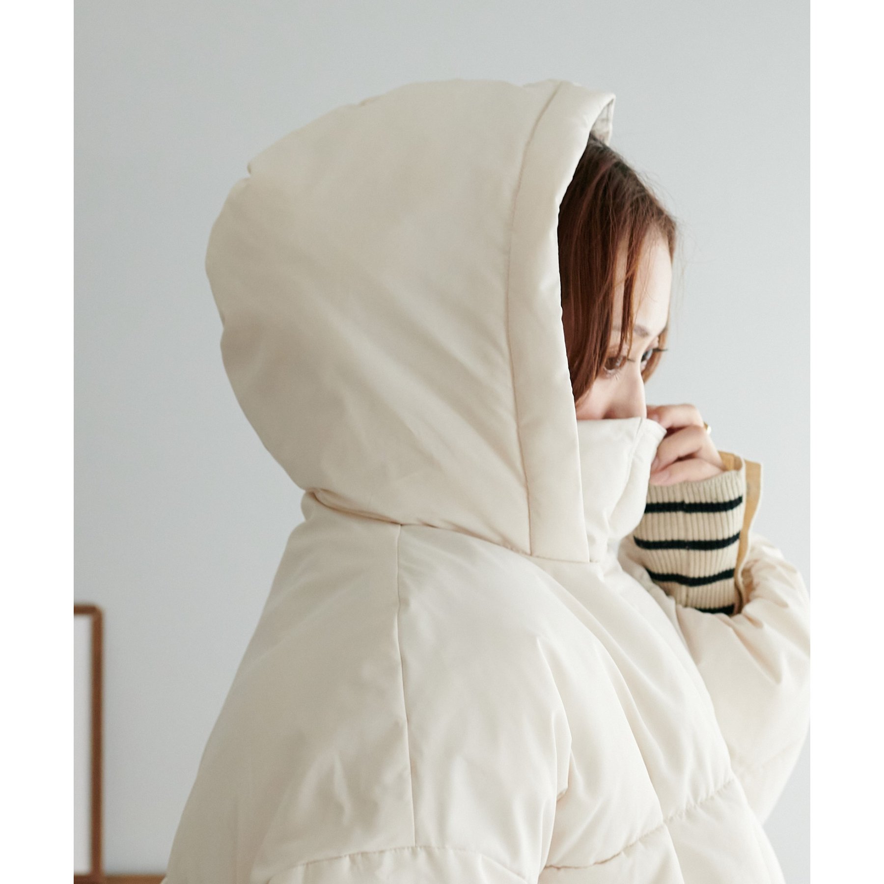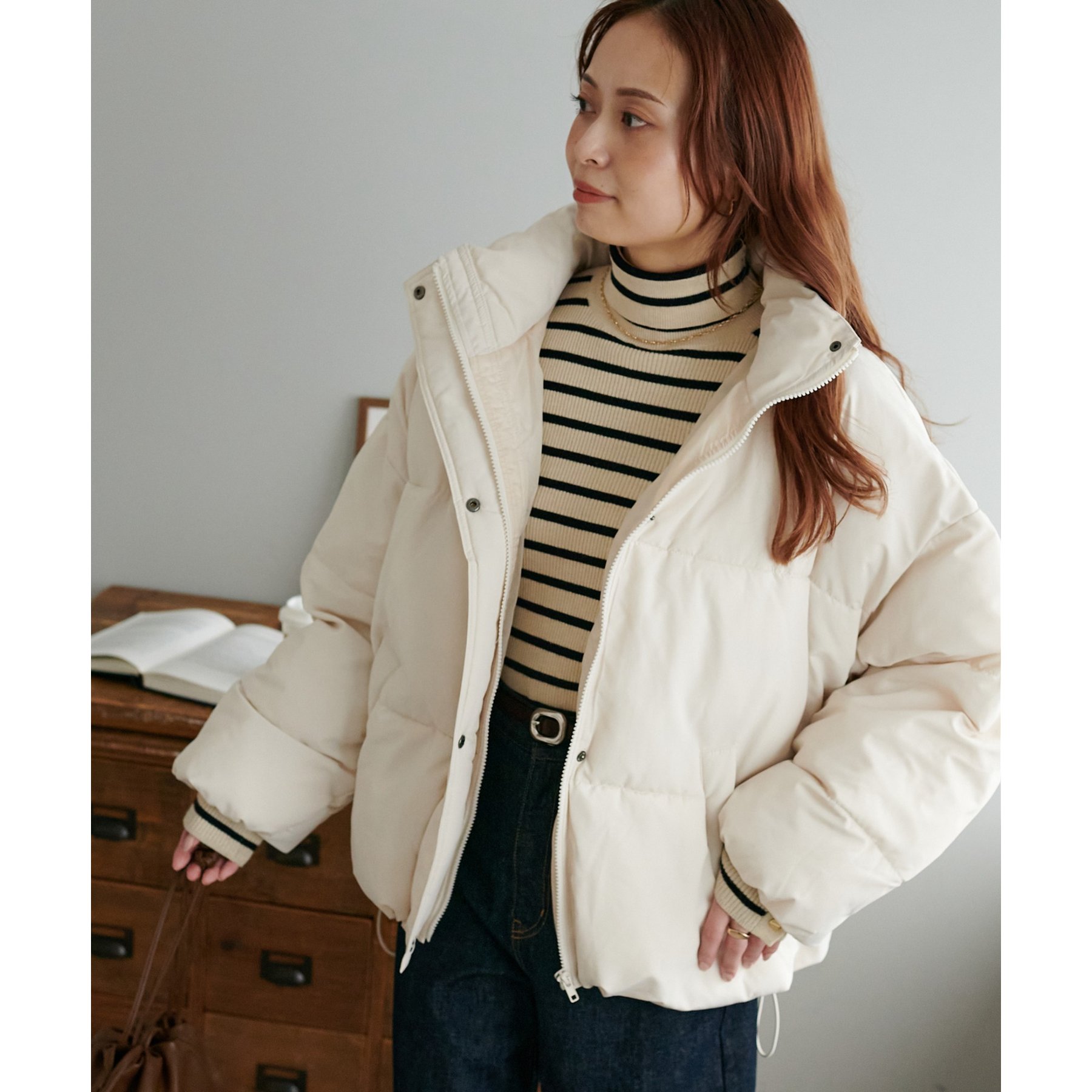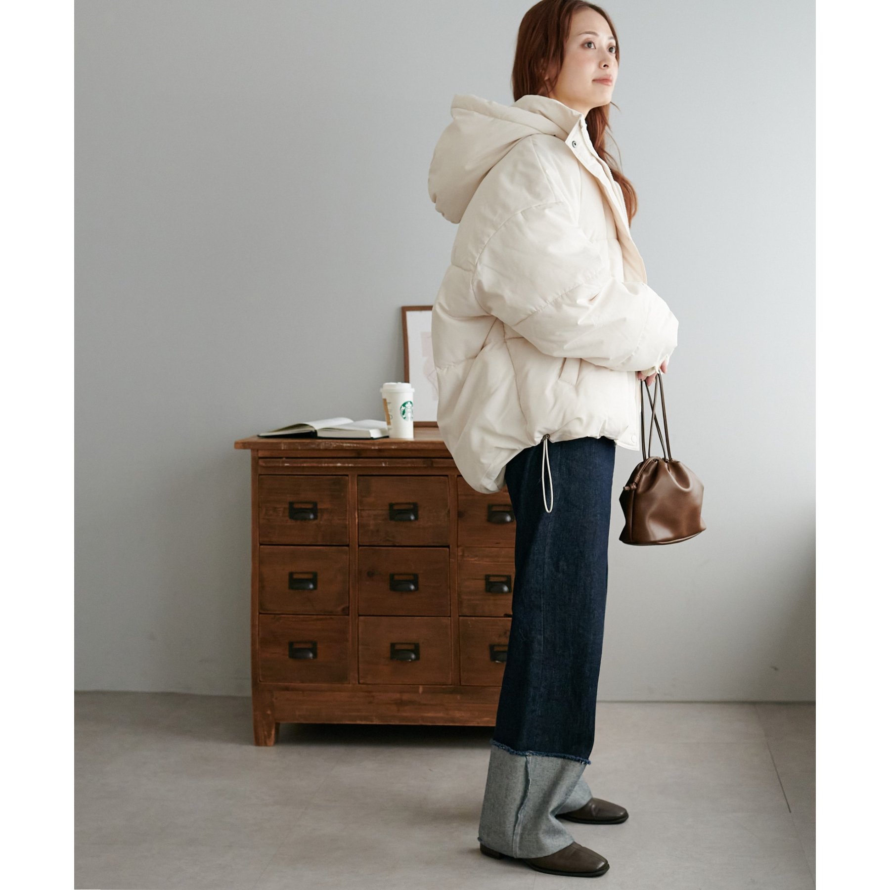 162cmスタッフ(Fサイズ着用): 中綿が入っており暖かくて軽い!着心地抜群です。ラウンドヘムデザインが柔らかな印象を与えます♩