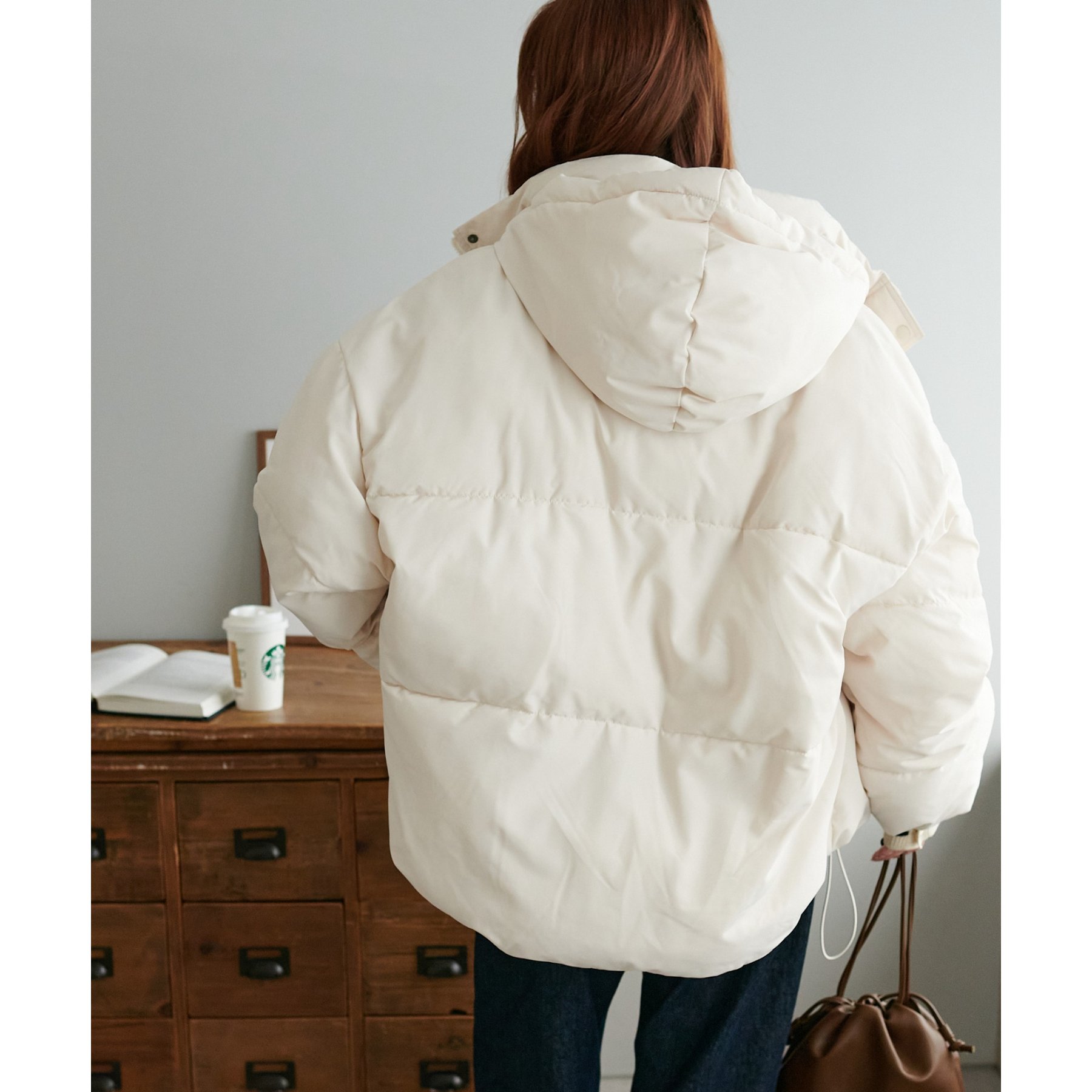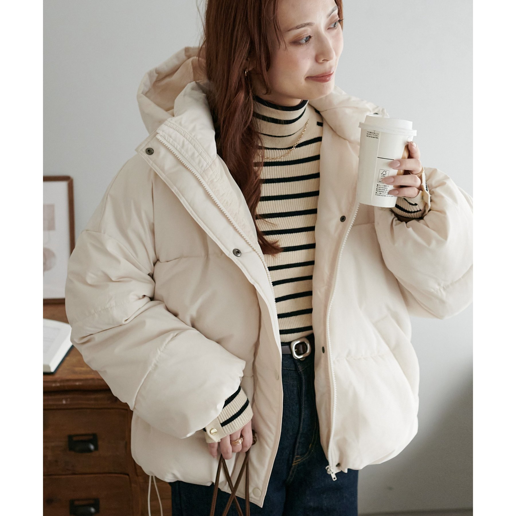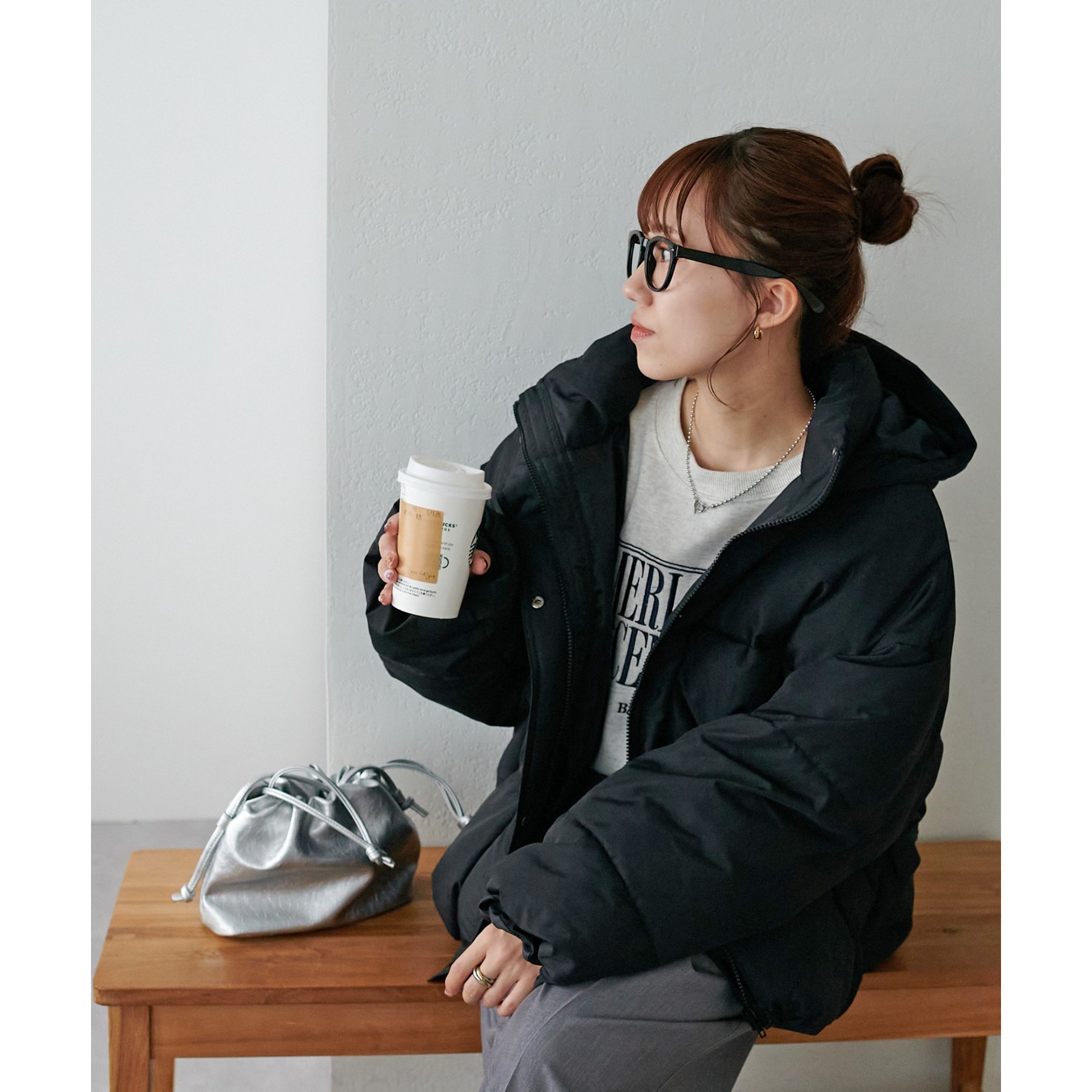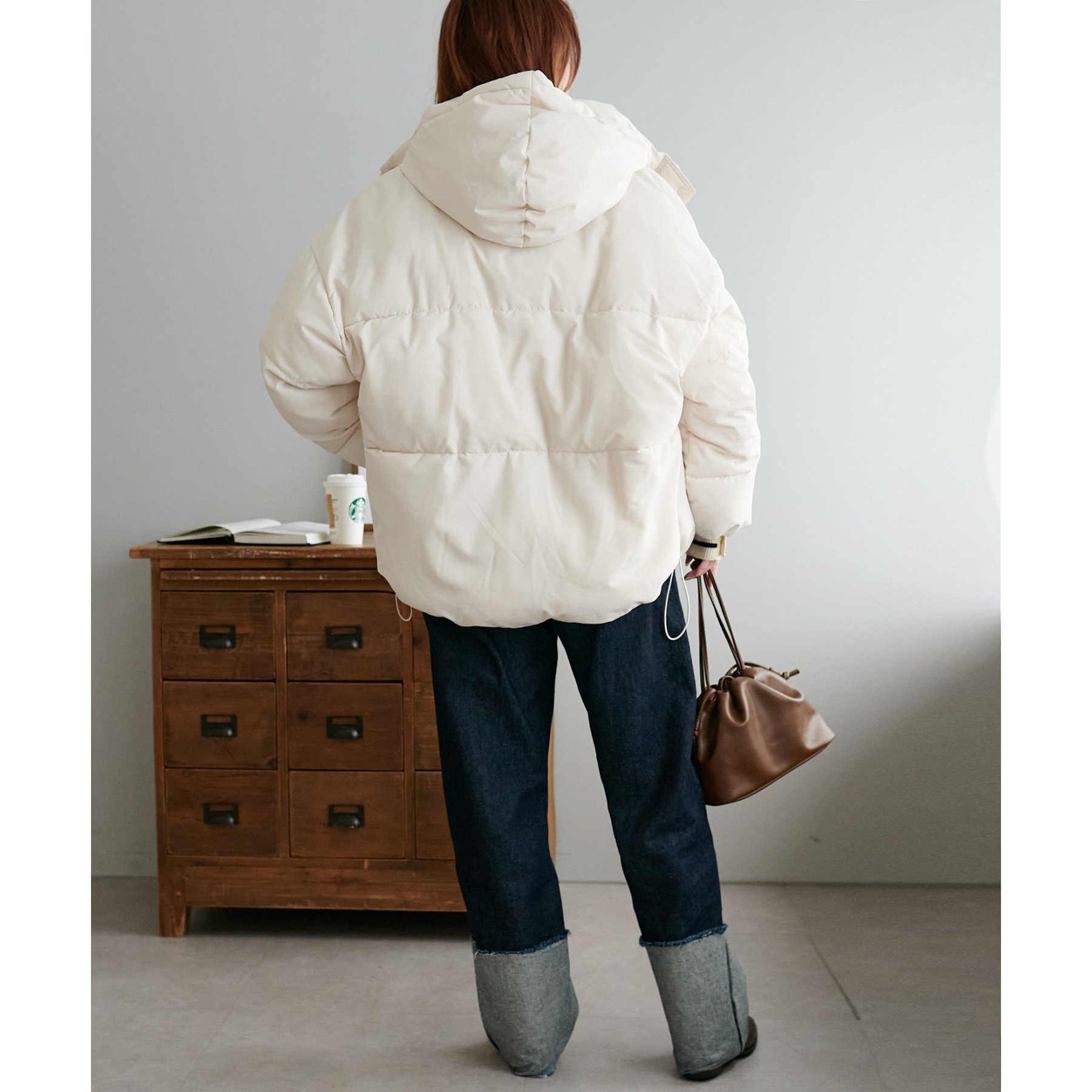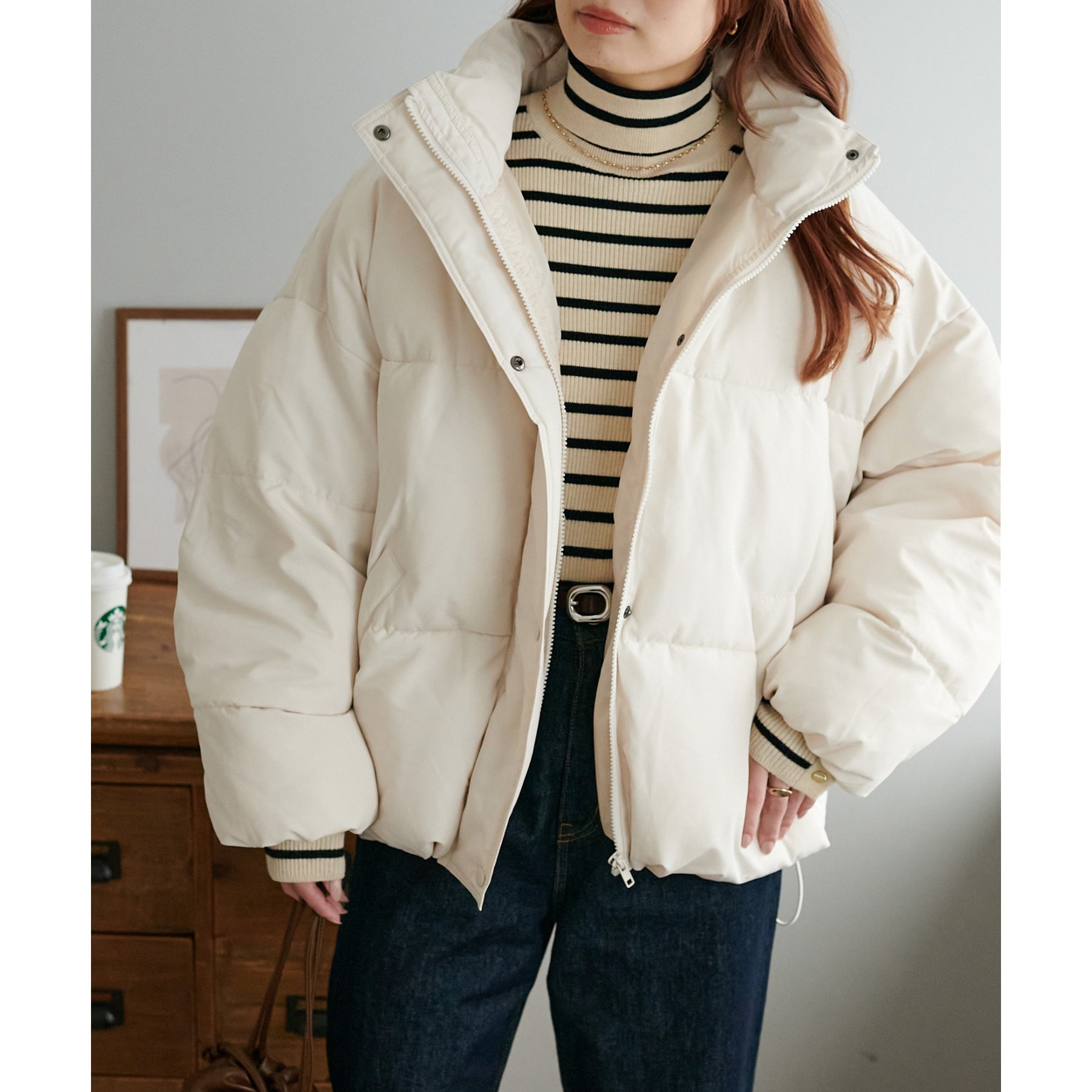 162cmスタッフ(Fサイズ着用): 中綿が入っており暖かくて軽い!着心地抜群です。ラウンドヘムデザインが柔らかな印象を与えます♩