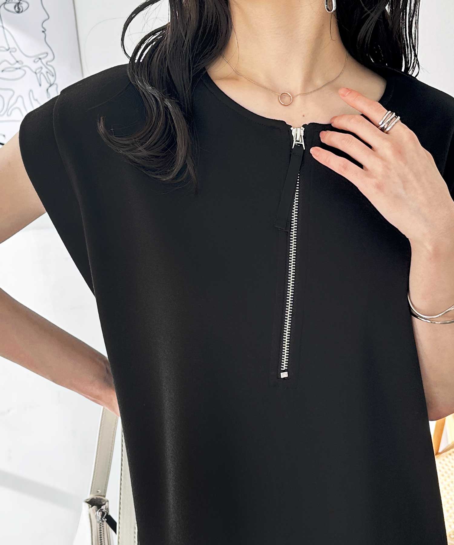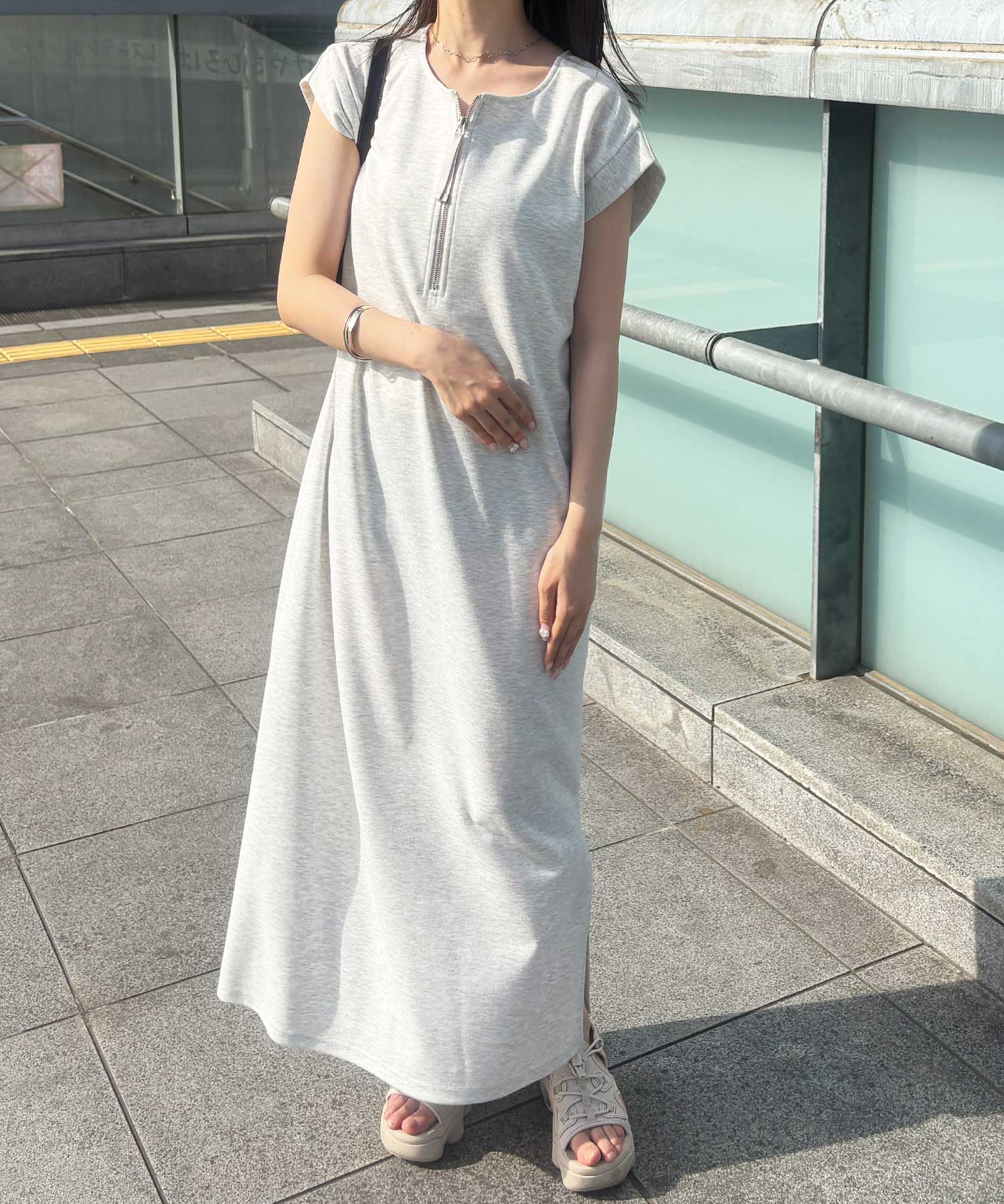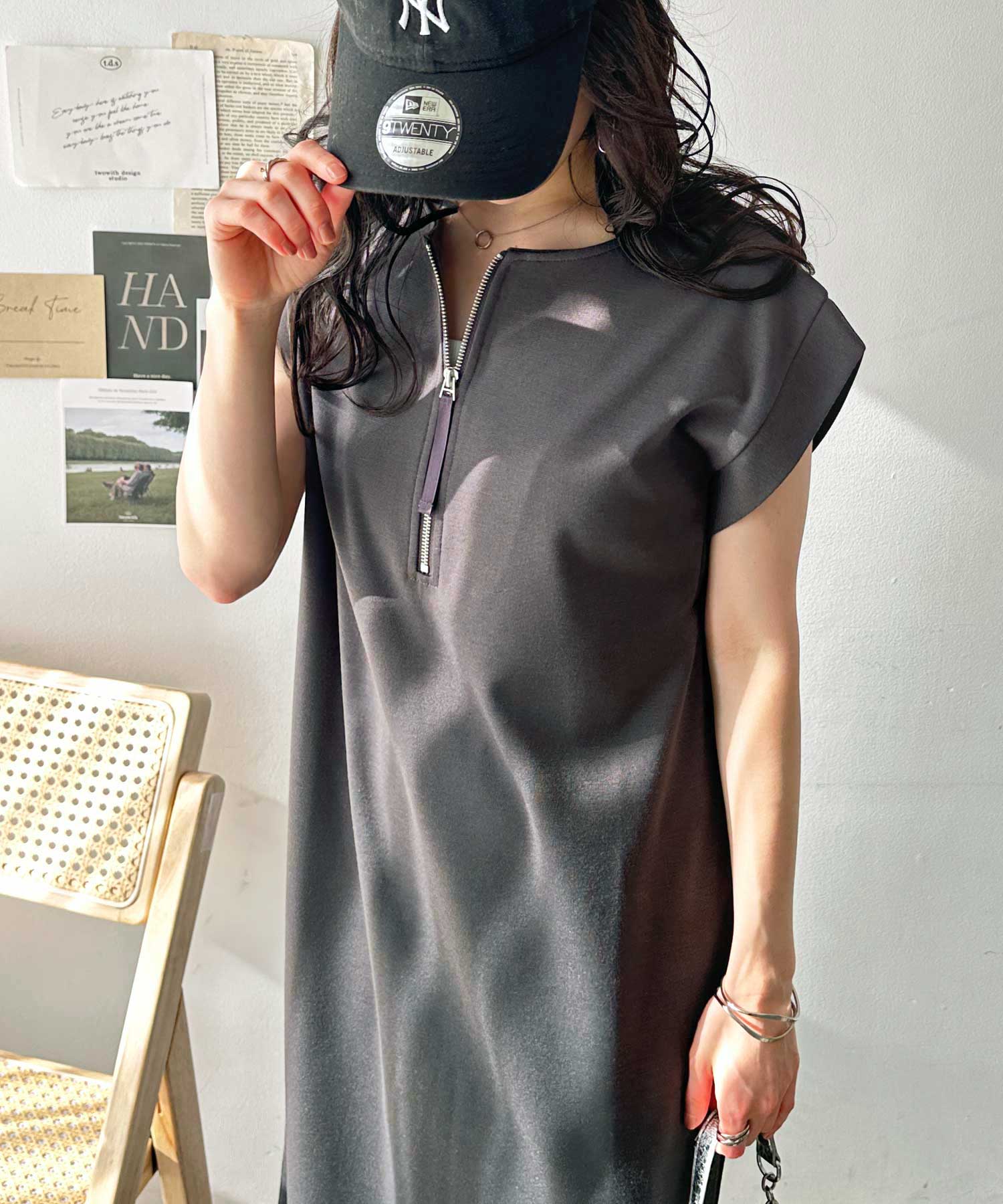 前後2WAYハーフジップフレンチ袖Iラインワンピース