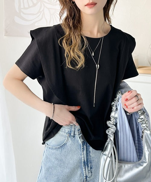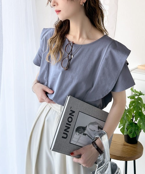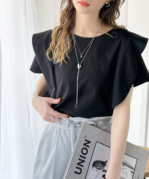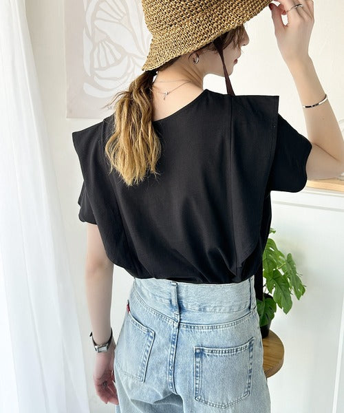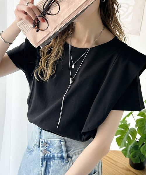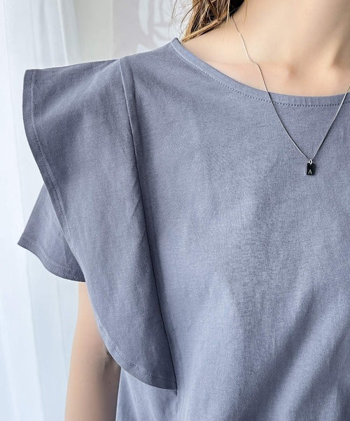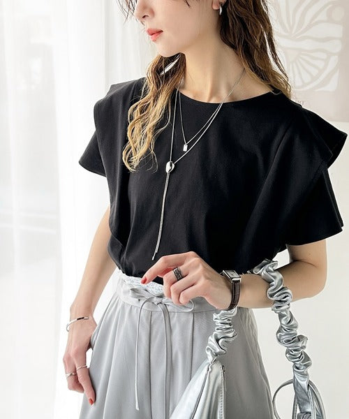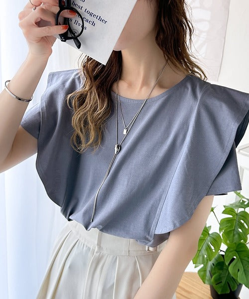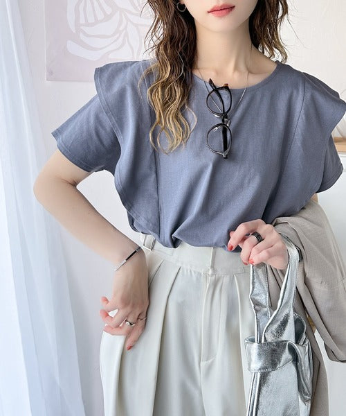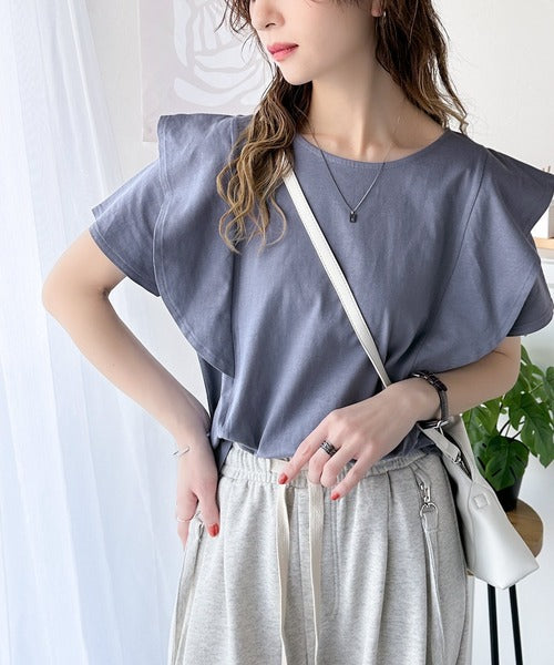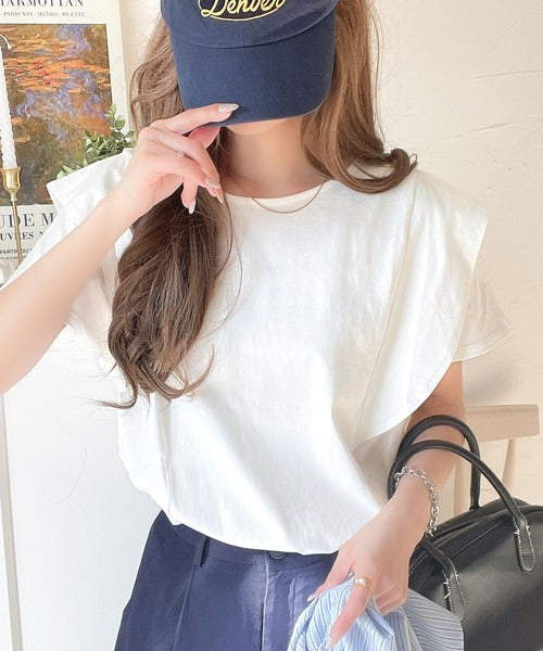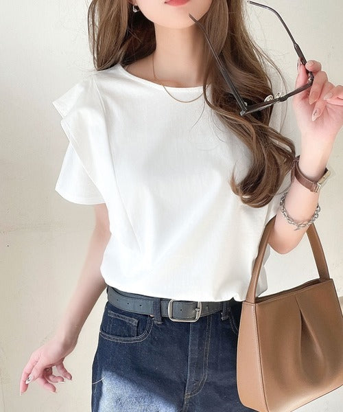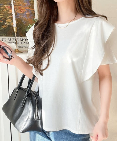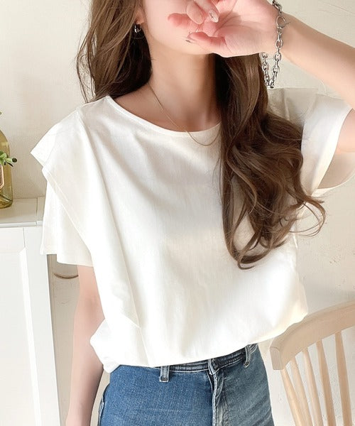 女性らしさ漂う、綿100%シルケット加工ラッフルショルダーTシャツ(半袖) ce1260380