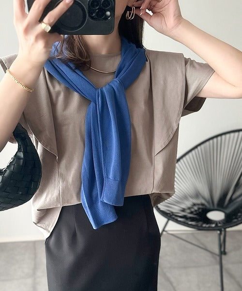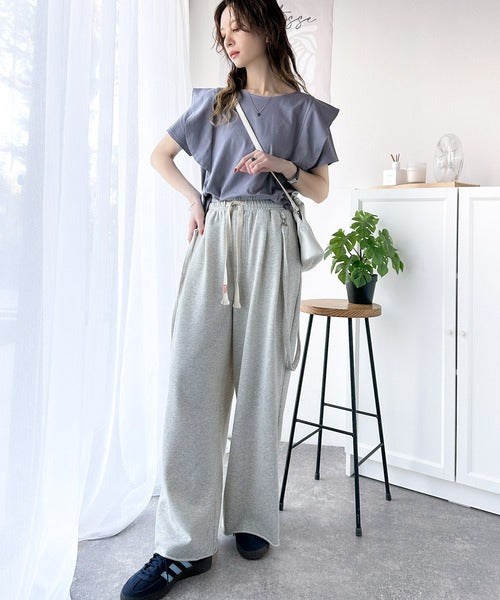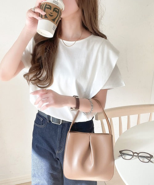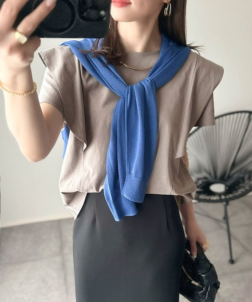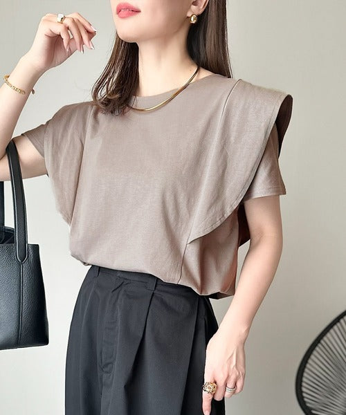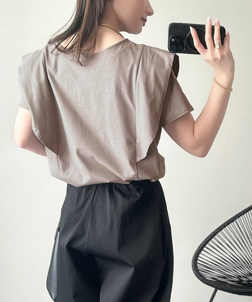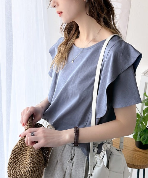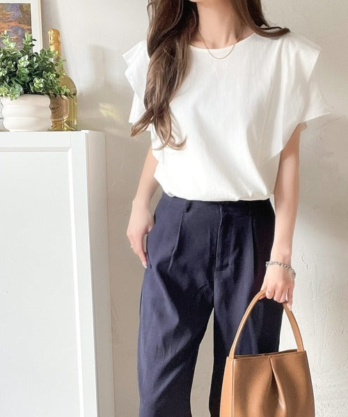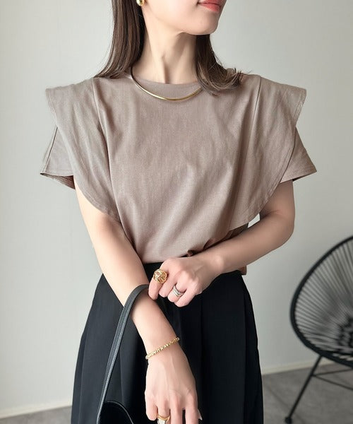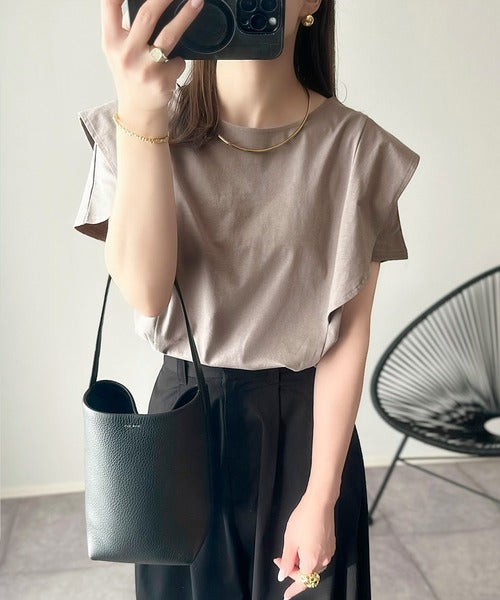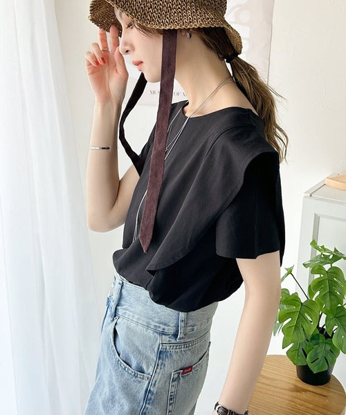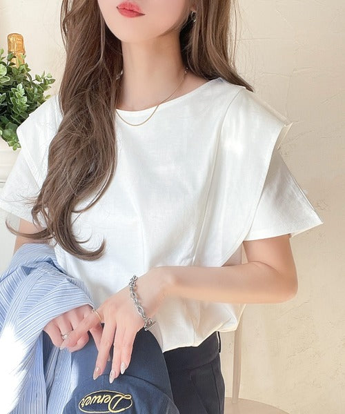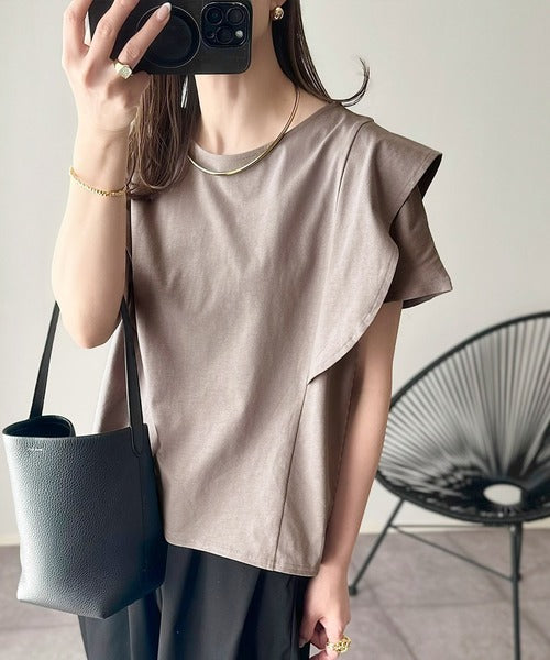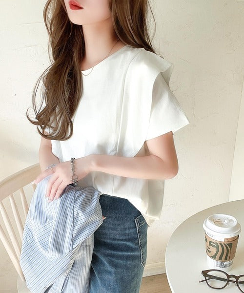 女性らしさ漂う、綿100%シルケット加工ラッフルショルダーTシャツ(半袖) ce1260380