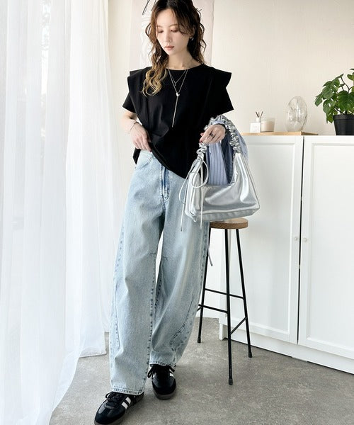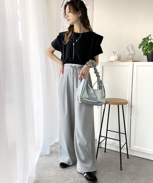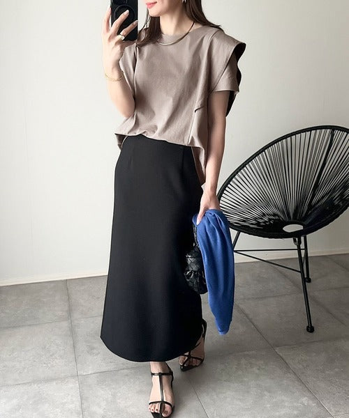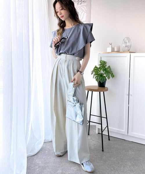 ラッフルショルダーが気になる二の腕をさり気なくカバーできるのも嬉しいポイント。