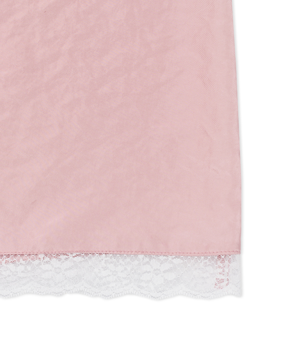 裾にあしらわれたレースディテールがさりげなく華奢なムードを引き立て、ほのかな光沢のサテン素材がフェミニンな印象を与えます。