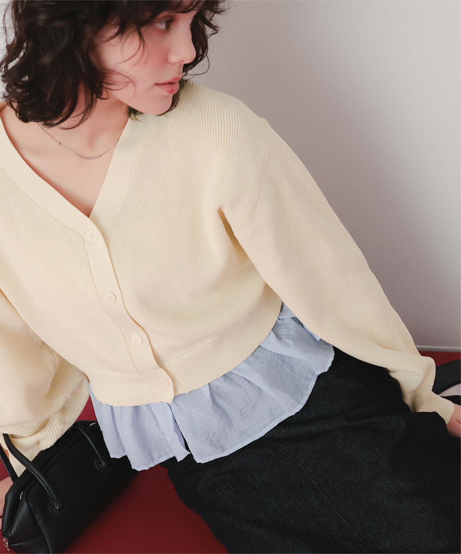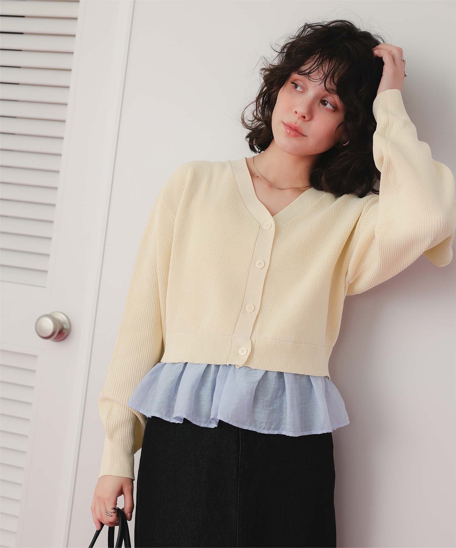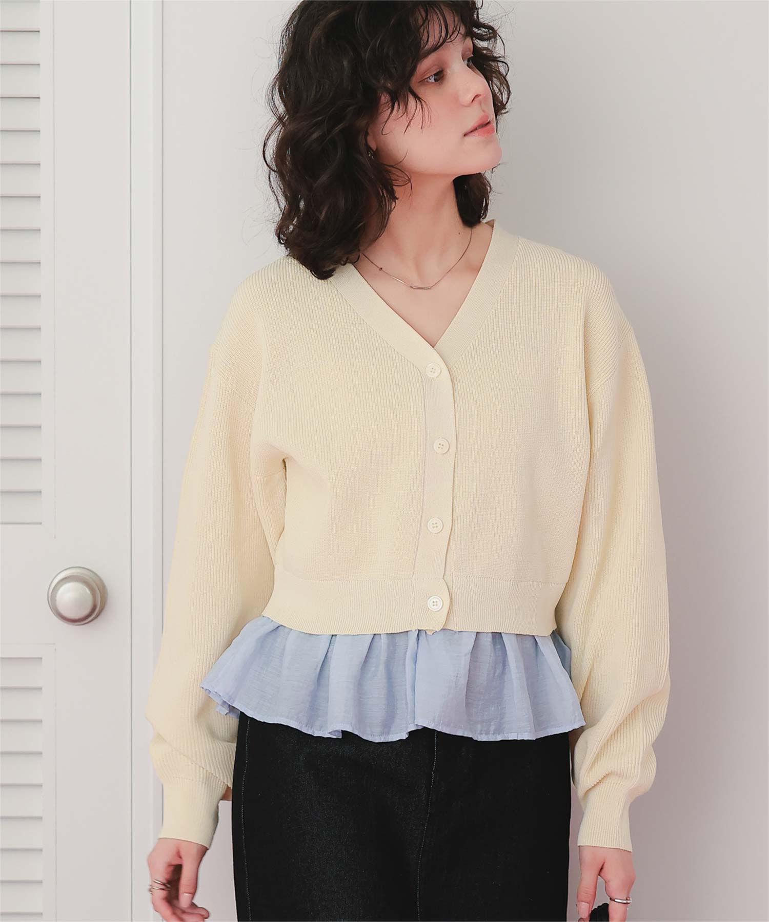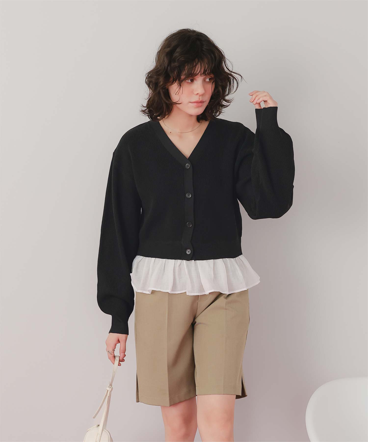 ・裾のふんわりドッキングフリルが、着こなしに上品な甘さを添える映えデザインカーディガン