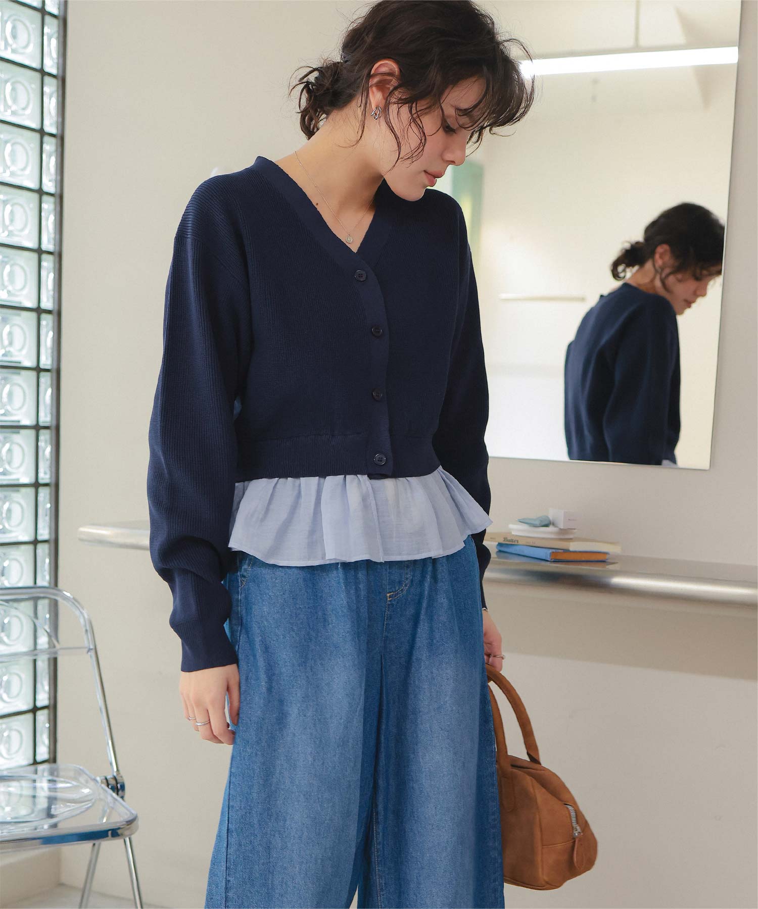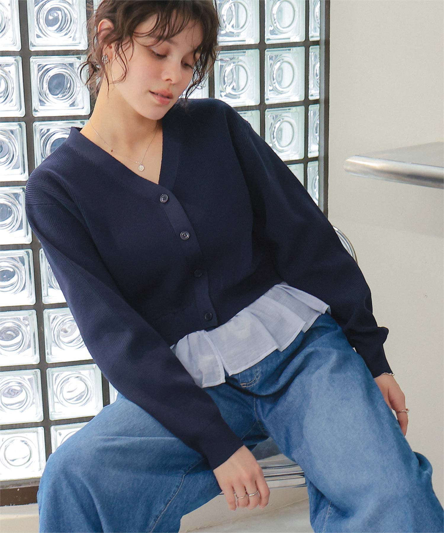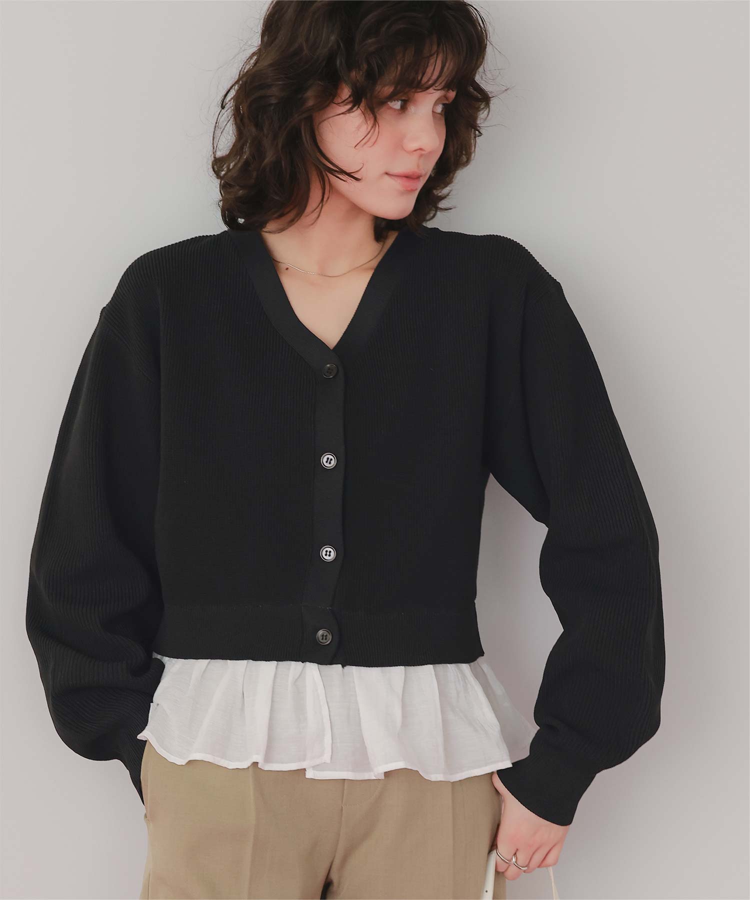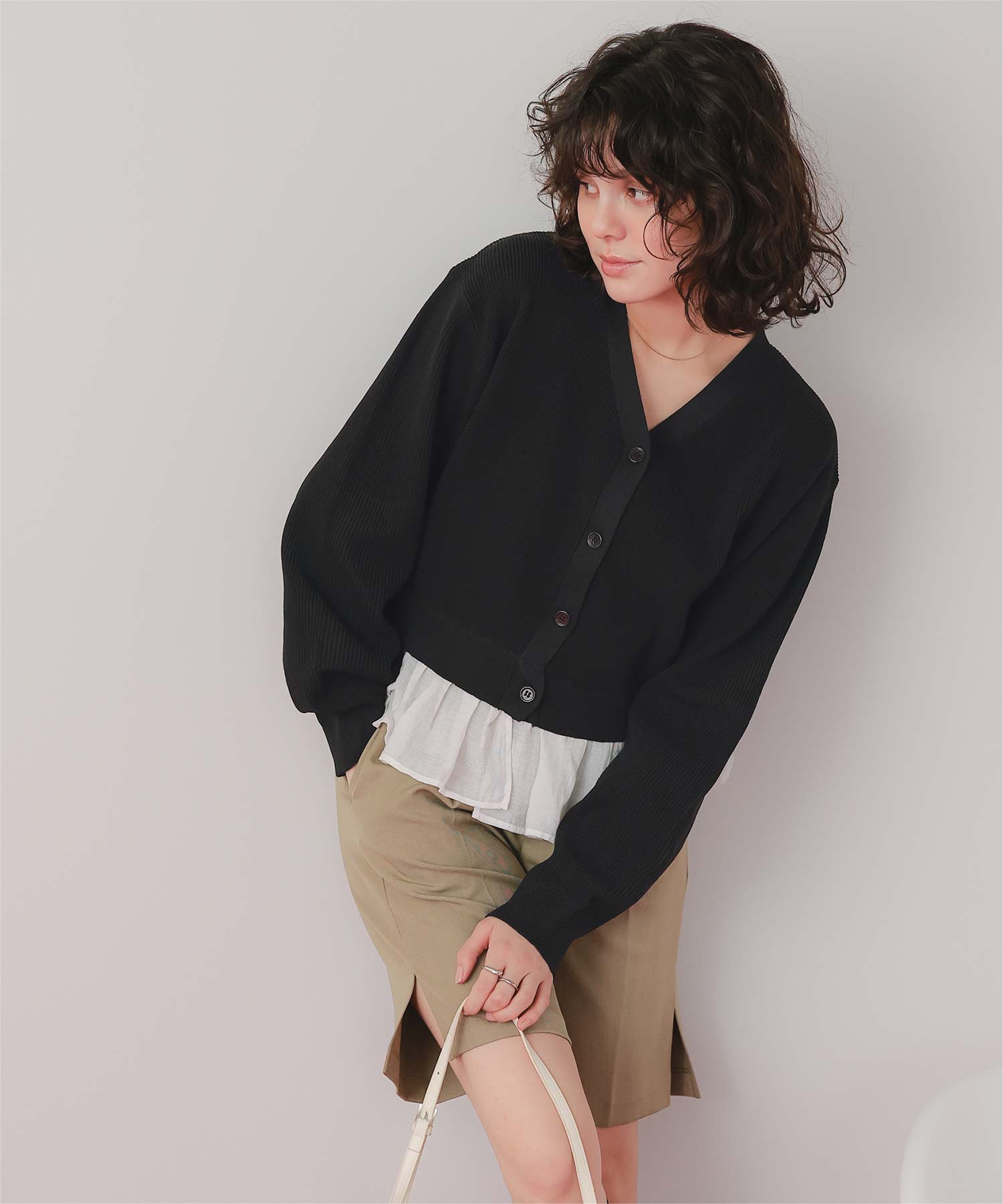 ・裾のふんわりドッキングフリルが、着こなしに上品な甘さを添える映えデザインカーディガン