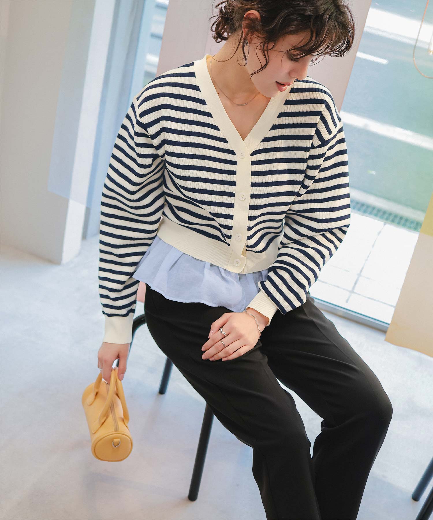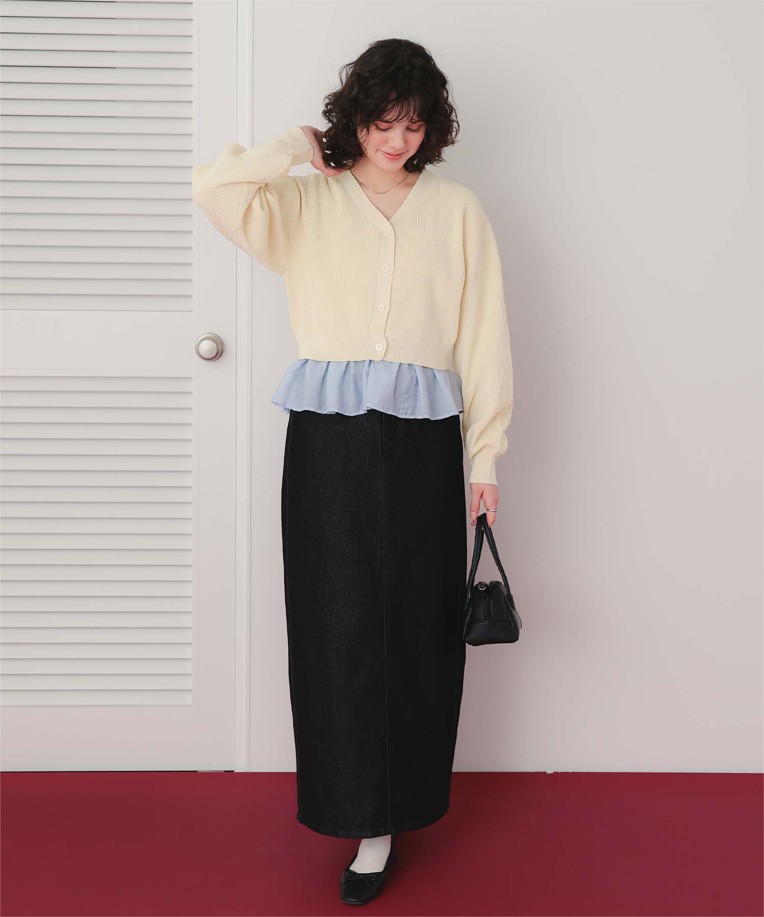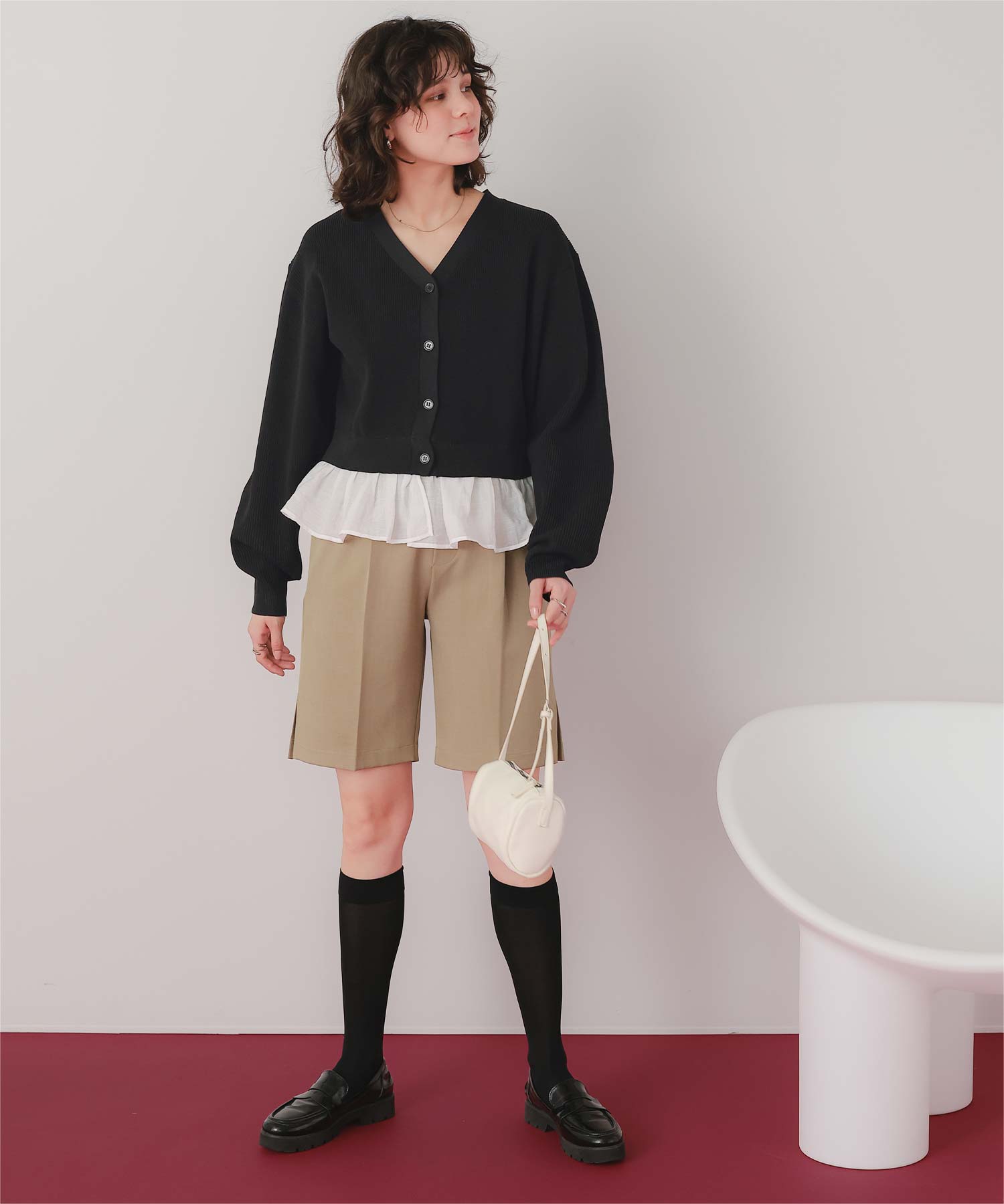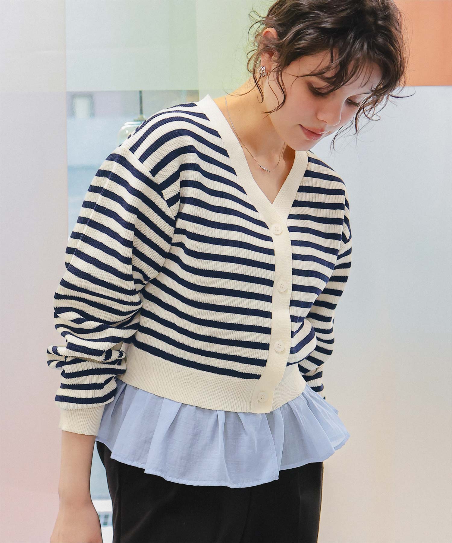 ・裾のふんわりドッキングフリルが、着こなしに上品な甘さを添える映えデザインカーディガン