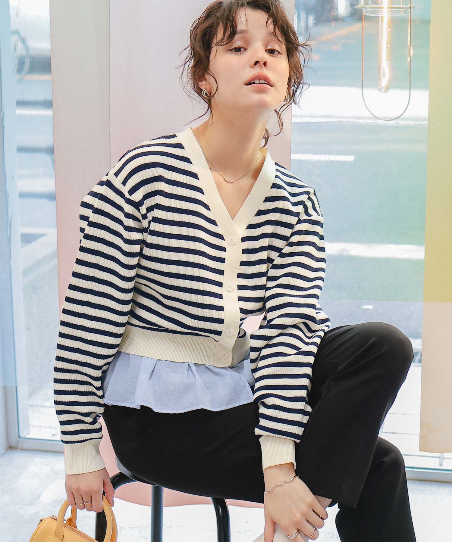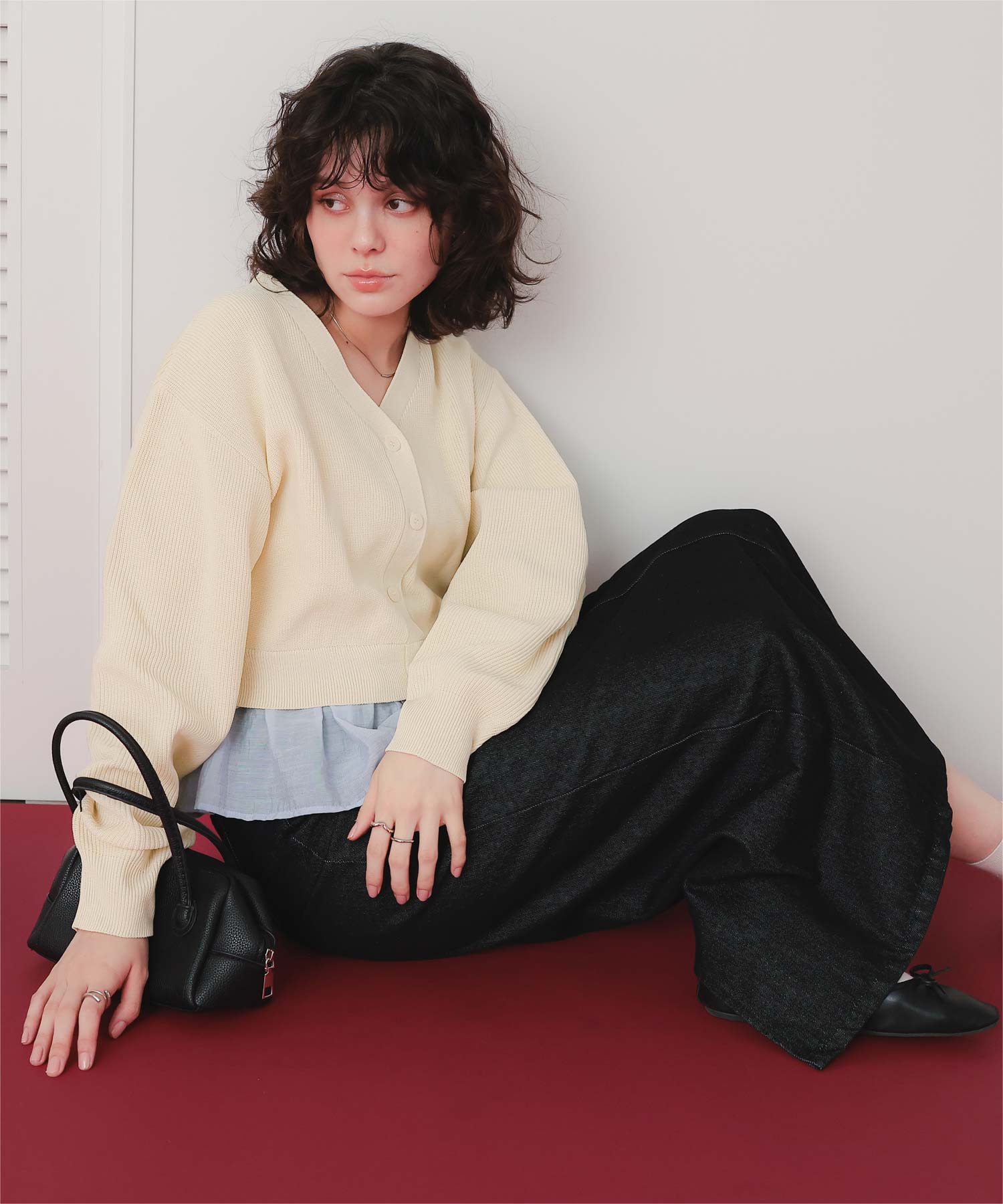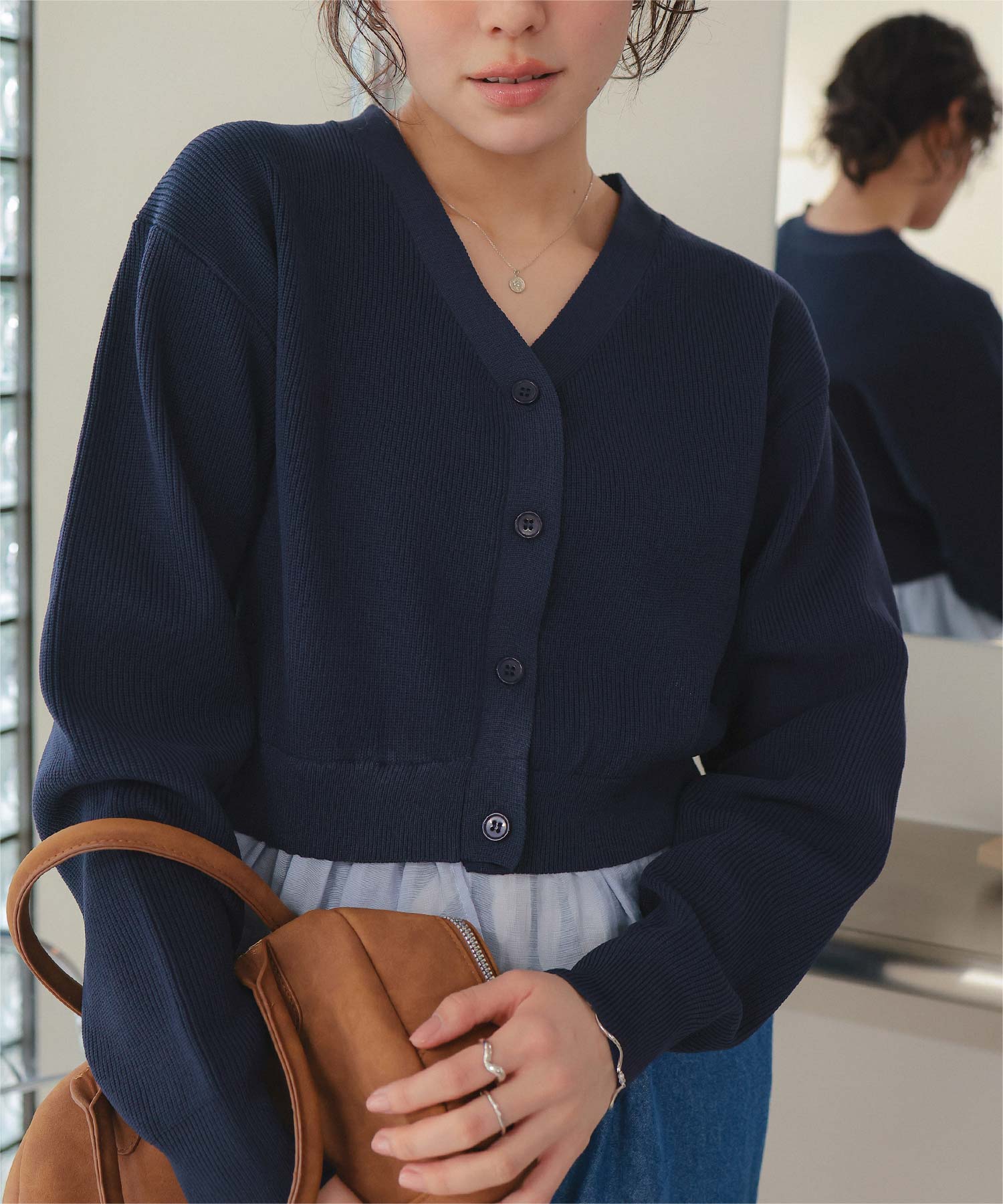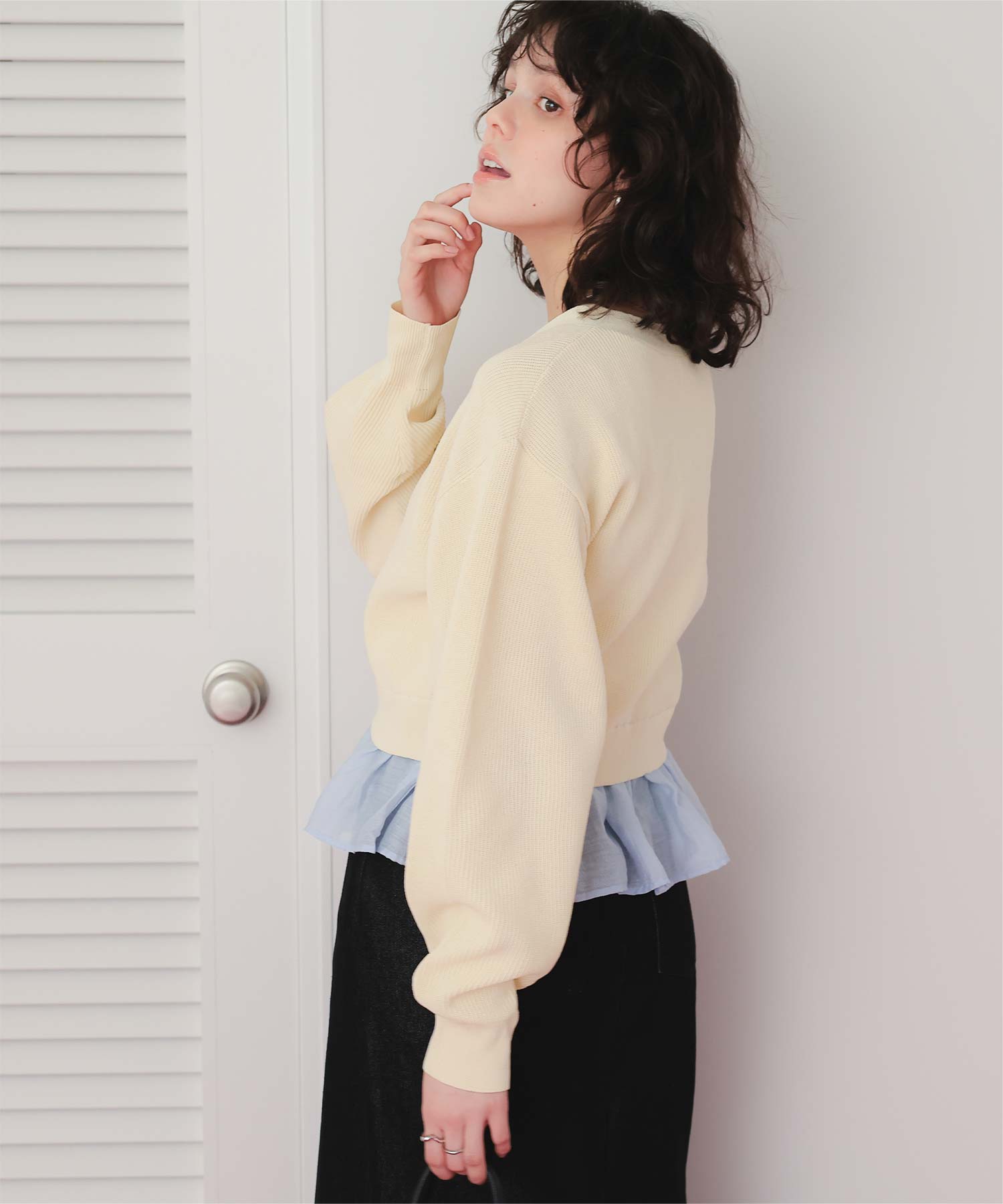 ・裾のふんわりドッキングフリルが、着こなしに上品な甘さを添える映えデザインカーディガン