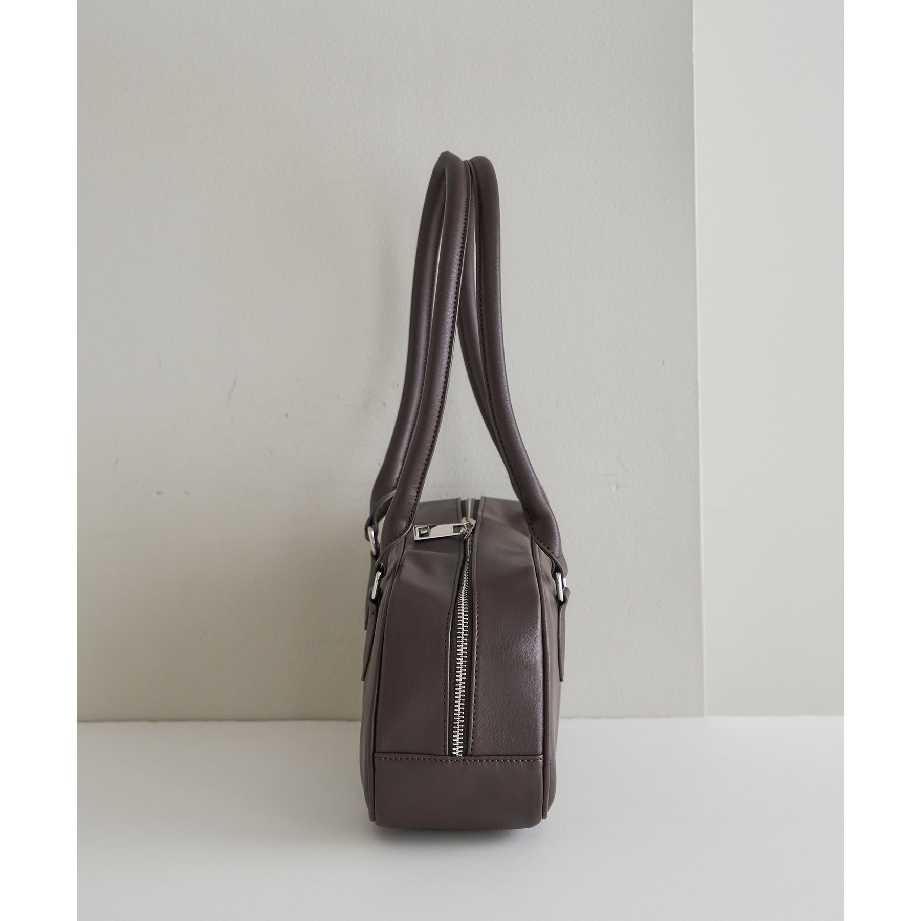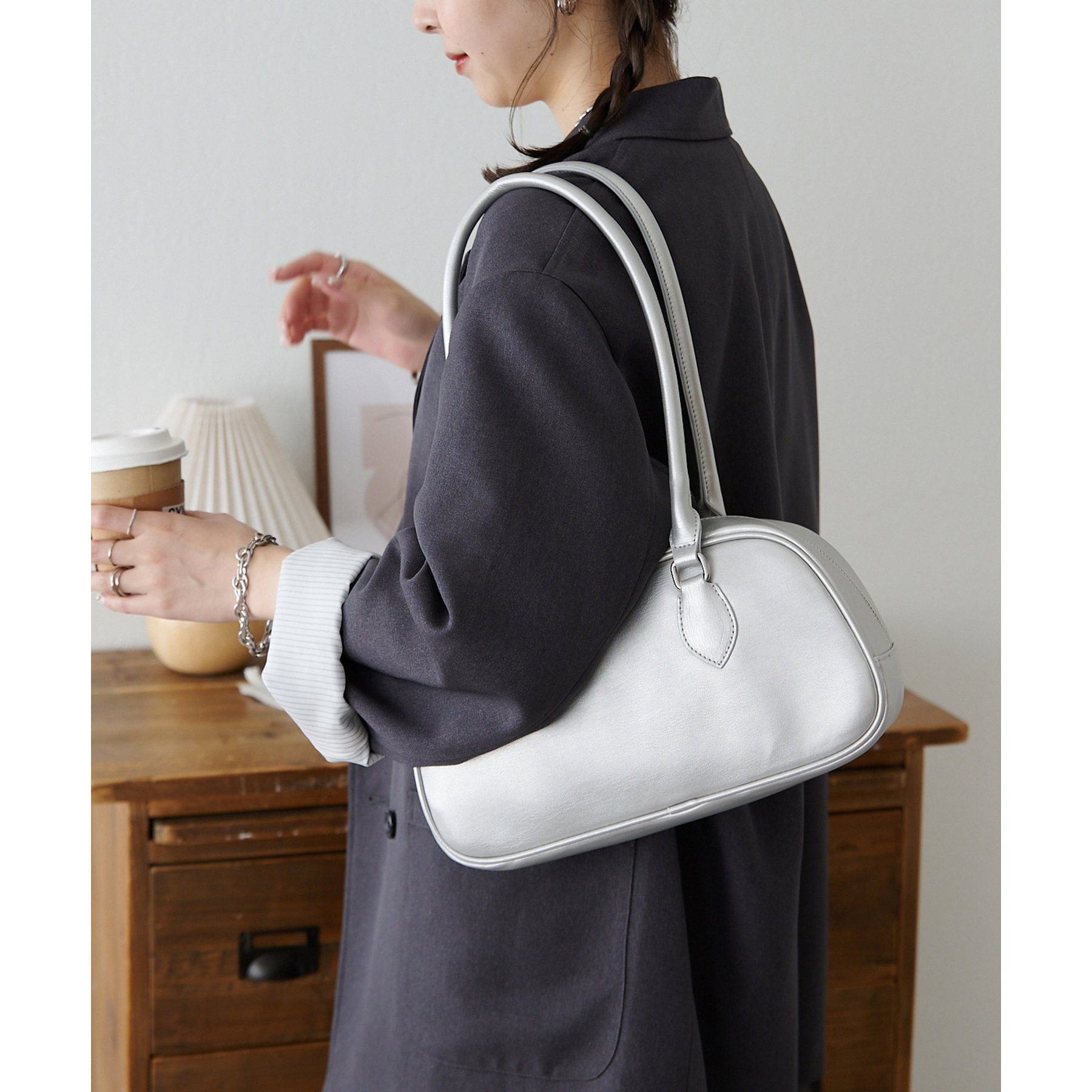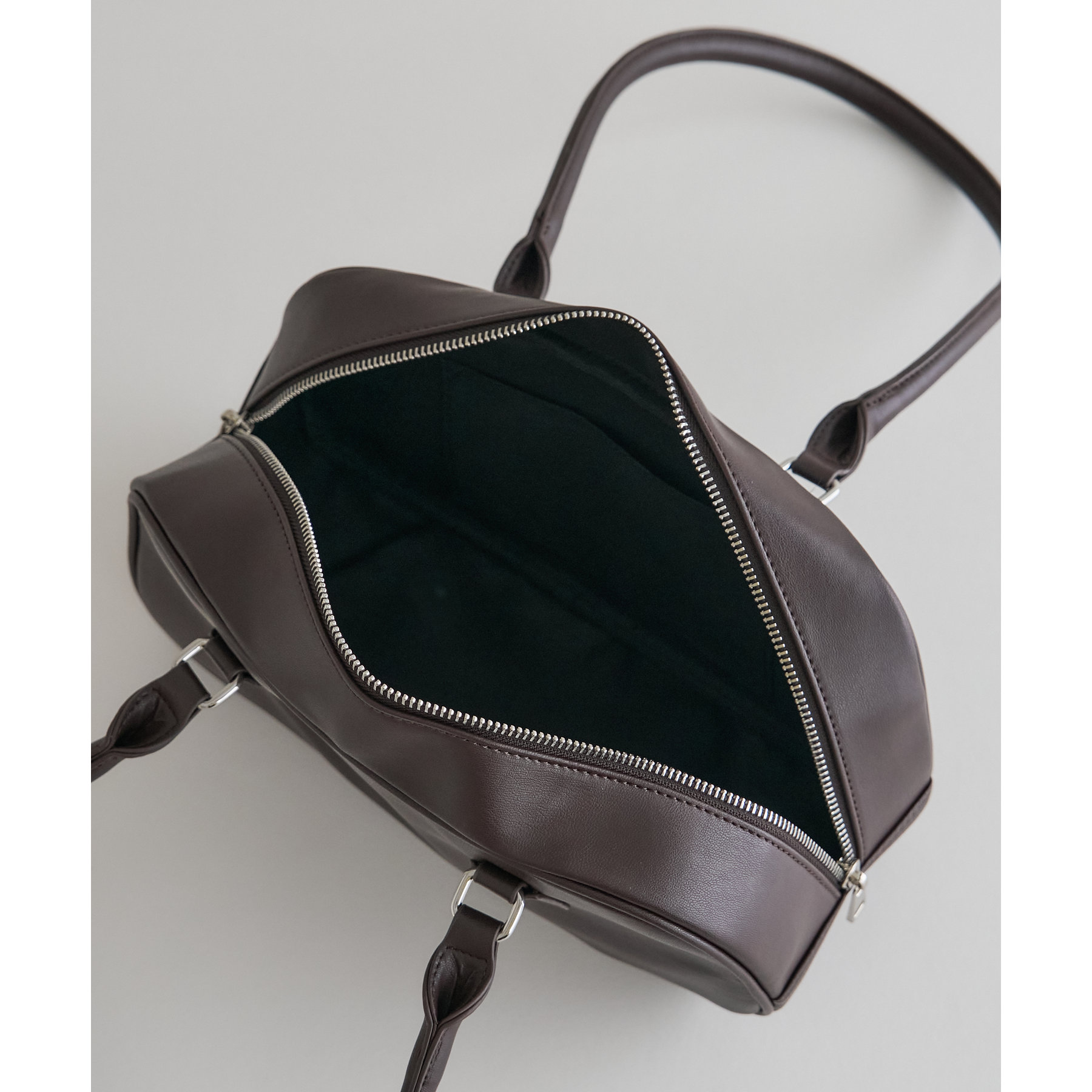 とにかくシンプルなデザインに仕上げたことで、系統や年齢関係なく使いやすいボストンバッグです。ポイントのロングハンドルは、厚手のスウェットやアウター着用時でも肩掛けしやすいように長さを調整しています。また、開口部が大きく開く為、物の出し入れもしやすいです。さらに、マチが10㎝と、自立してくれるのも嬉しいポイントです。横長なデザインなので長財布・折りたたみ傘・500mlペットボトルのども楽々収納できます◎カラー展開は、定番のブラック・ブラウンに加え、コーデのポイントになるシルバー・キャメルの4色展開です。
