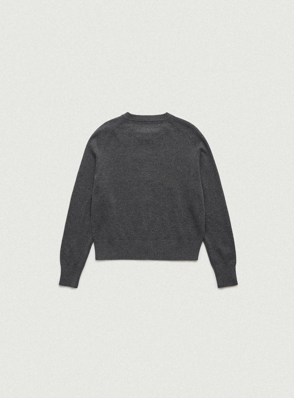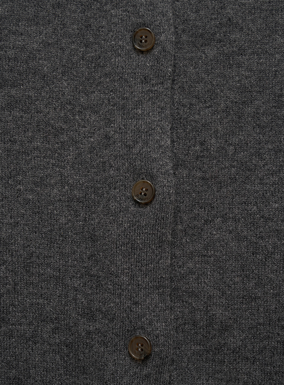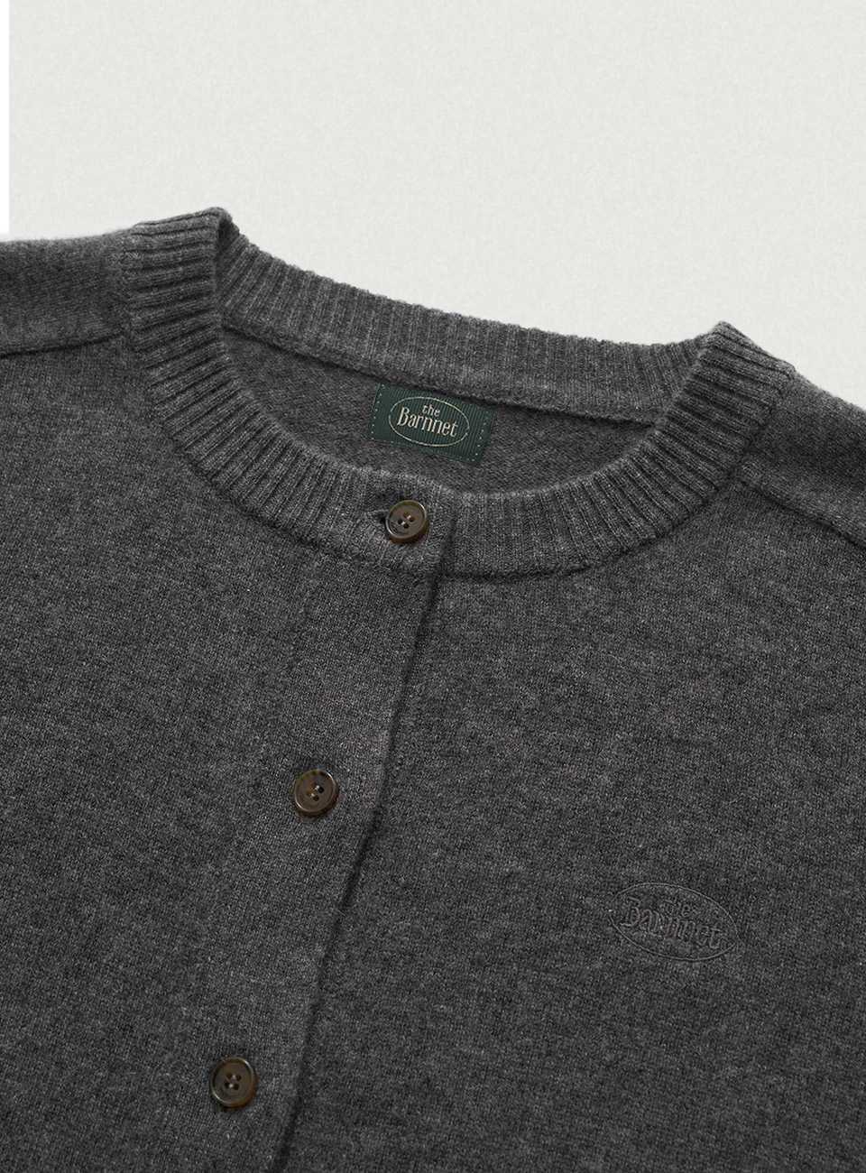 シングルブレスト仕様とラウンドネック、ボタン留めのニットカーディガンタイプ