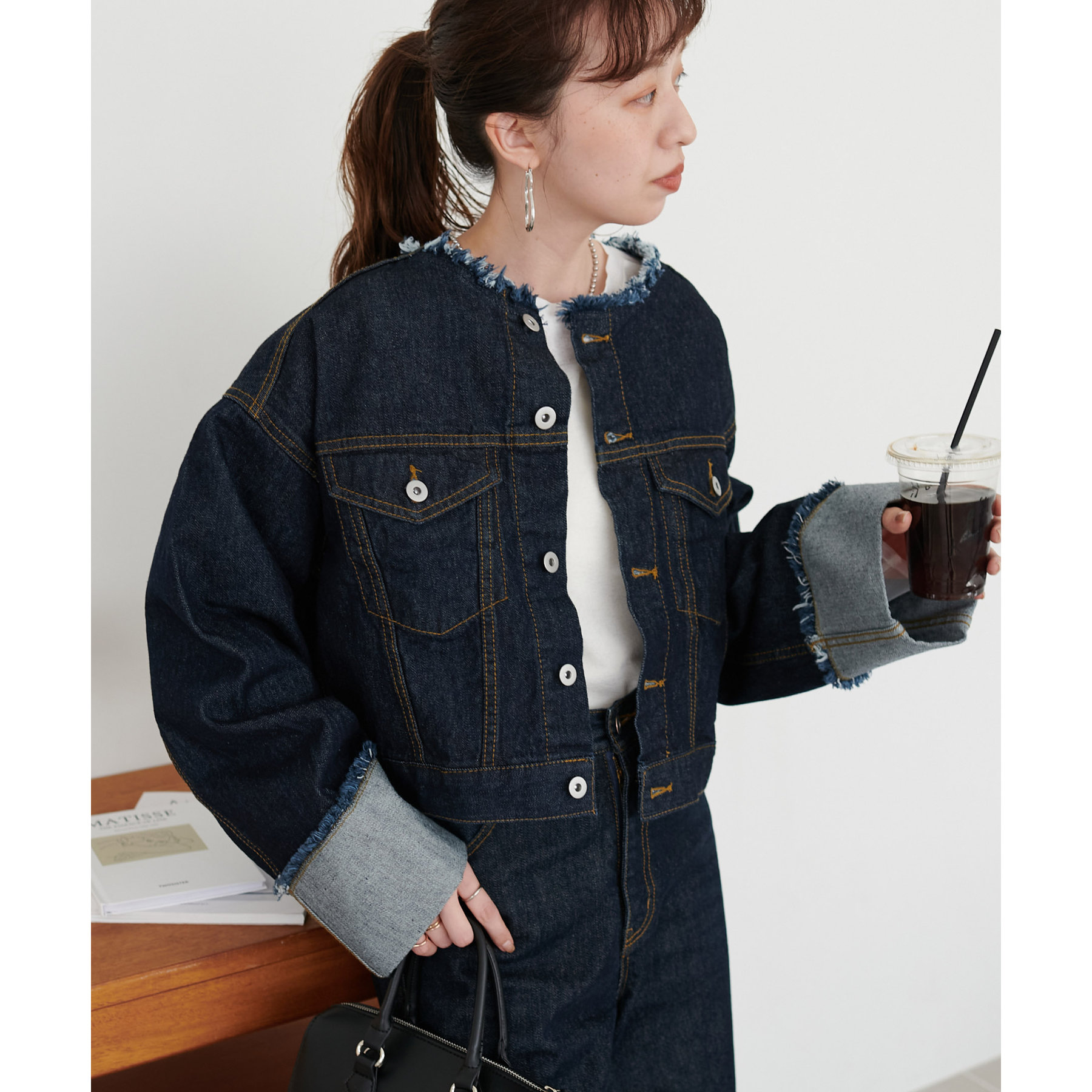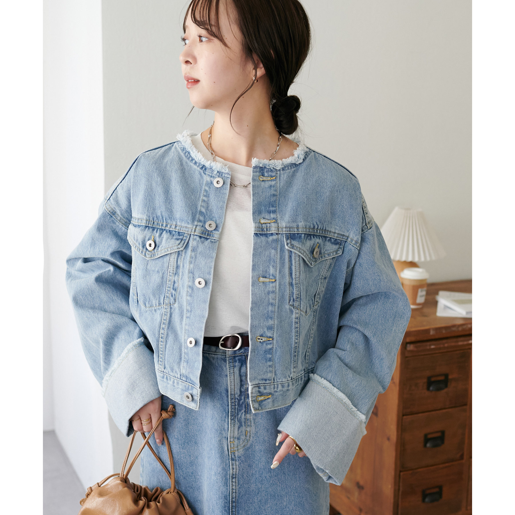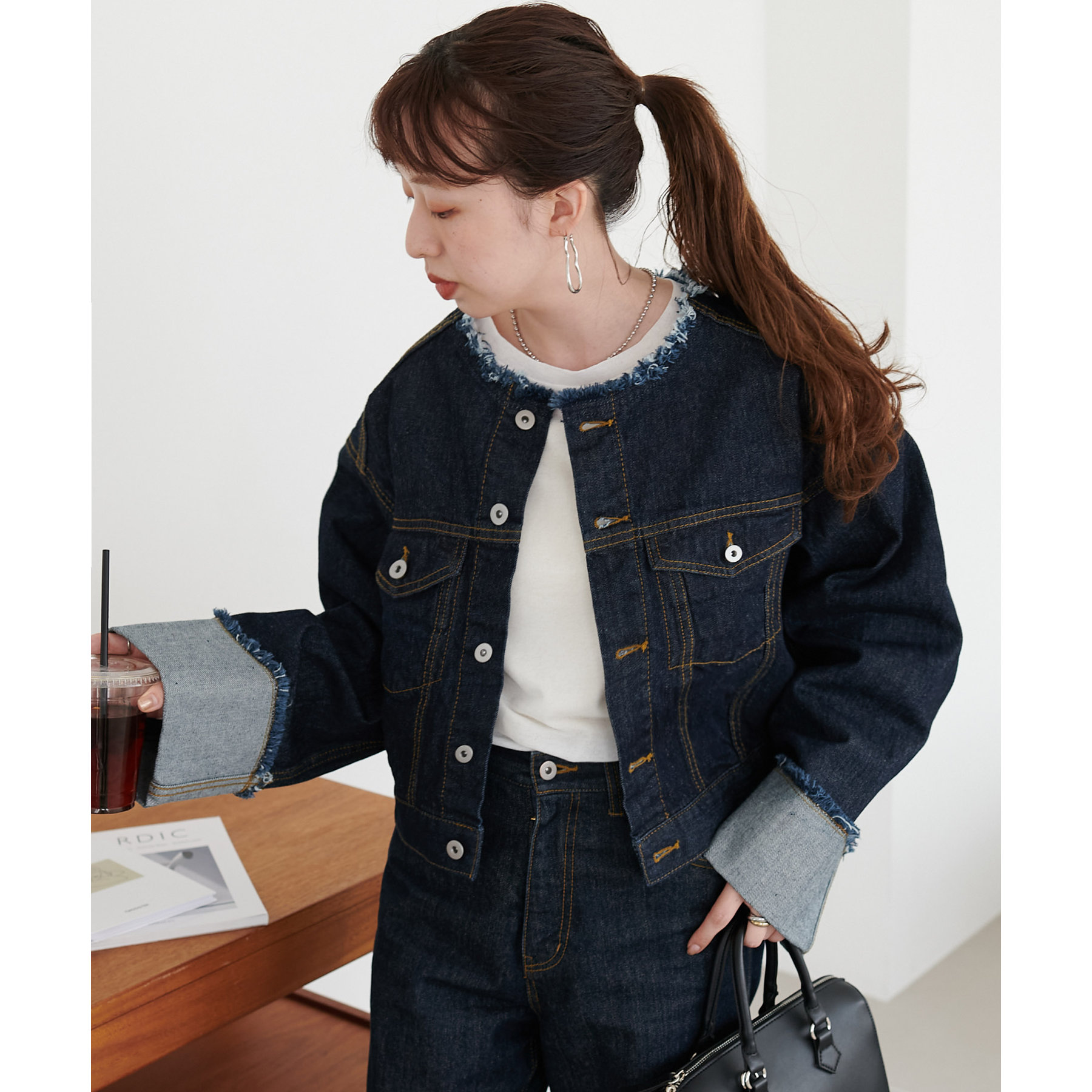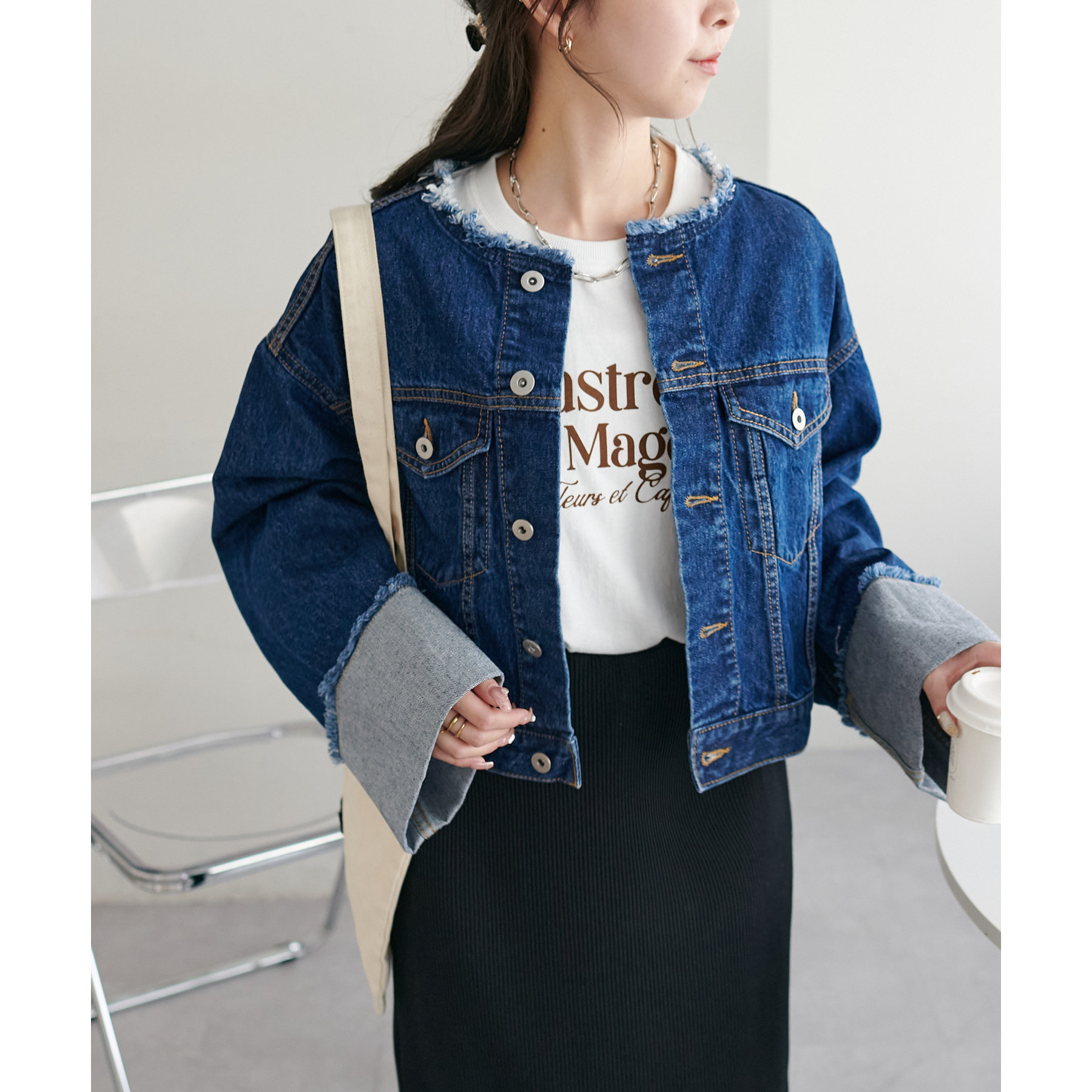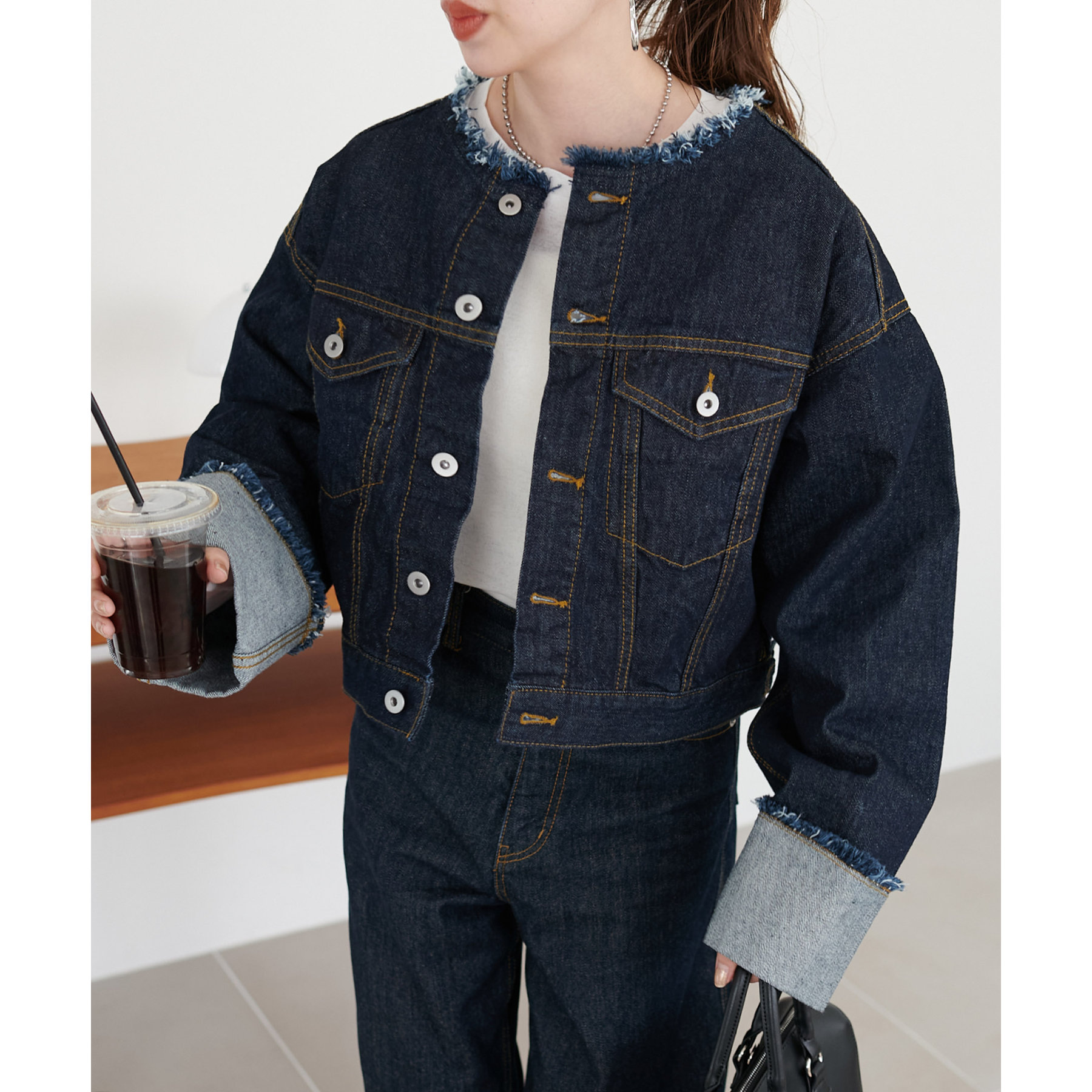 程よくゆとりのある身幅でありながら、クロップド丈でメリハリのあるデニムジャケット。手元はトレンドのロールアップデザインで、ワンランクおしゃれ見えを叶えてくれます!首元にはフリンジが施され、華やかな印象に○さらにノーカラーなデザインなので、インナーのネックデザインも選ばず着回しを楽しめるアイテムです!裾に施されたボタンでサイズ感を調整でき、シルエットの変化も楽しめます♪