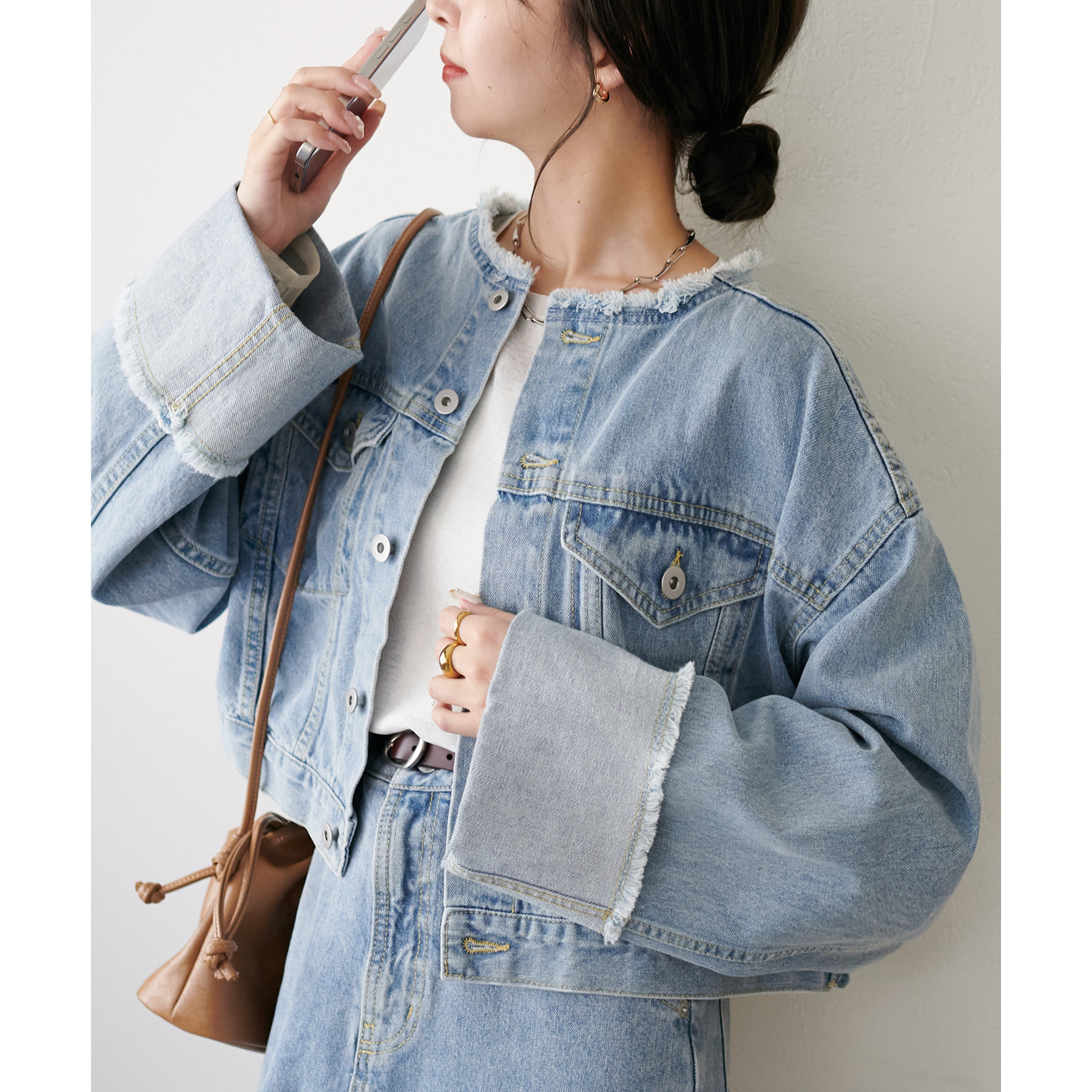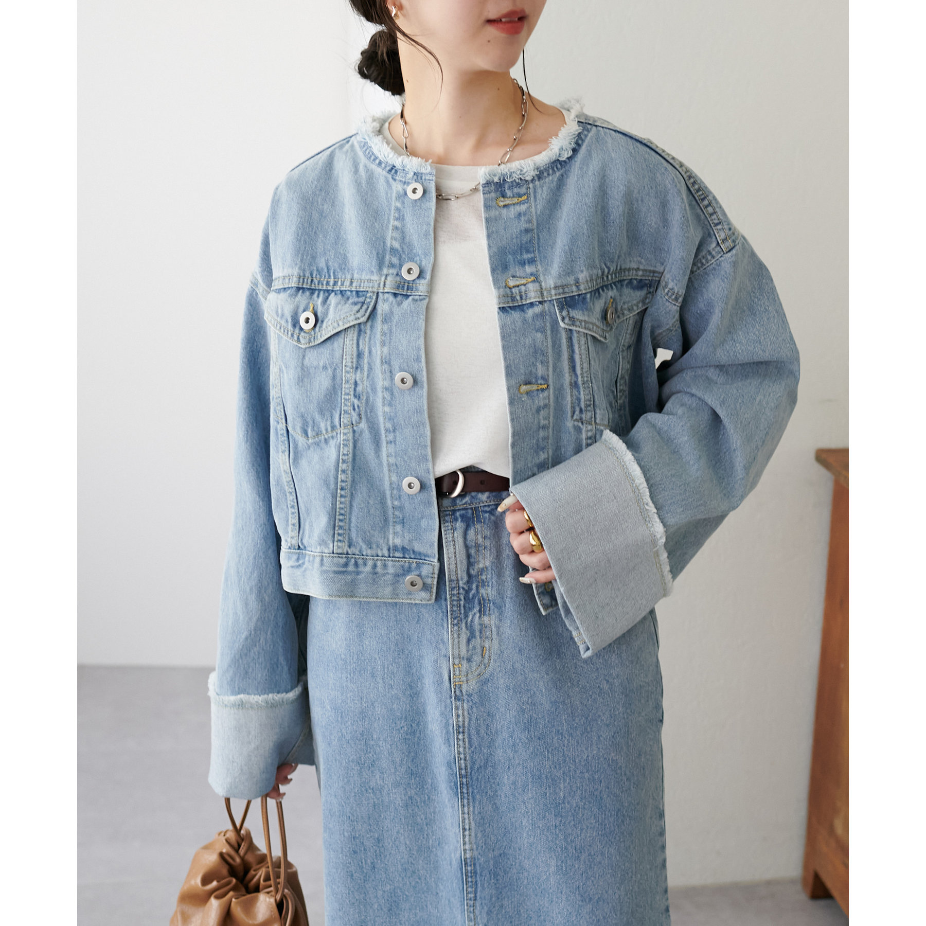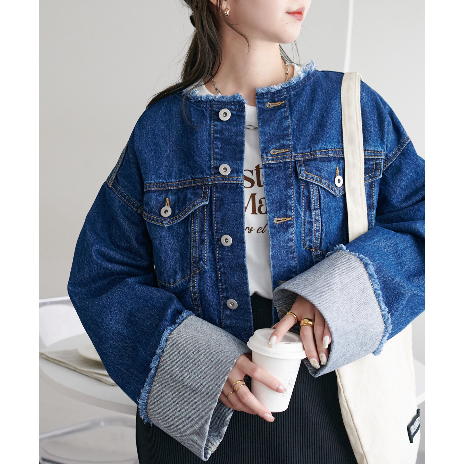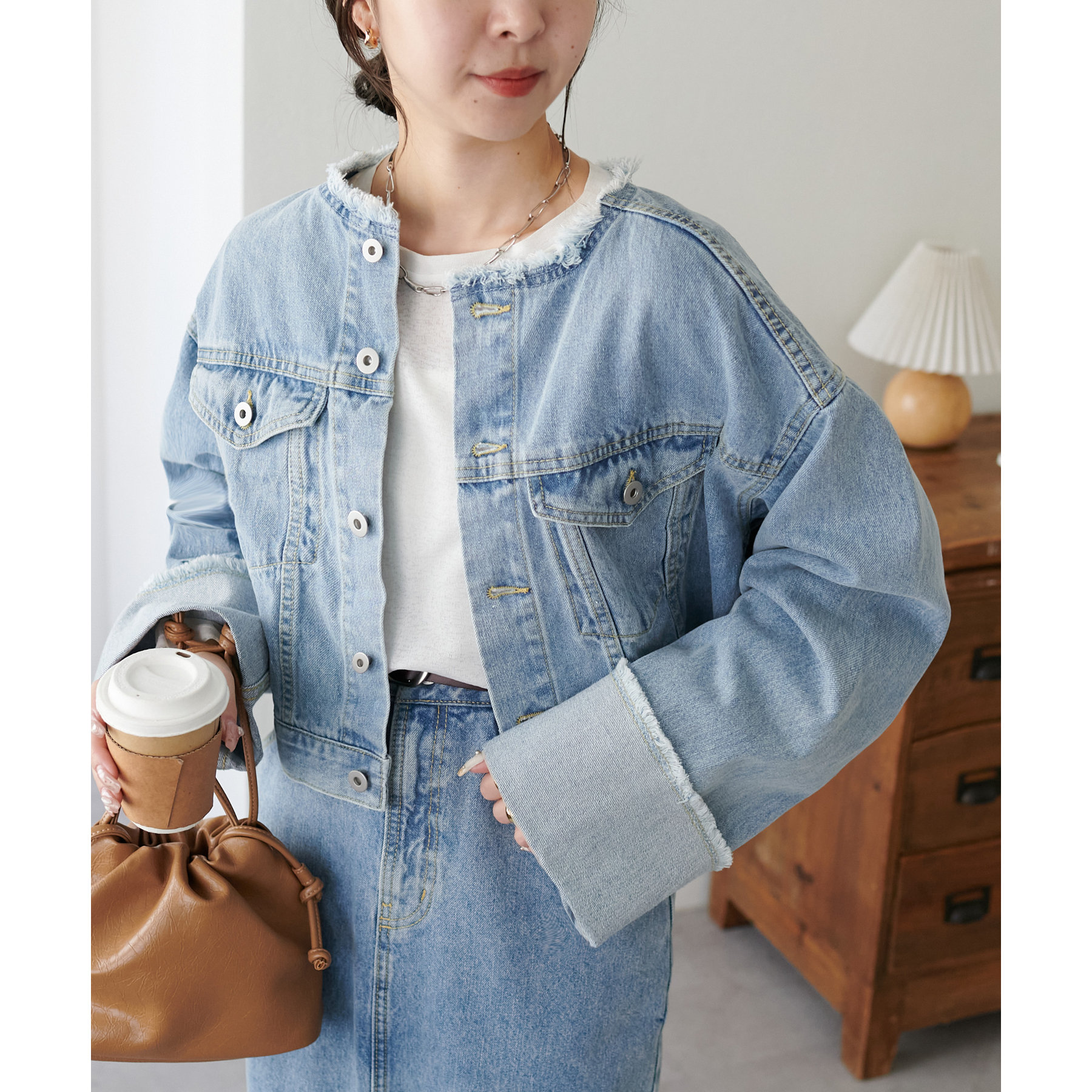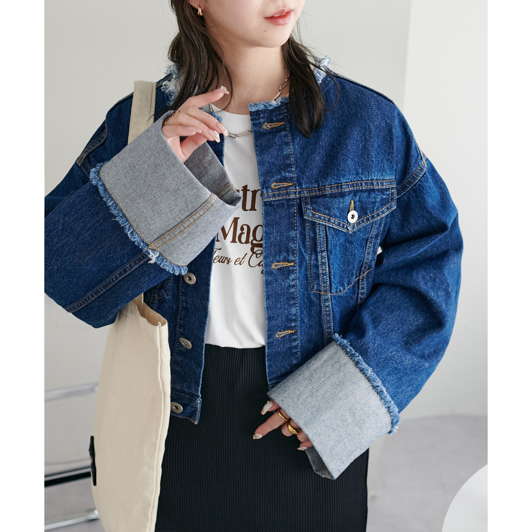 程よくゆとりのある身幅でありながら、クロップド丈でメリハリのあるデニムジャケット。手元はトレンドのロールアップデザインで、ワンランクおしゃれ見えを叶えてくれます!首元にはフリンジが施され、華やかな印象に○さらにノーカラーなデザインなので、インナーのネックデザインも選ばず着回しを楽しめるアイテムです!裾に施されたボタンでサイズ感を調整でき、シルエットの変化も楽しめます♪